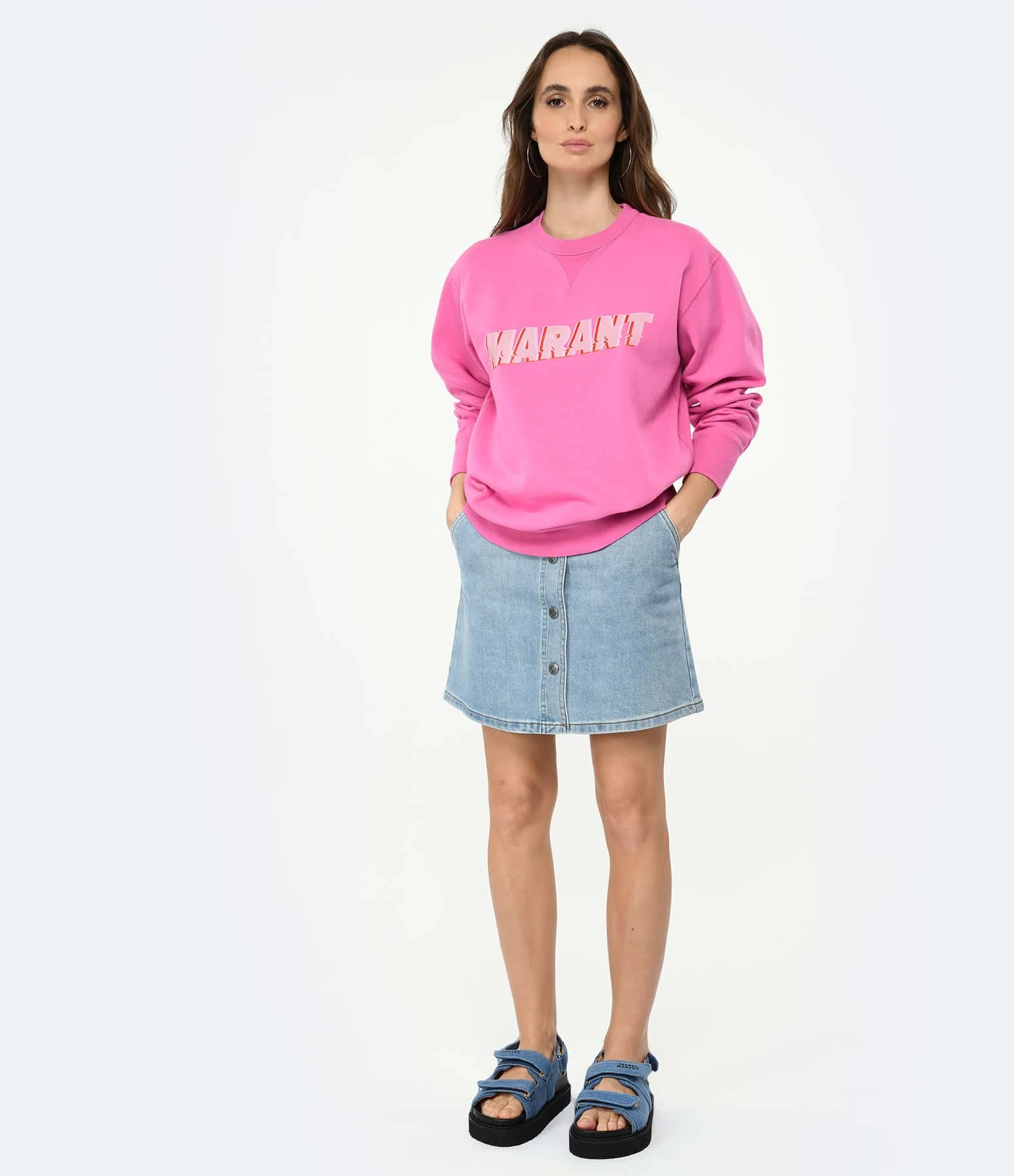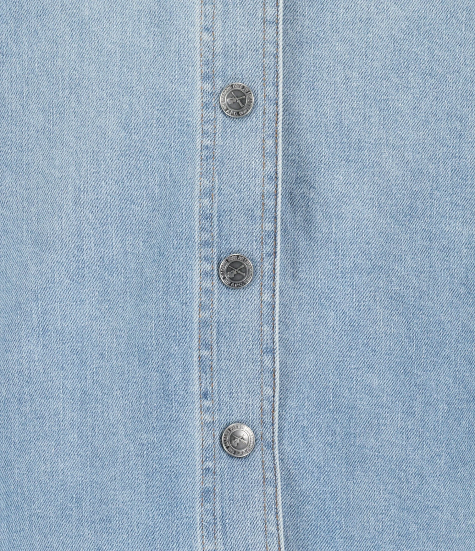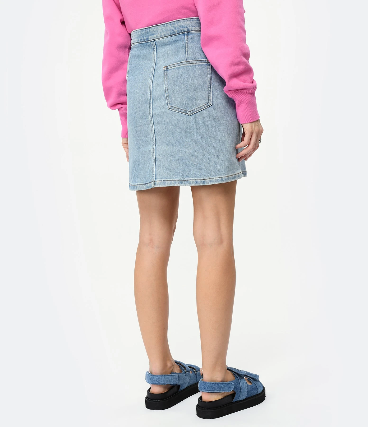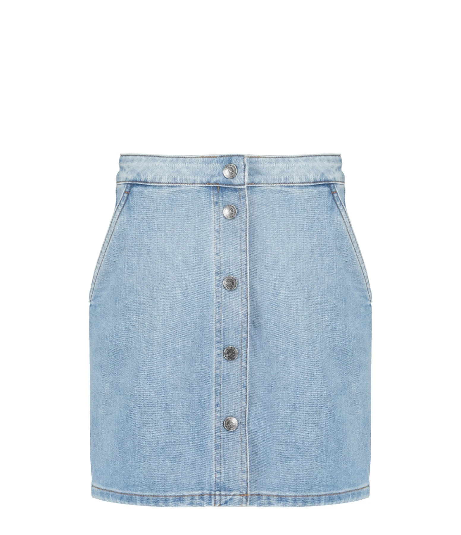 Jupe courte en denim bleu. Deux poches à l’avant et une à l’arrière. Fermeture par boutons. Coupe droite. Base droite.