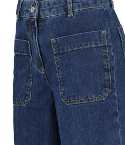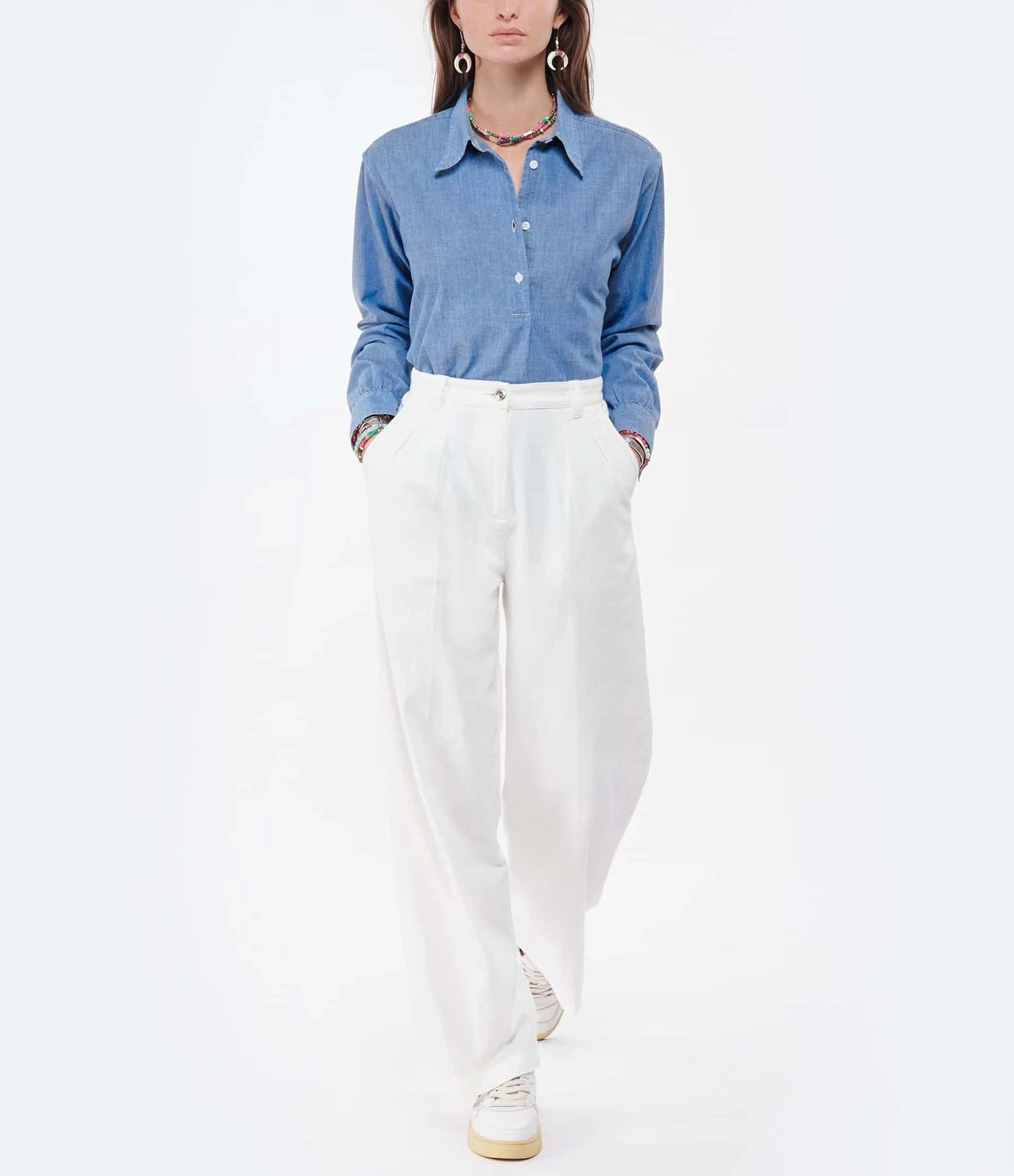 Pantalon en denim blanc. Taille haute avec passants pour ceinture. Fermeture par zip et bouton. Deux poches italiennes à l’avant et une poche passepoilée à l’arrière. Coupe large.