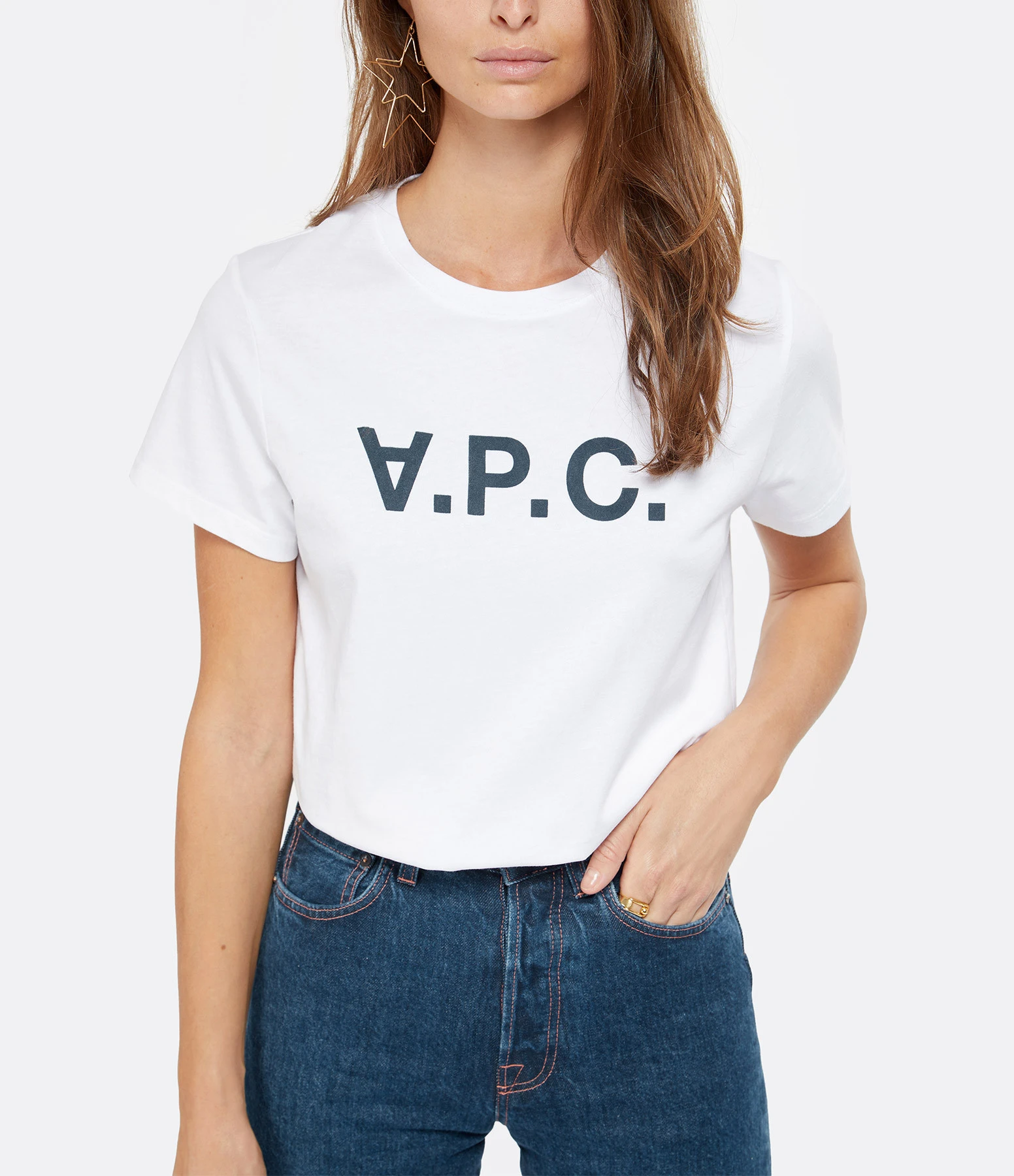 Tee-shirt en coton blanc. Inscription « A.P.C » en bleu marine à l’avant. Col rond. Manches courtes. Coupe droite. Base droite.