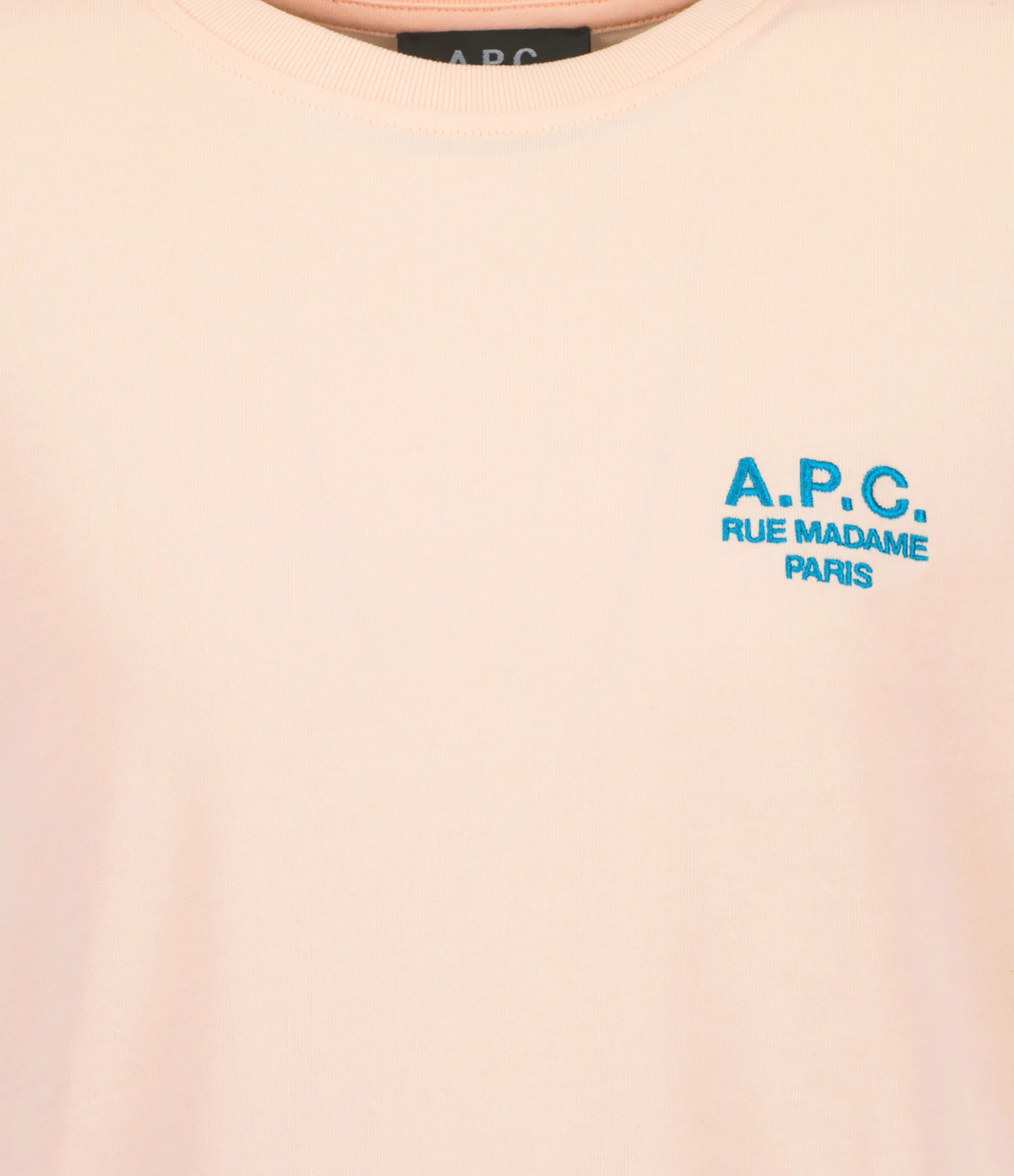Tee-shirt en coton rose pâle à manches courtes. Inscription « A.P.C » brodé en turquoise côté cœur. Col rond côtelé. Coupe droite. Base droite.