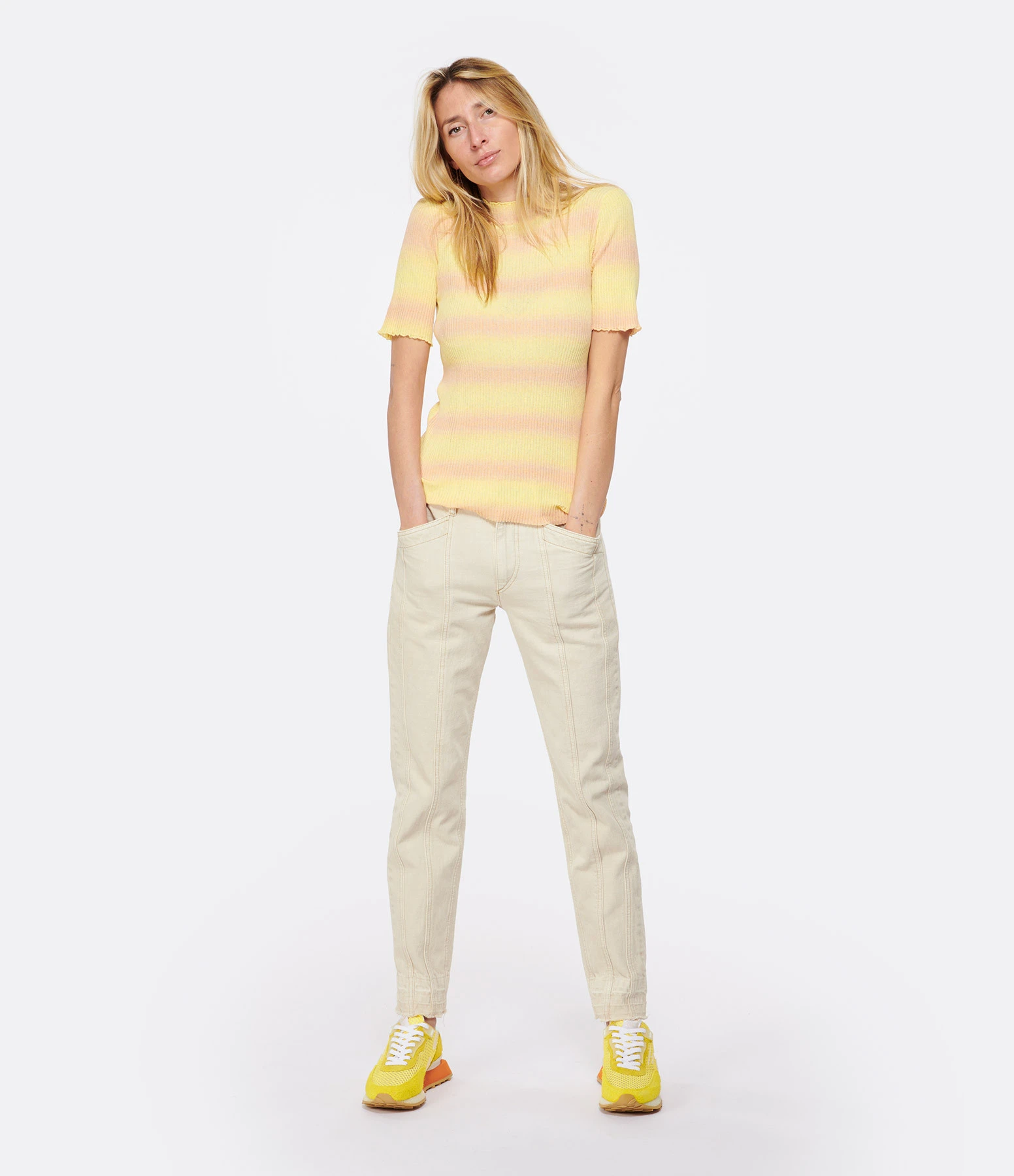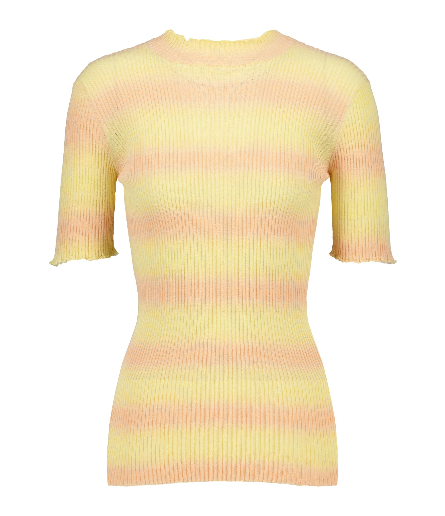 Top long jaune à manches courtes. Col rond ondulé. Coupe ajustée. Base droite.