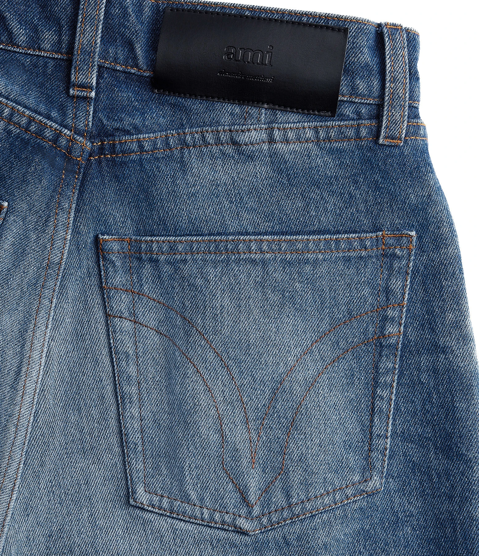 Pantalon en denim de coton bleu délavé. Passants pour ceinture. Braguette zippée et boutonnée. Deux poches italiennes et une poche à gousset. Deux poches plaquées dans le dos. Jacron noir dans le dos. Coupe boyfriend. Base droite.