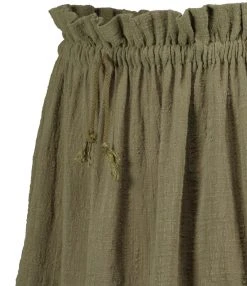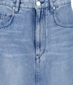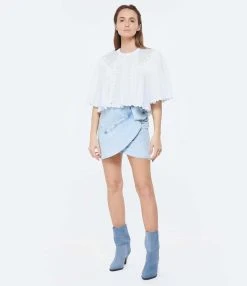 Jupe courte en denim bleu délavé. Passants pour ceinture. Braguette zippée et boutonnée. Deux poches italiennes et une poche à gousset. Deux poches plaquées dans le dos. Coupe droite. Base droite.