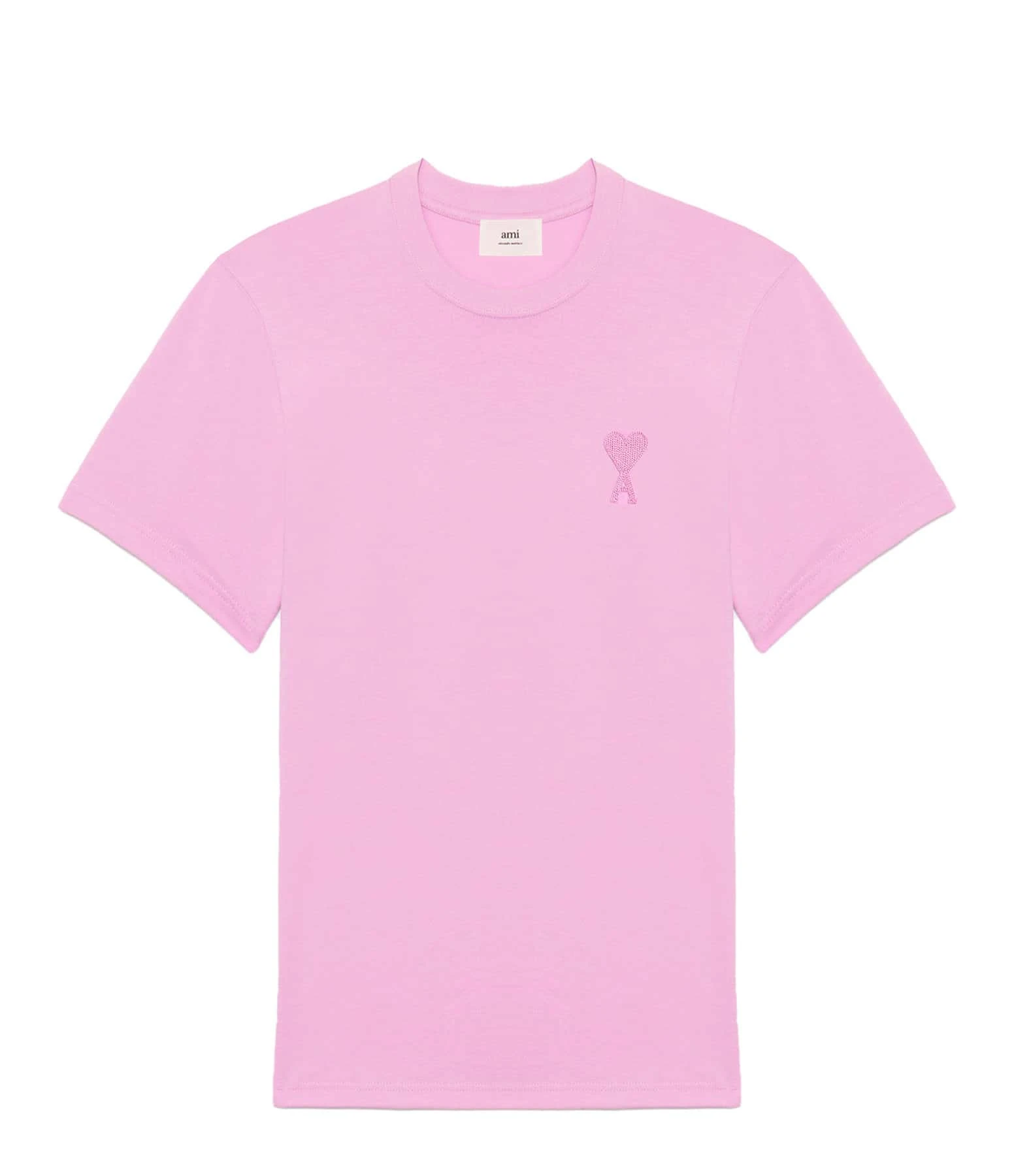 Tee-shirt unisexe en coton rose avec logo ton sur ton « Ami de cœur » brodé sur la poitrine. Col rond côtelé. Manches courtes. Coupe droite. Base droite.