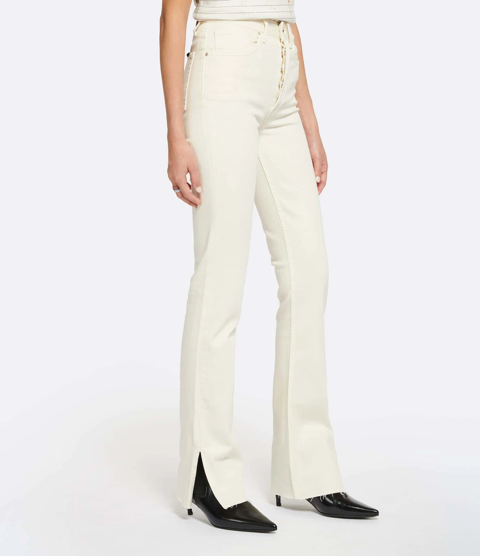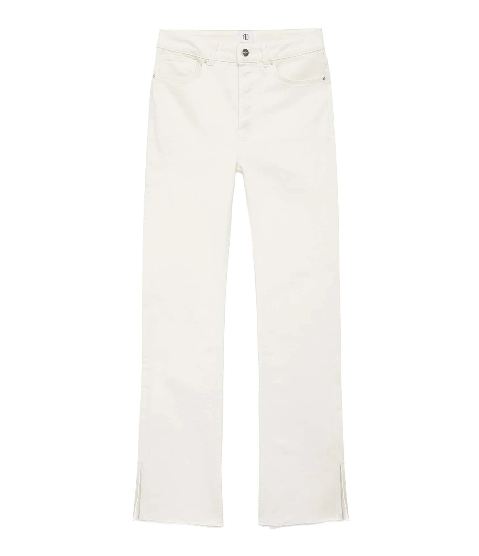Pantalon en denim de coton crème. Cinq poches. Taille haute. Fermeture par boutons. Passants pour ceinture. Coupe droite. Bas de jambe effiloché et fendu.