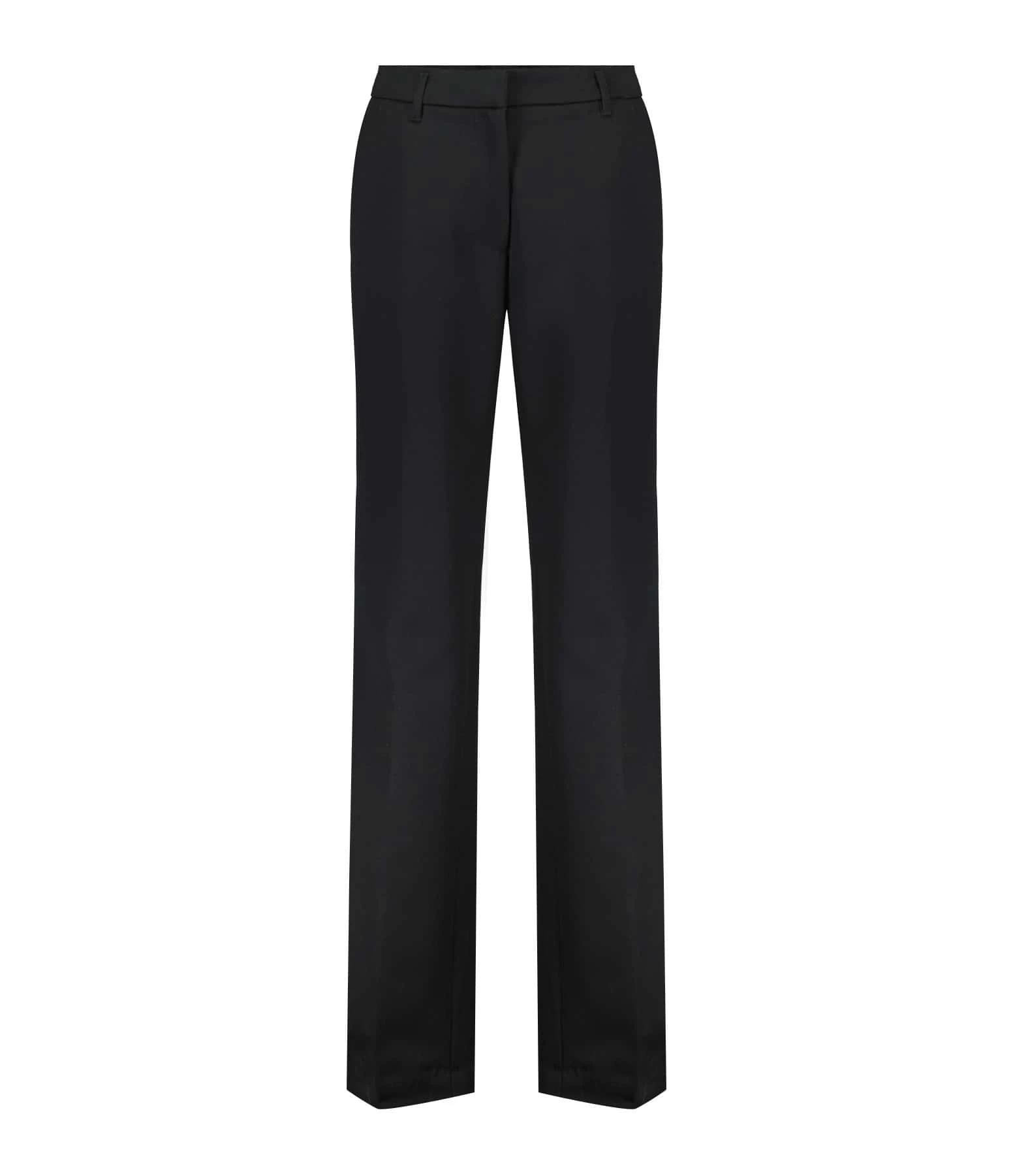 Pantalon tailleur en laine noir. passants pour ceinture. Braguette zippée et crochet. Deux poches italiennes. Deux poches passepoilées boutonnées dans le dos. Boutons noirs. Coupe droite. Base droite.