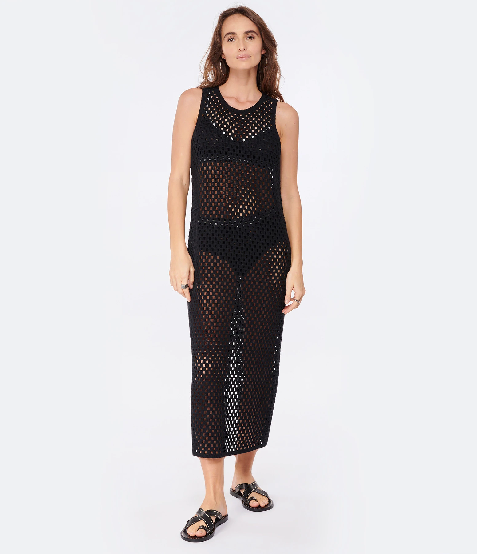 Robe longue en crochet noire. Col rond. Coupe droite. Base droite fendue à l’arrière.