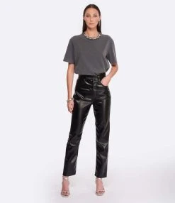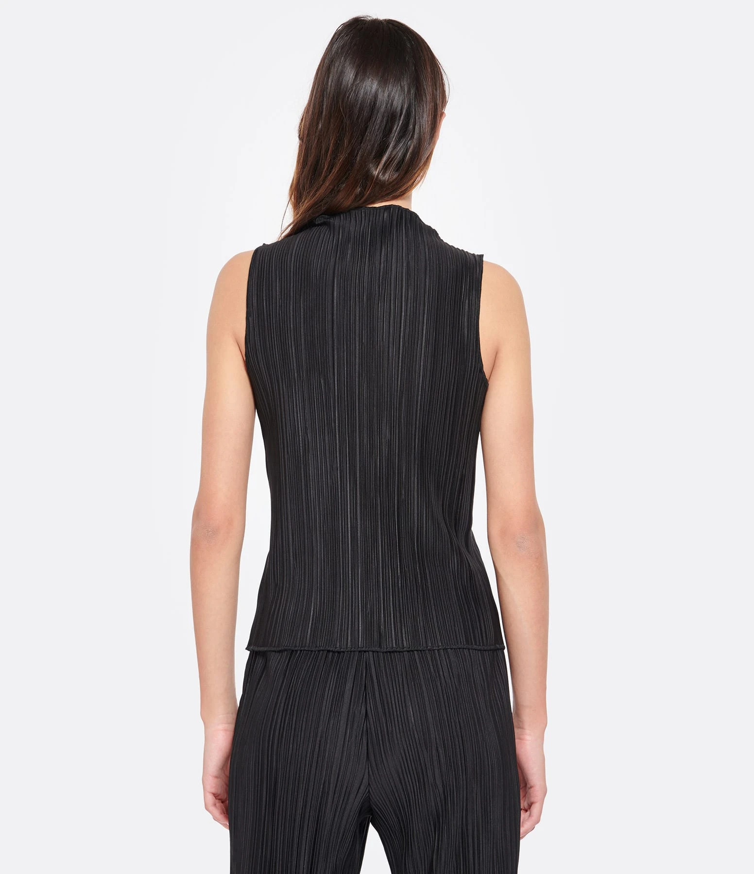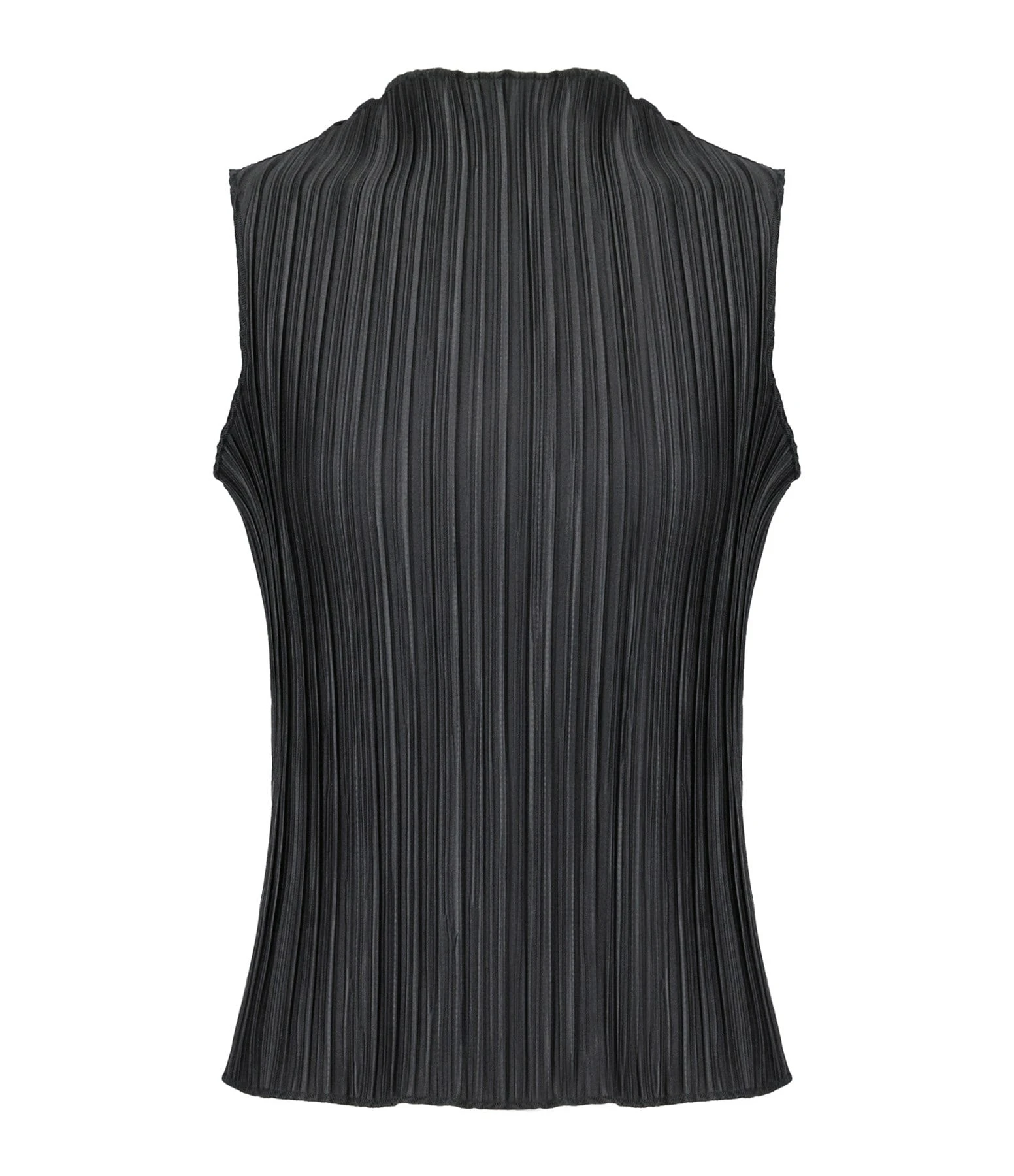 Top noir plissé. Col rond ondulé. Sans manches. Coupe droite. Base droite.