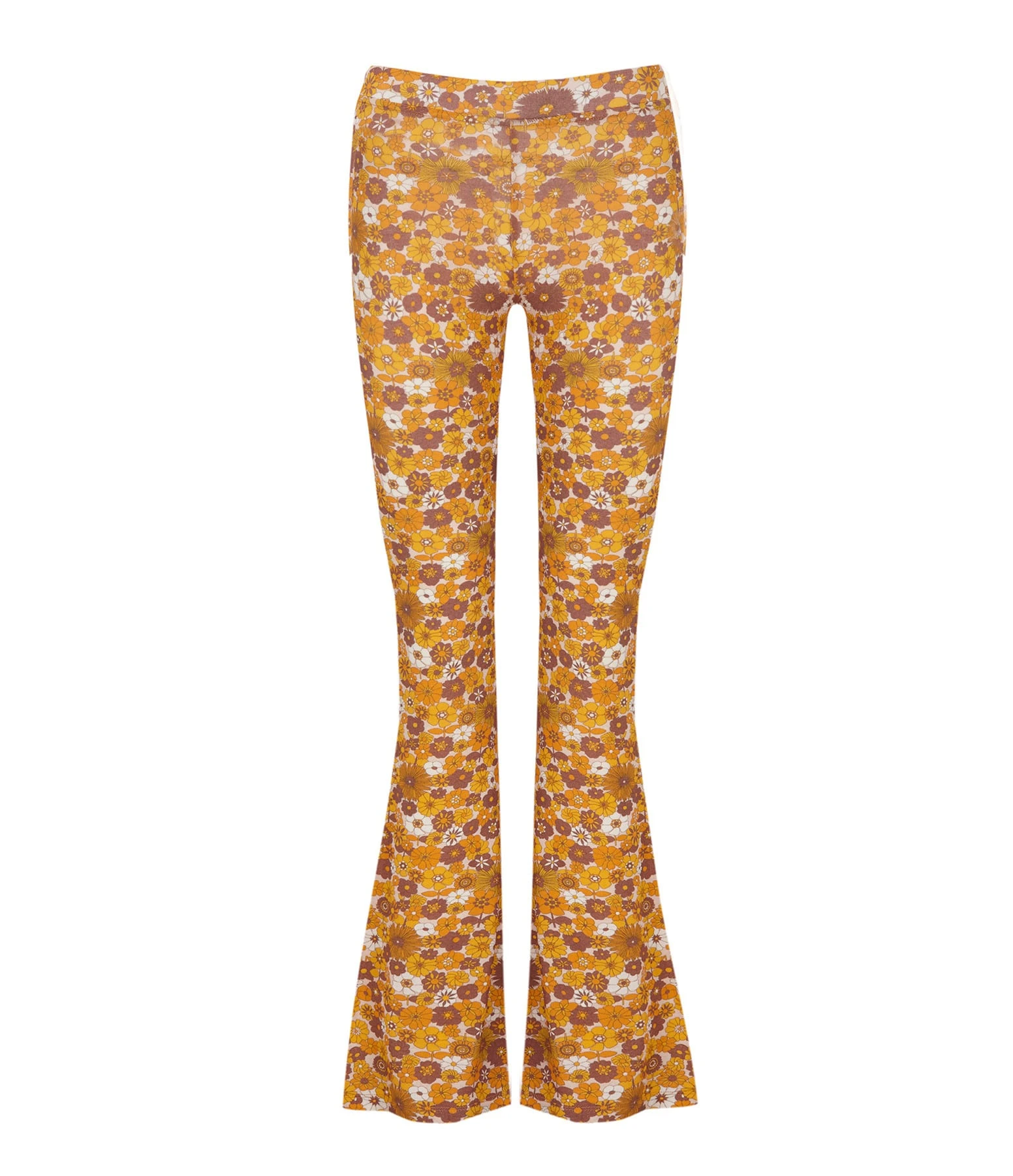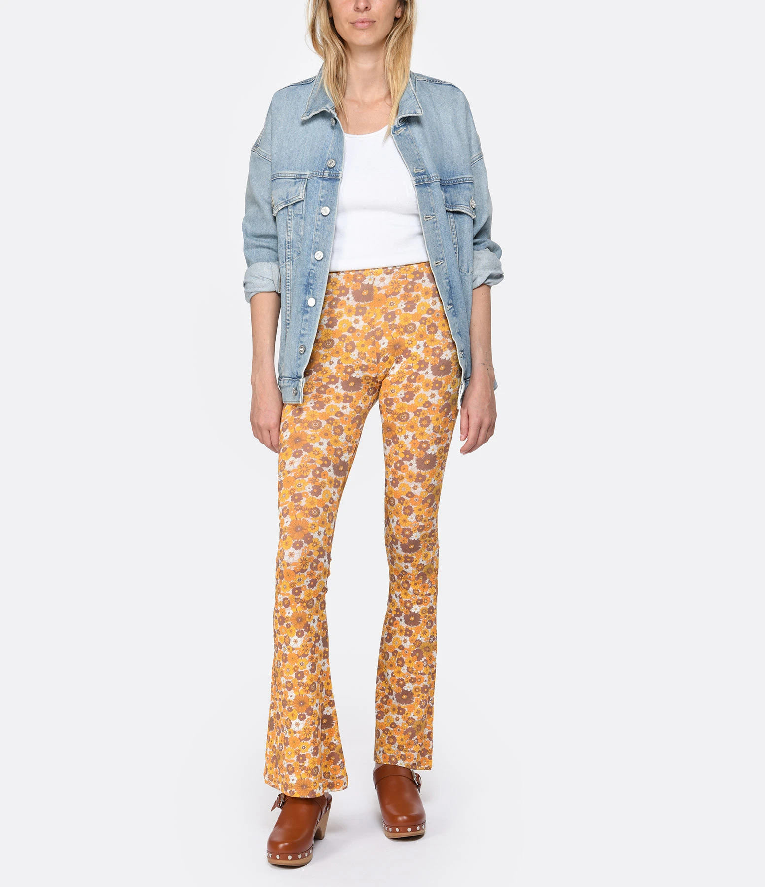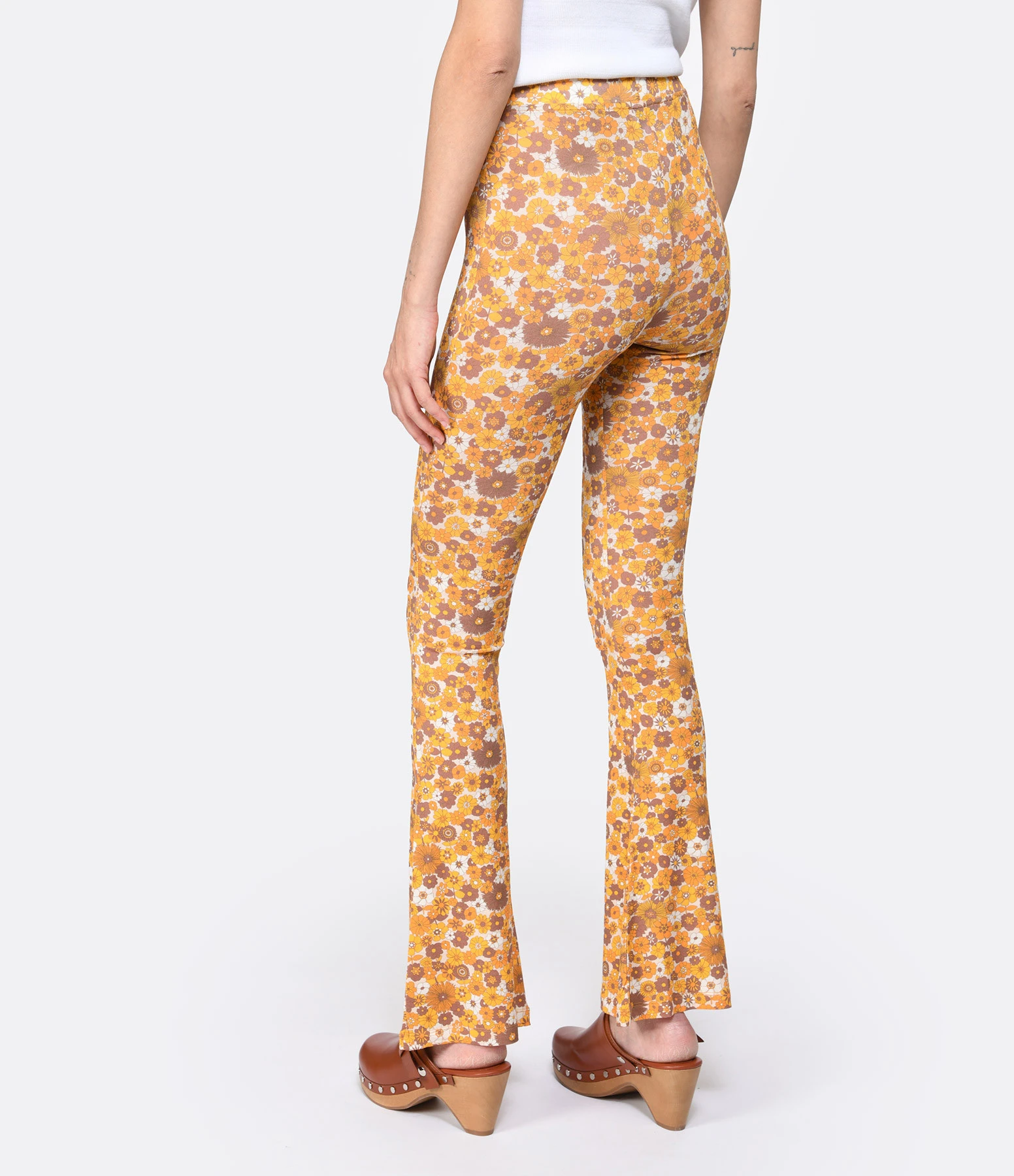Pantalon effet legging patte d’éléphant à imprimé fleuri dans les tons jaunes. Taille élastiquée. Coupe moulante puis évasé. Base droite.