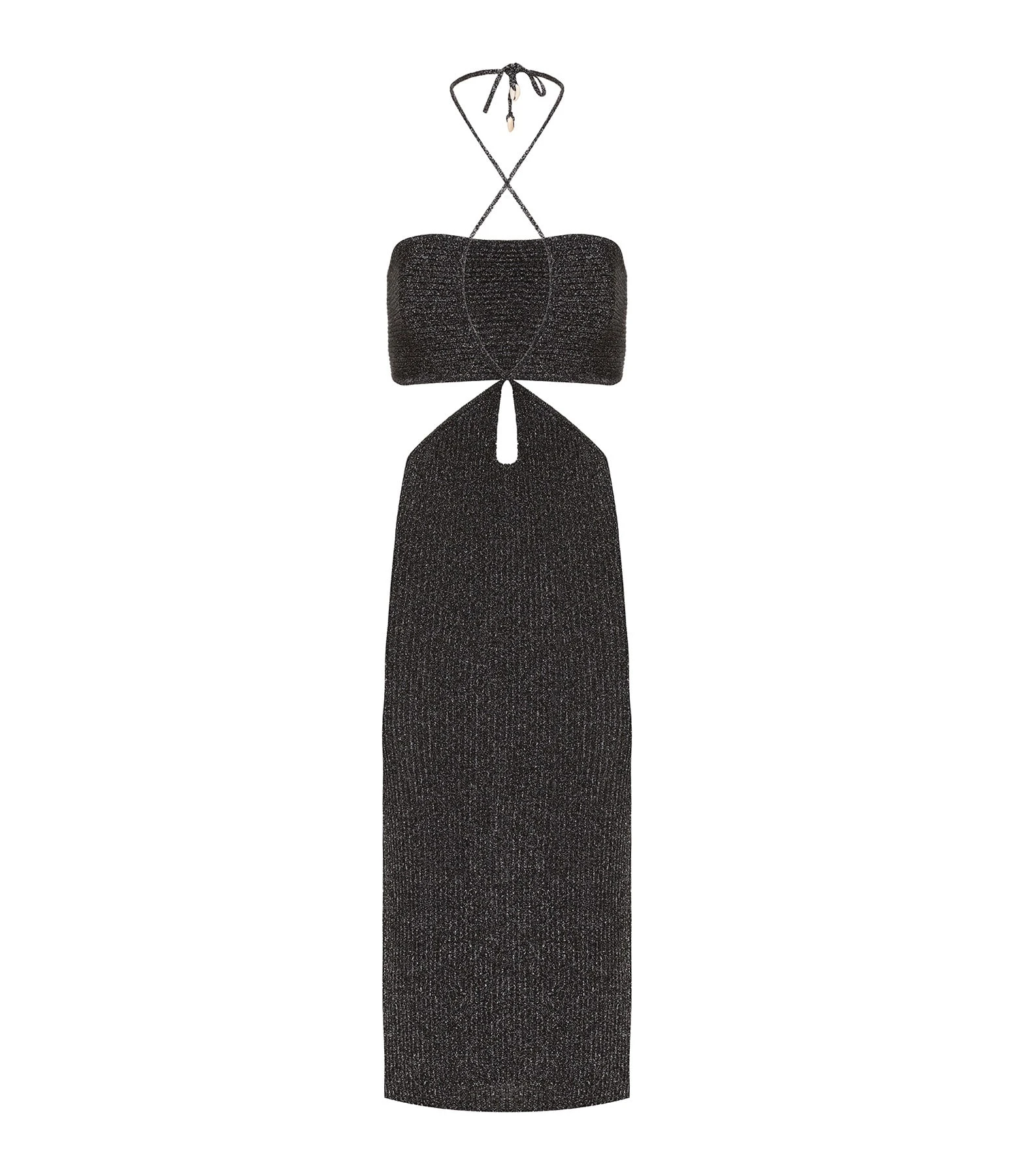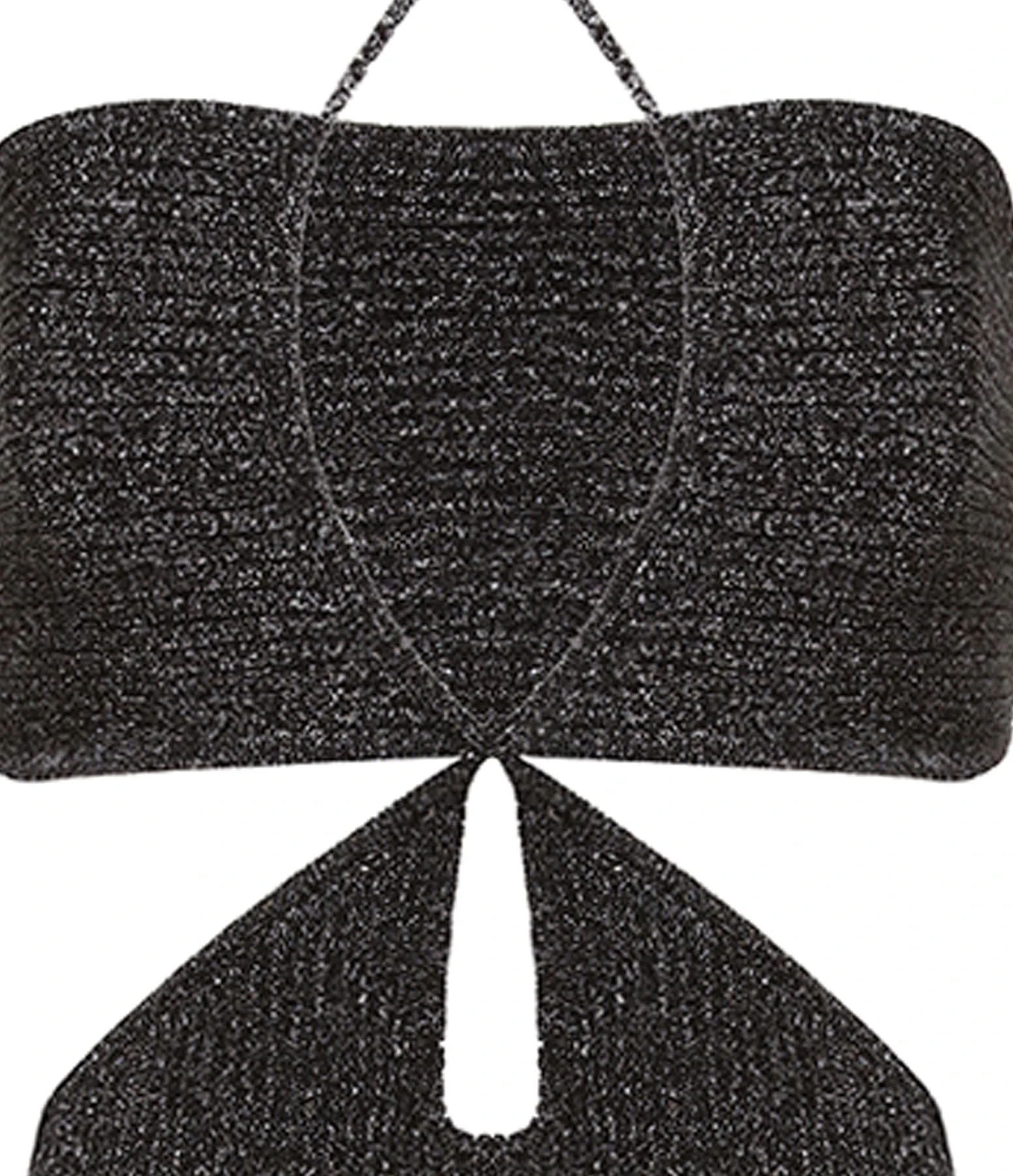 Robe longue noire à fils argentés. Dos nu et ouverture au niveau des hanches. Fermeture par cordons à nouer au niveau de la nuque. Coupe moulante. Base droite.