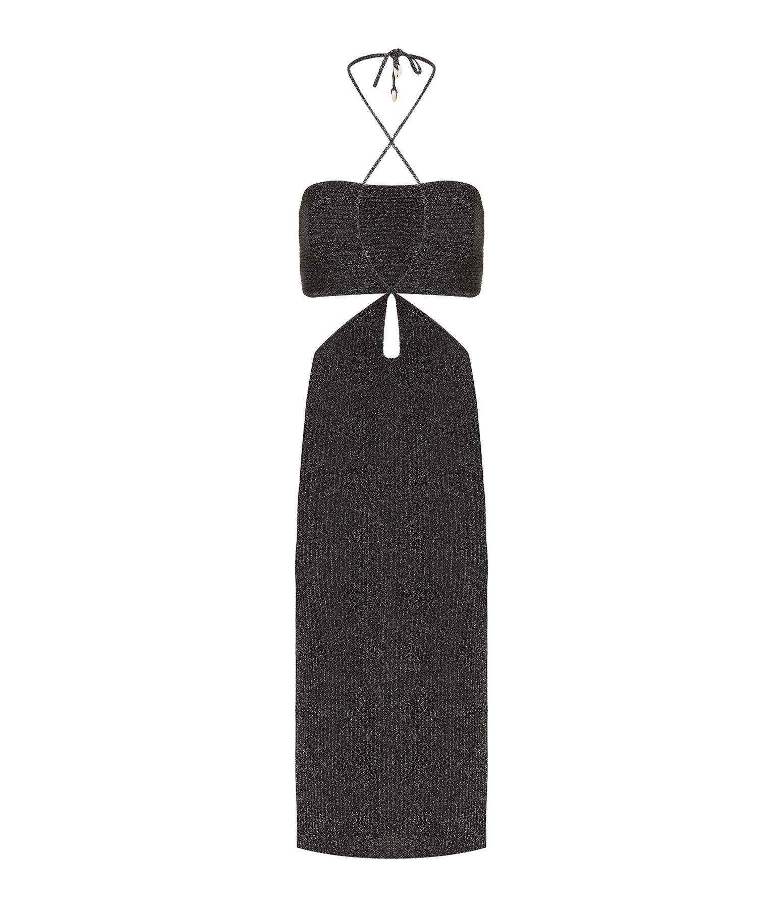Robe longue noire à fils argentés. Dos nu et ouverture au niveau des hanches. Fermeture par cordons à nouer au niveau de la nuque. Coupe moulante. Base droite.