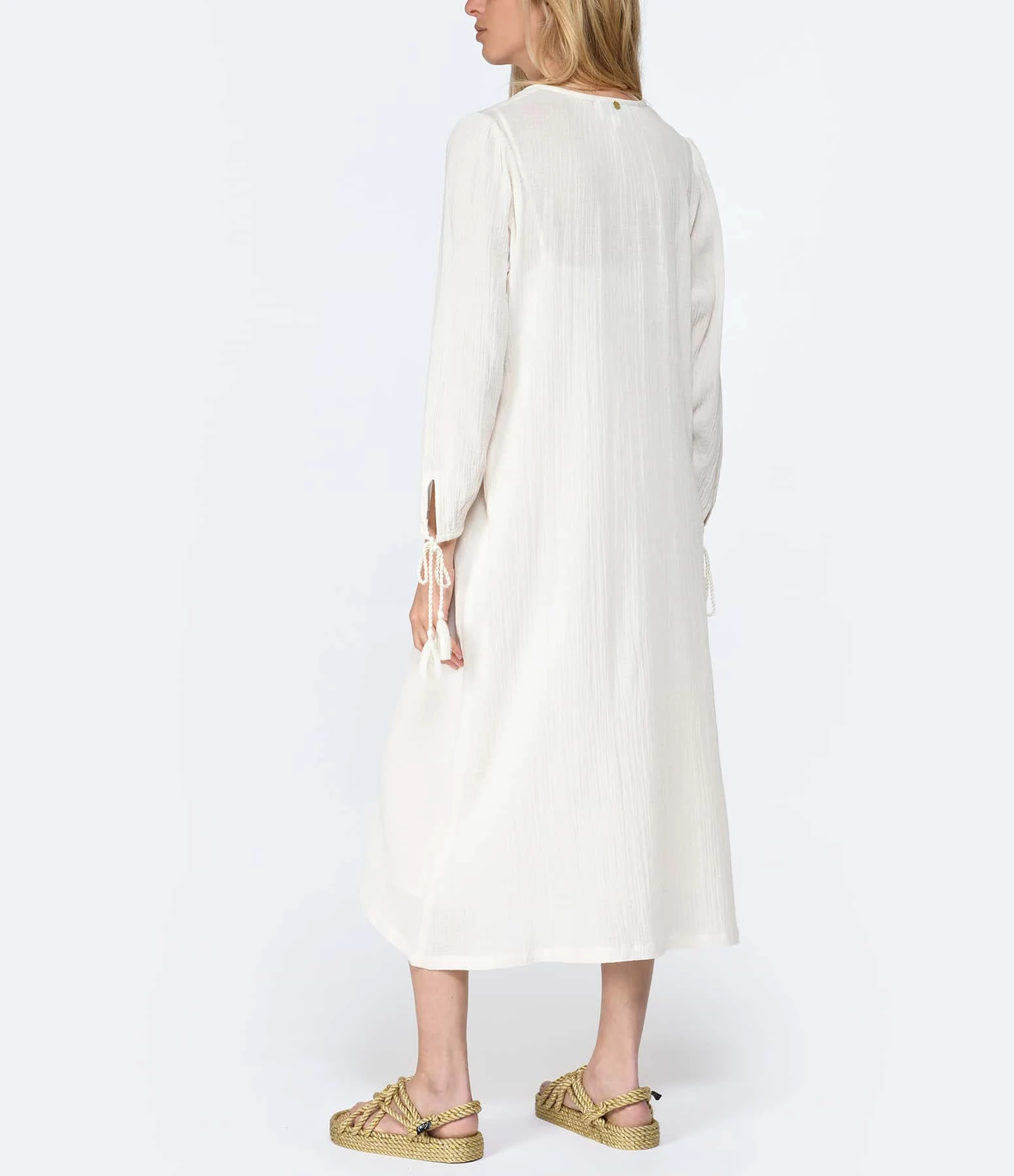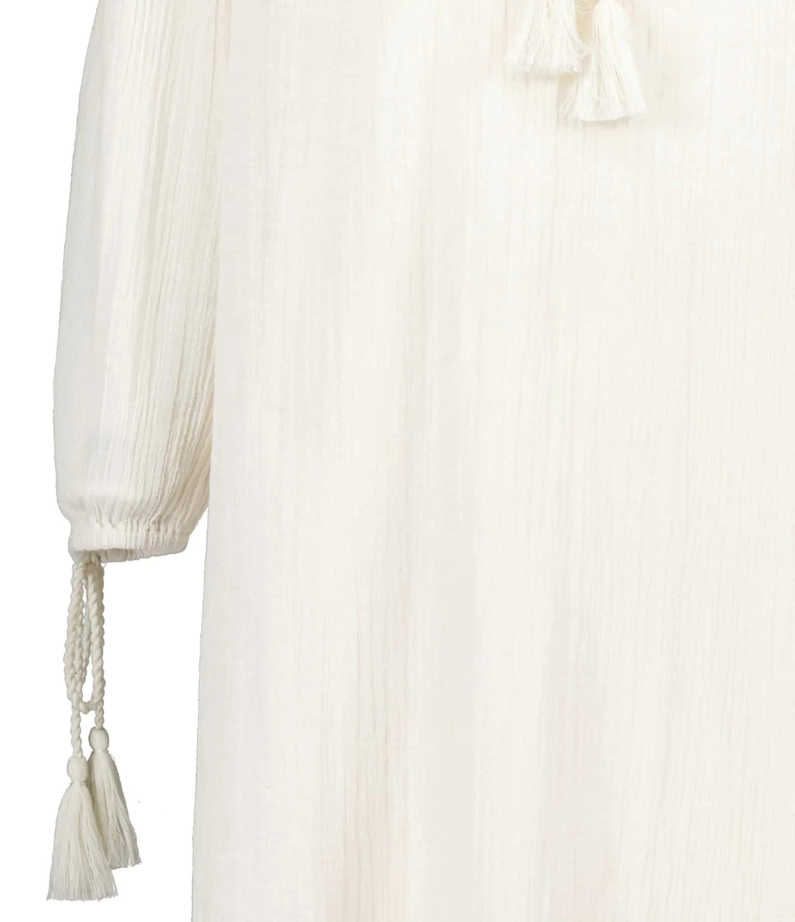 Robe longue en coton uni crème. Manches longues avec liens de serrage aux poignets. Col en V avec liens de serrage. Coupe ample. Base droite. Fond de robe inclus.