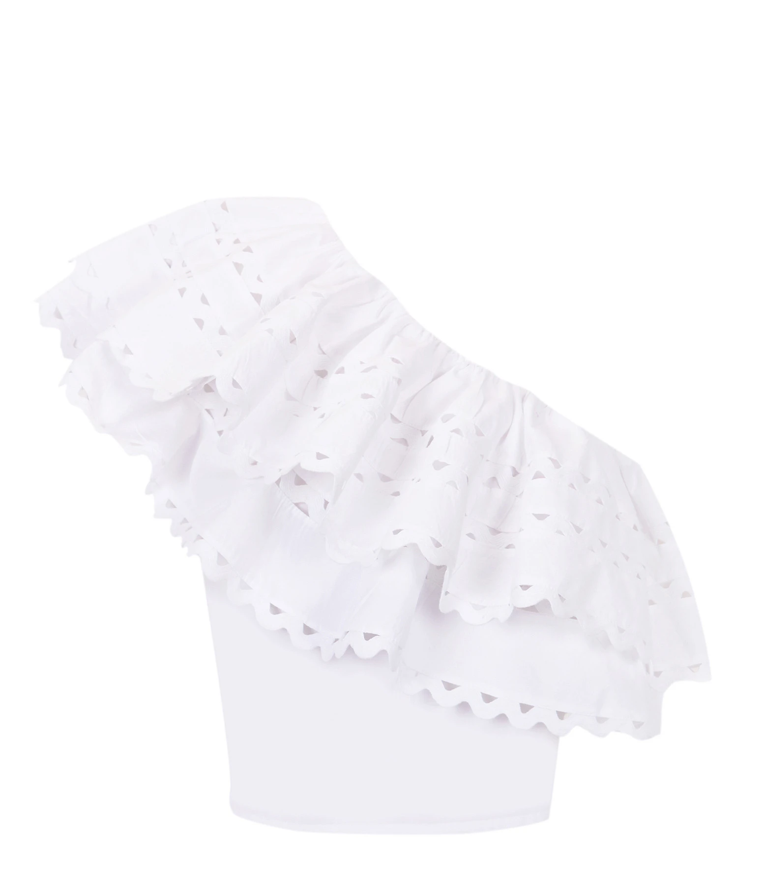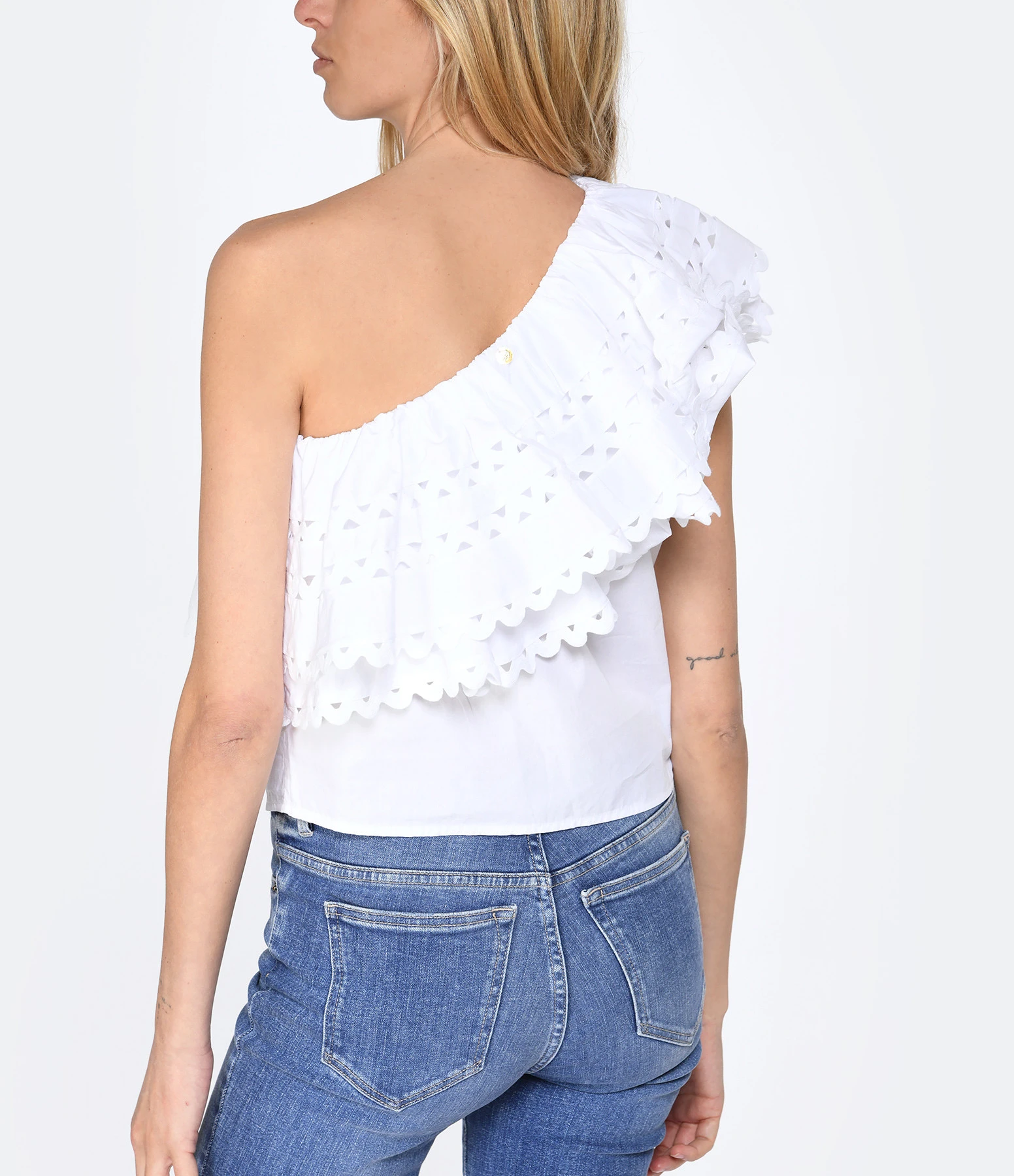 Top blanc à volants au niveau épaule et poitrine. Manches asymétriques. Coupe droite. Base droite.