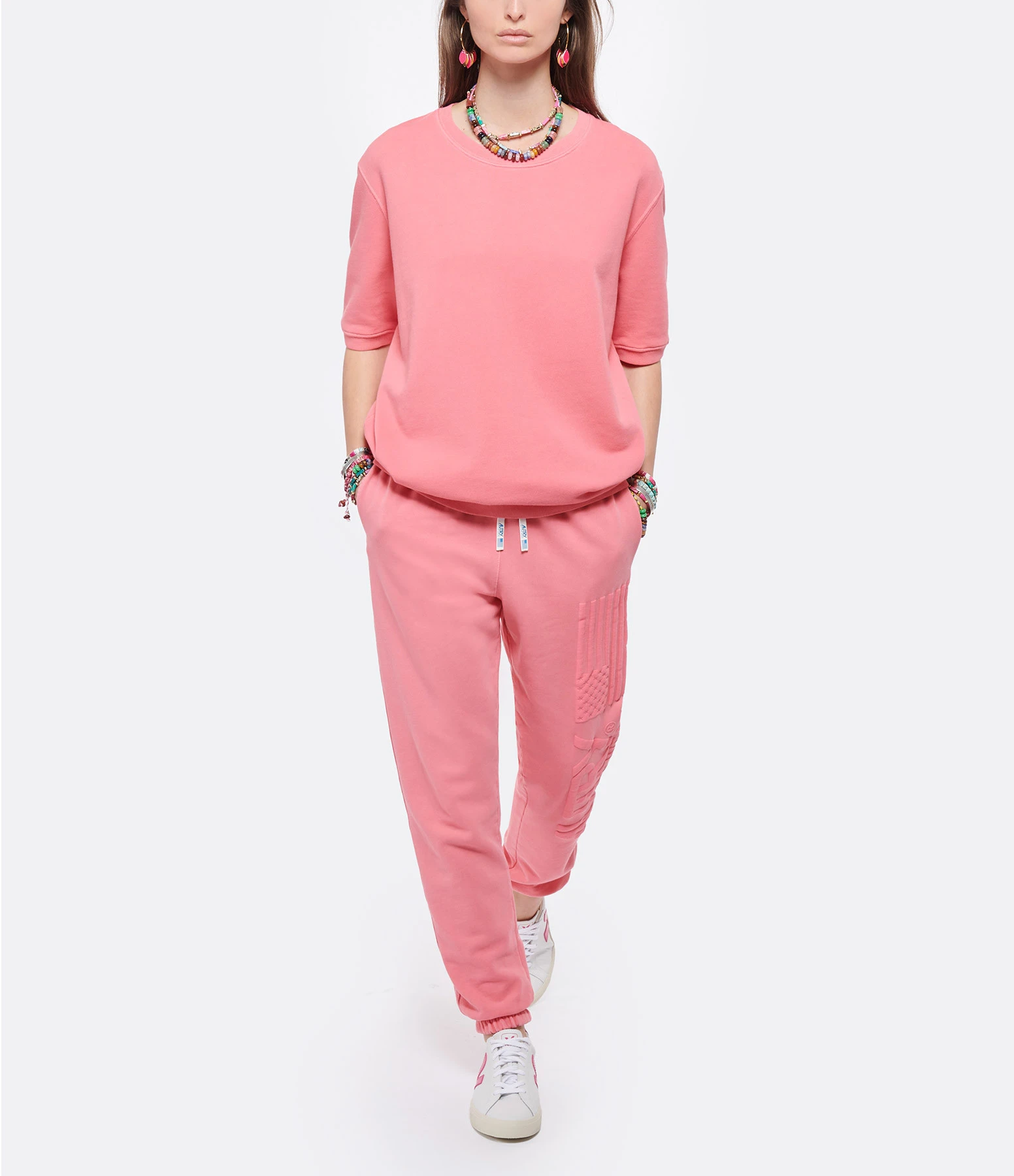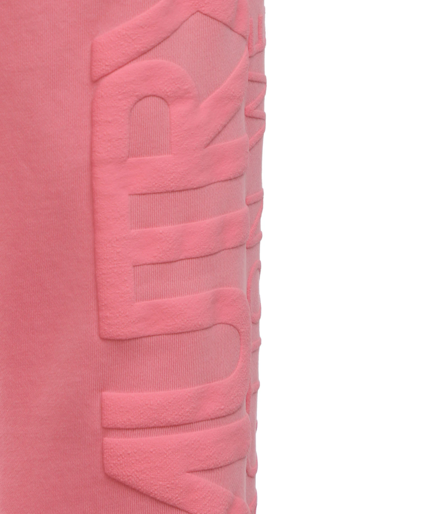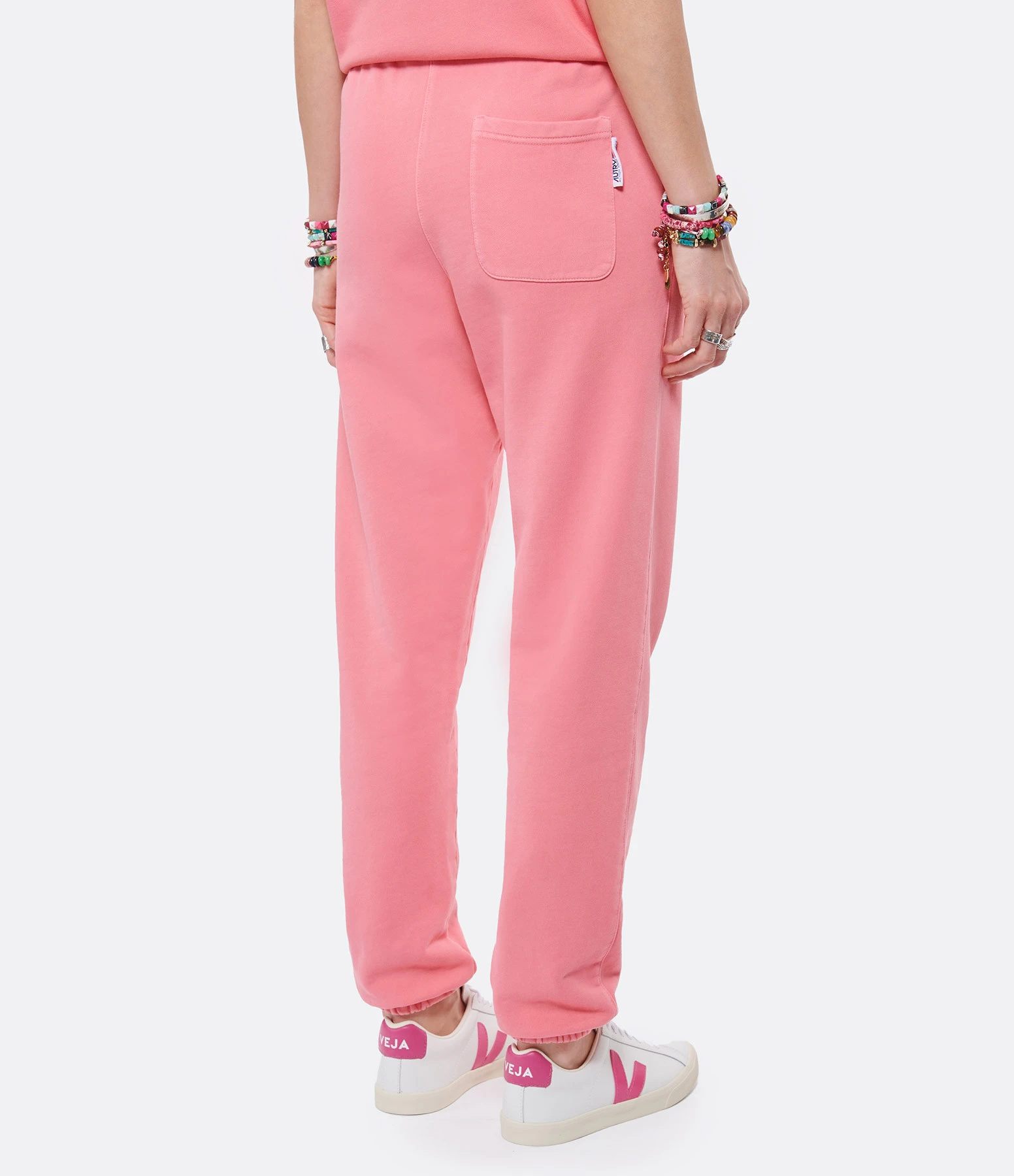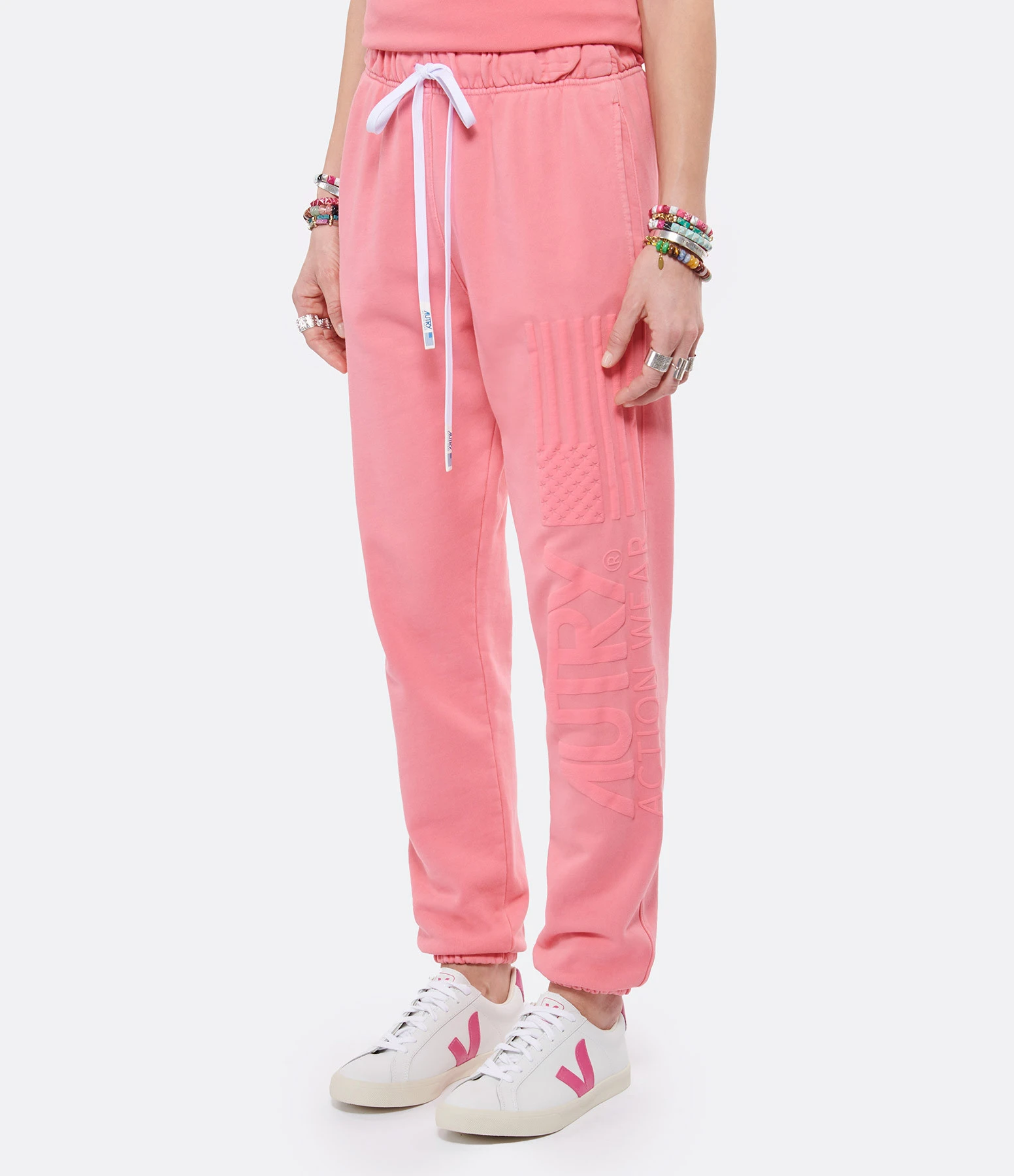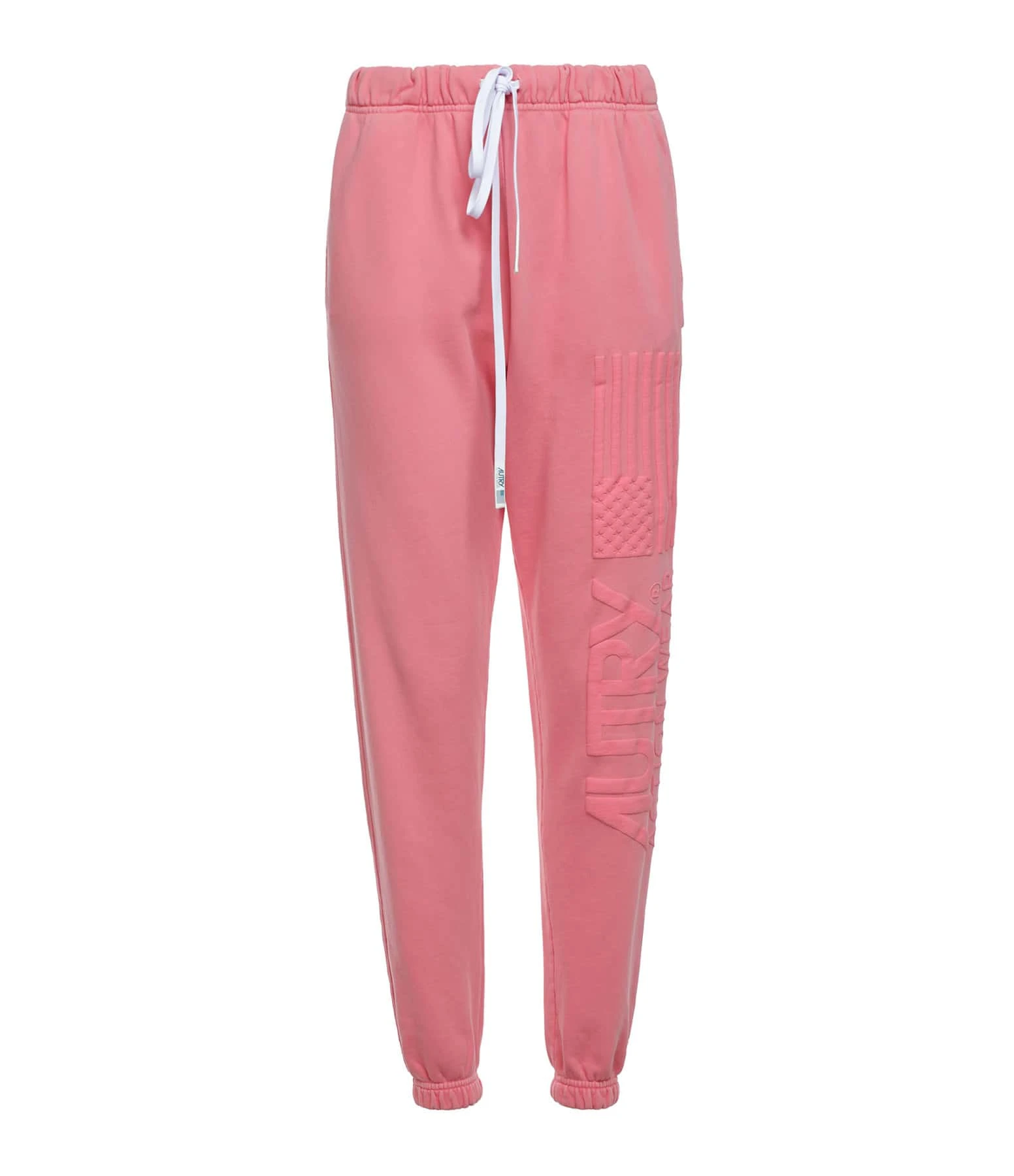 Pantalon de jogging doux en coton rose. Inscription sur la jambe gauche « Autry Action Wear ». Taille élastiquée avec liens de serrage. Cheville élastiquée. Deux poches fendues sur les côtés.