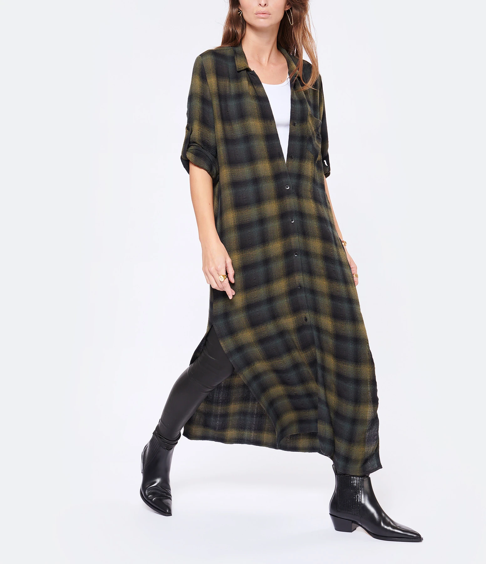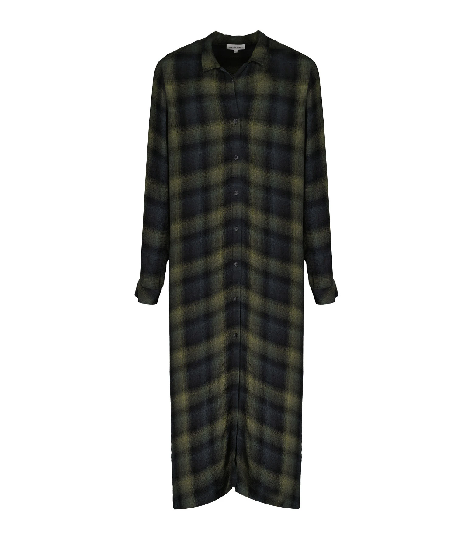 Robe chemise longue à imprimé carreaux dans des tons verts. Col chemisier. Manches longues avec fentes et poignets boutonnés. Possibilité de rabattre la manche grâce à un bouton présent sur l’avant bras. Fermeture boutonnée sur le devant. Petits boutons noirs. Une poche plaquée poitrine. Pli creux dans le dos. Fentes latérales. Coupe droite. Base droite.