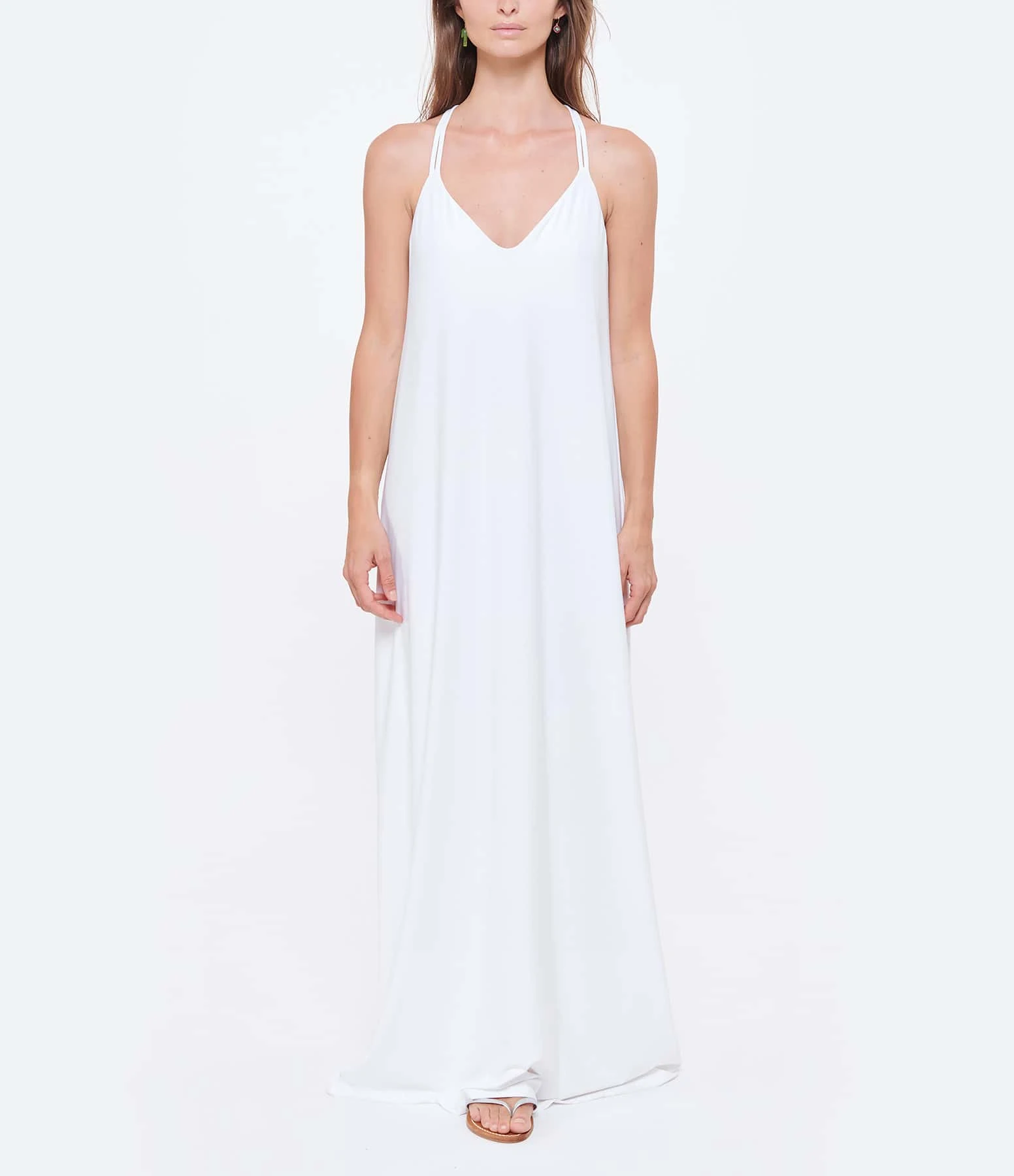 Robe longue blanche fluide. Coupe droite. Base droite. Décolleté en V. Bretelles épaules fines en tissu. Bretelle centrale avec anneaux effet écaille de tortue dans le dos.