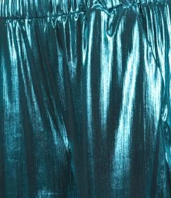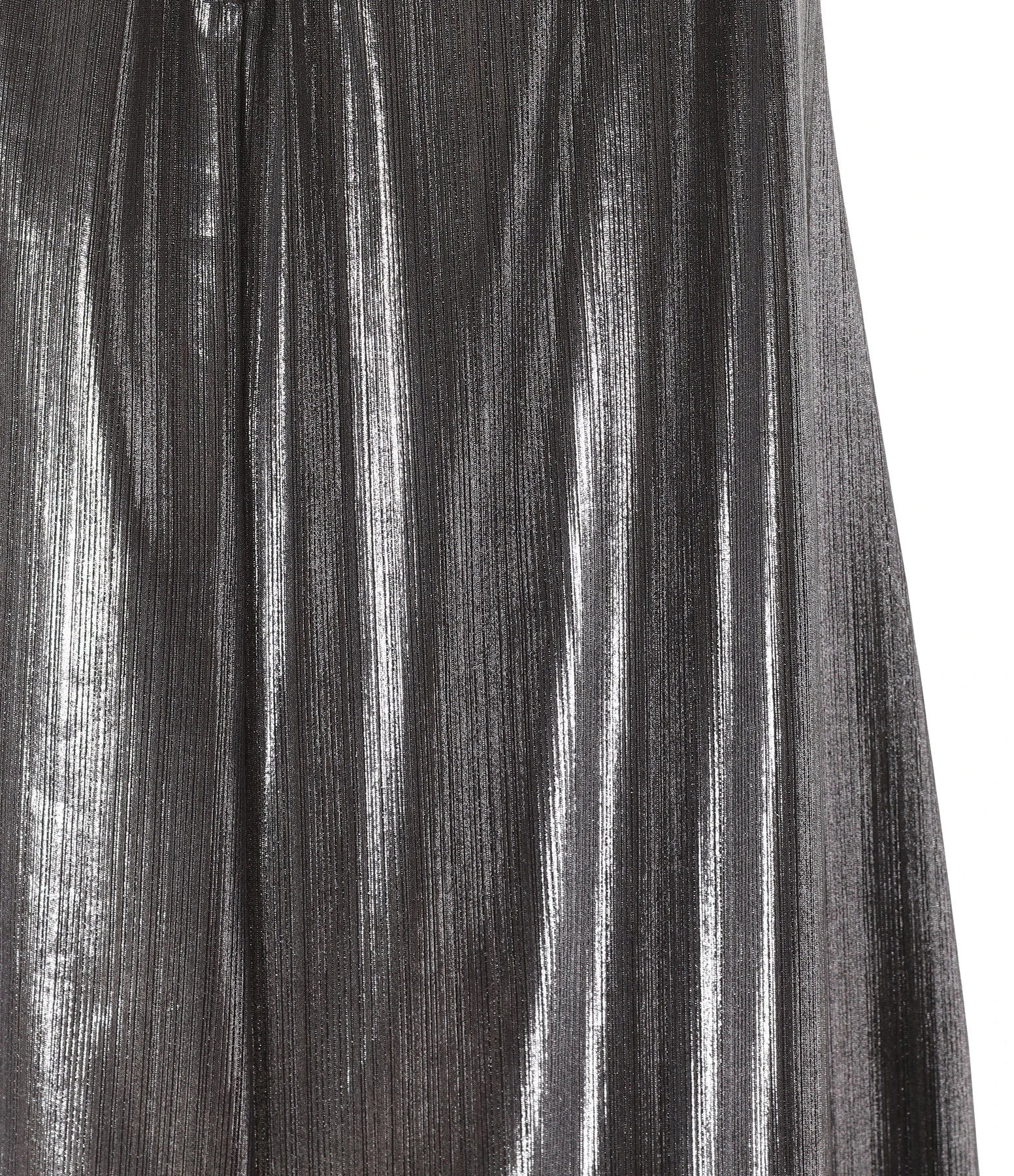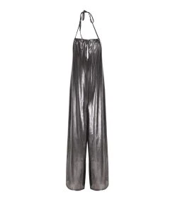 Combinaison longue argentée lamé dos nu. Fermeture par cordon de serrage à nouer dans la nuque et en bas du dos. Ouverture au niveau du décolleté. Coupe évasée. Base droite.