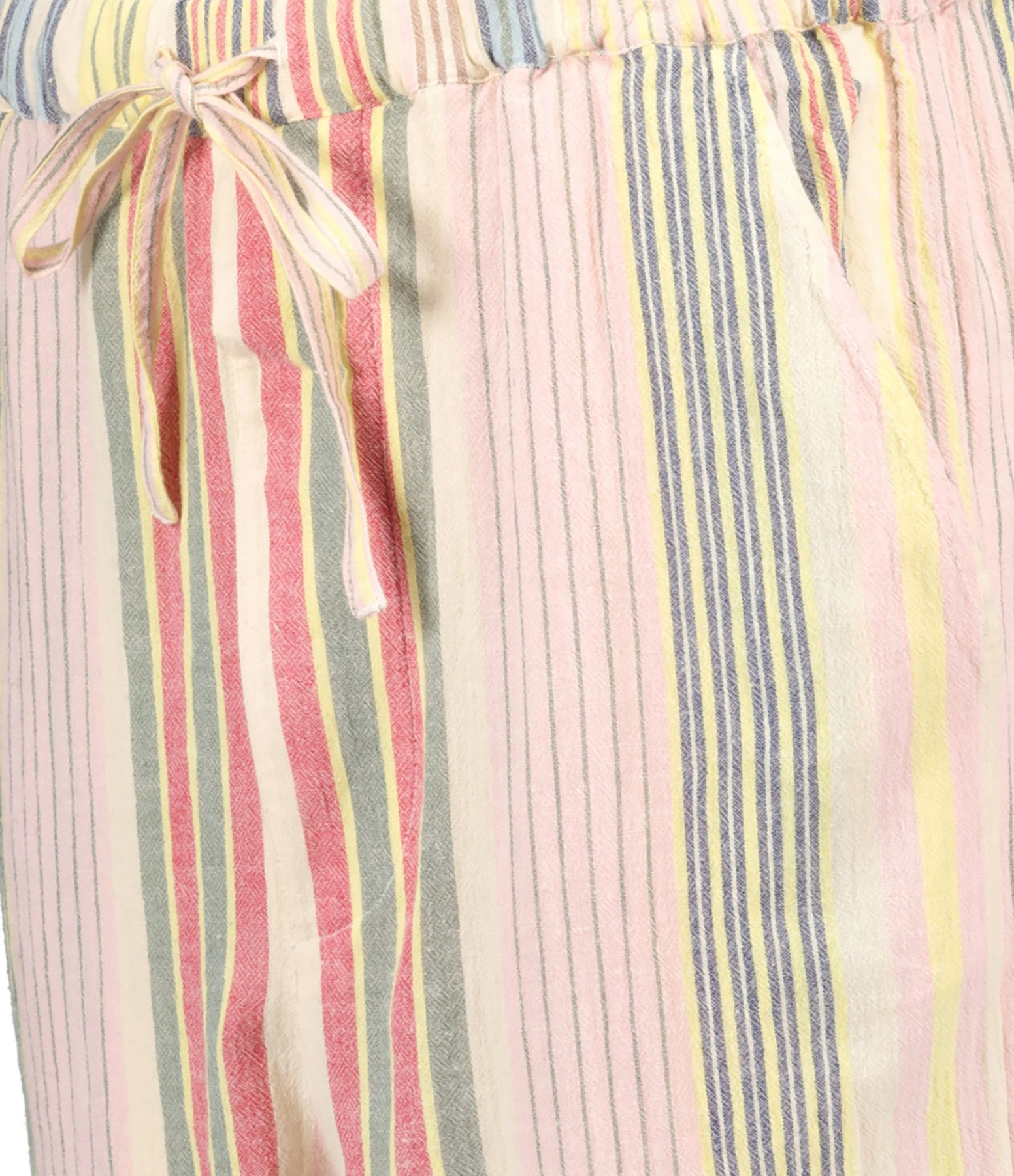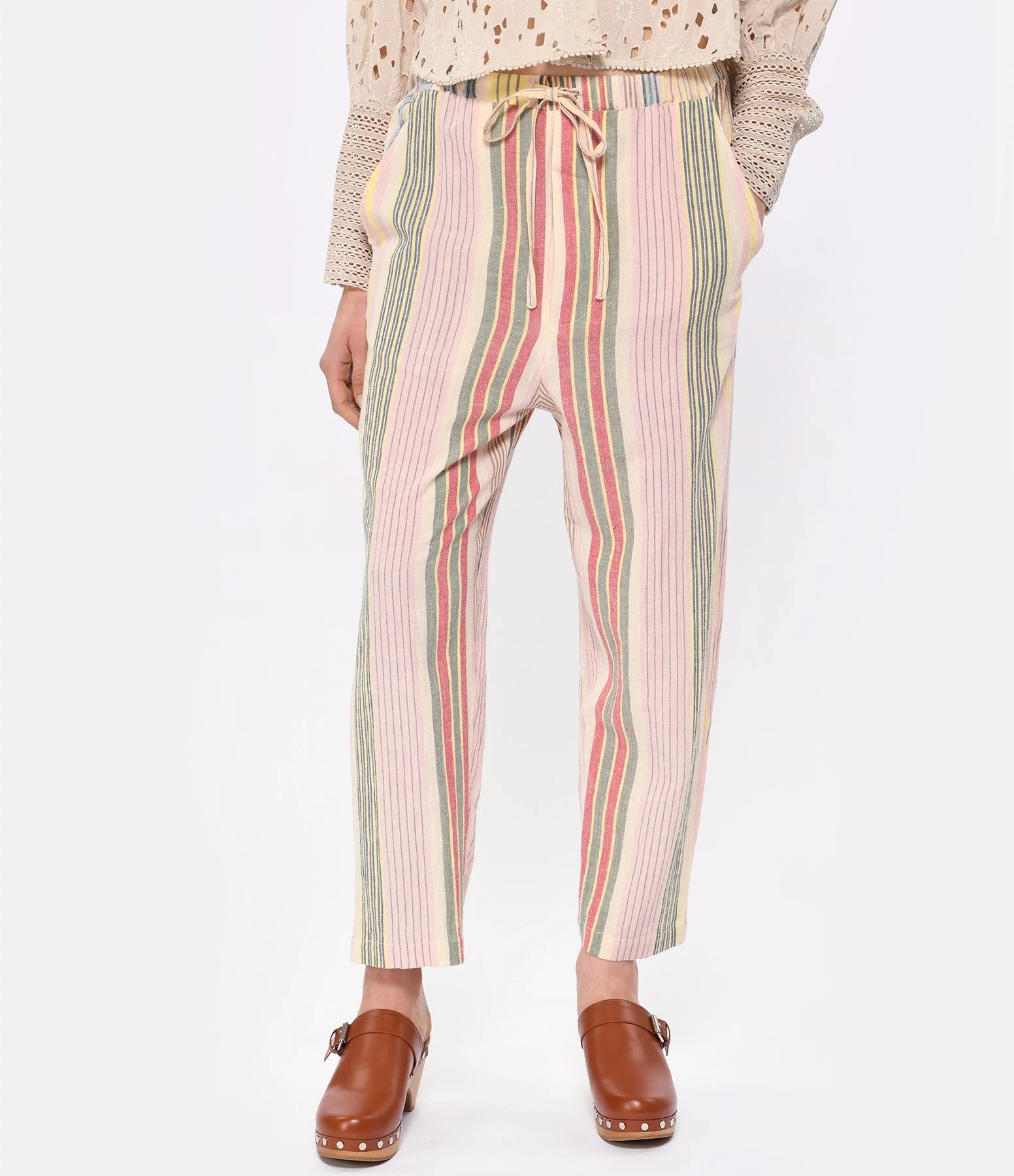 Pantalon en coton à rayures multicolores. Taille élastiquée avec cordon de serrage. Quatre poches. Coupe droite. Base droite.