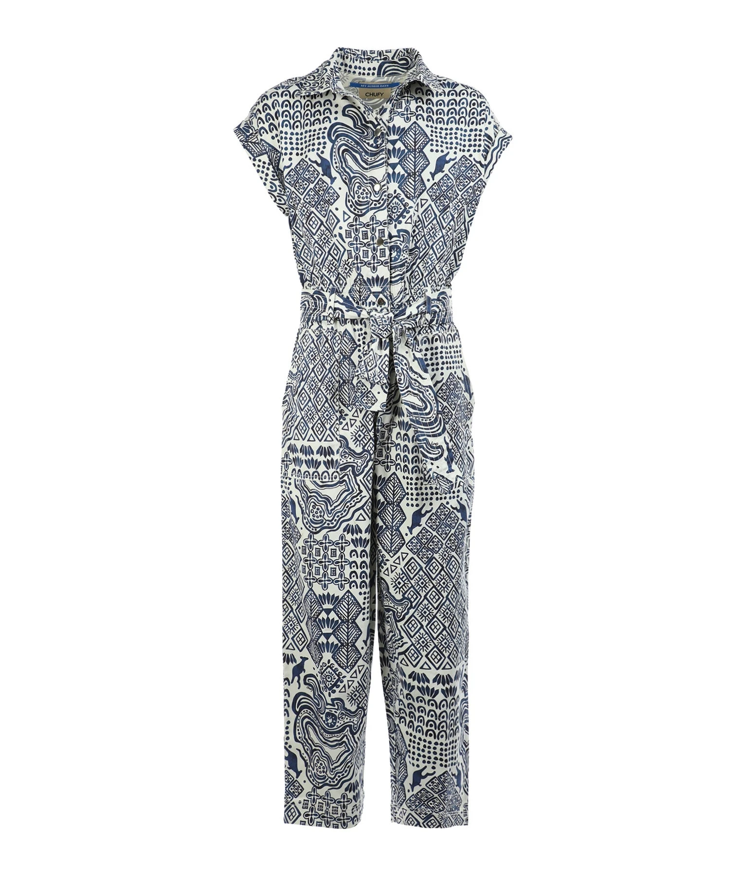 Combinaison en coton Ă imprimĂ© bleu et blanc. Col chemise. Fermeture par boutons pressions. Taille Ă©lastiquĂ©e et ceinture Ă nouer amovible. Manches courtes. Deux poches Ă l’avant.