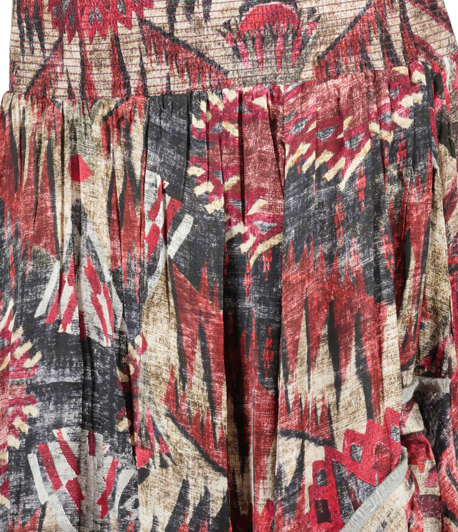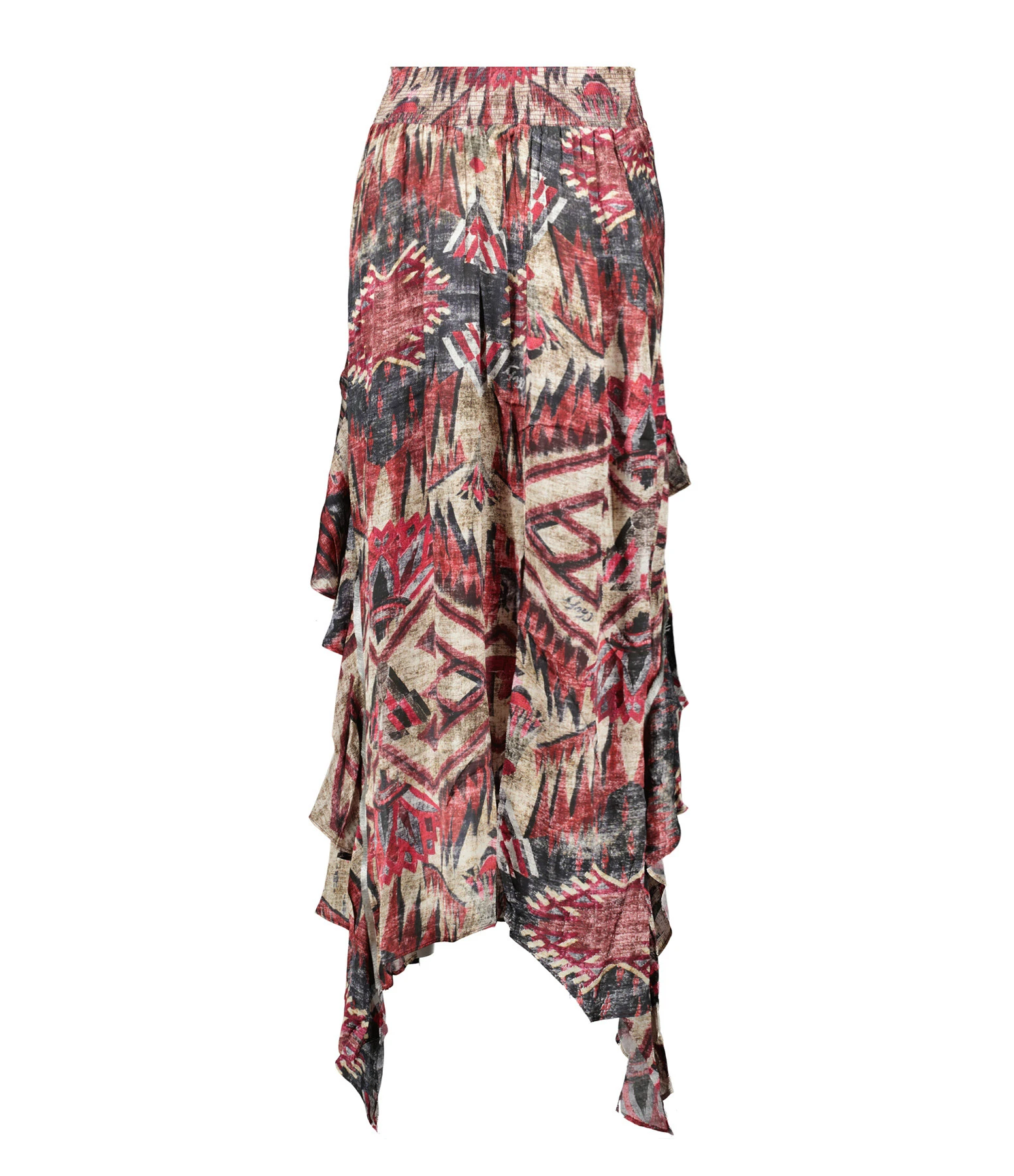 Jupe mi-longue à imprimé multicolore dans les tons roses. Taille haute élastiquée. Fentes sur le devant au bas de la jupe. Volants sur le côté. Coupe ample. Base asymétrique.