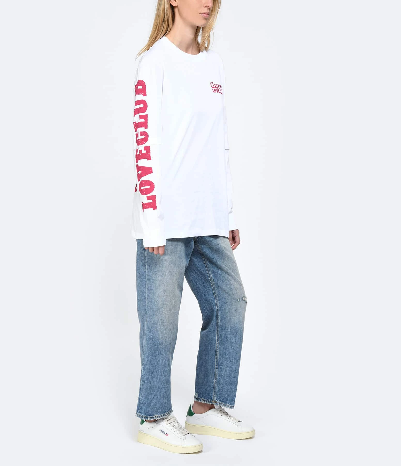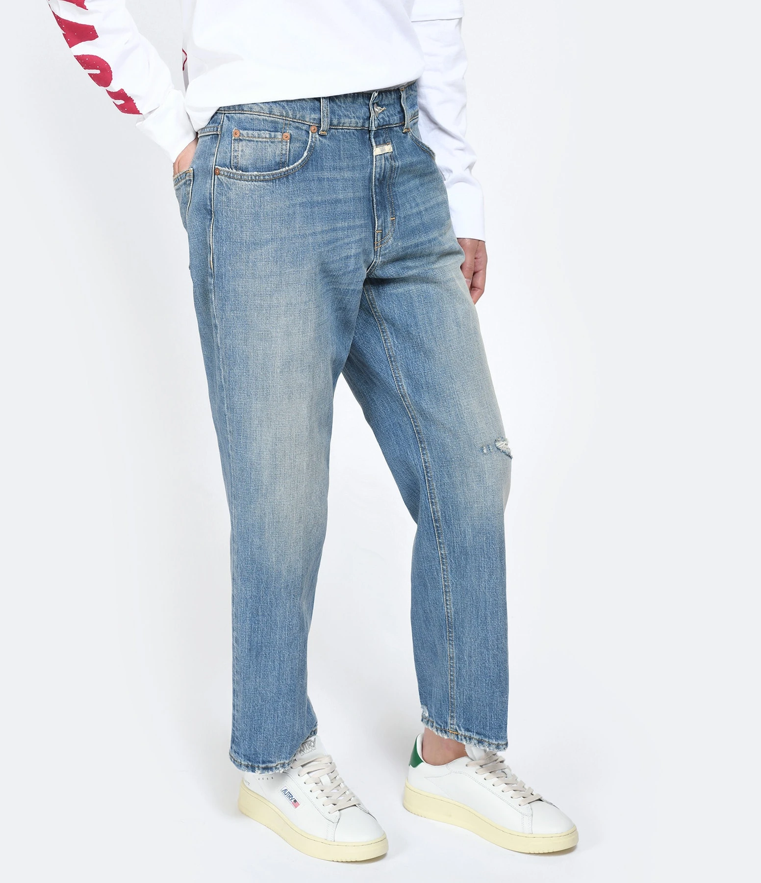 Jean droit en denim de coton biologique bleu clair délavé. Effet usé et troué volontaire. Fermeture zippée et par bouton métallique gravé du logo. Etiquette brodée « CLOSED » au niveau de la braguette. Passants pour ceinture. Cinq poches. Coupe droite. Base droite effet usé.