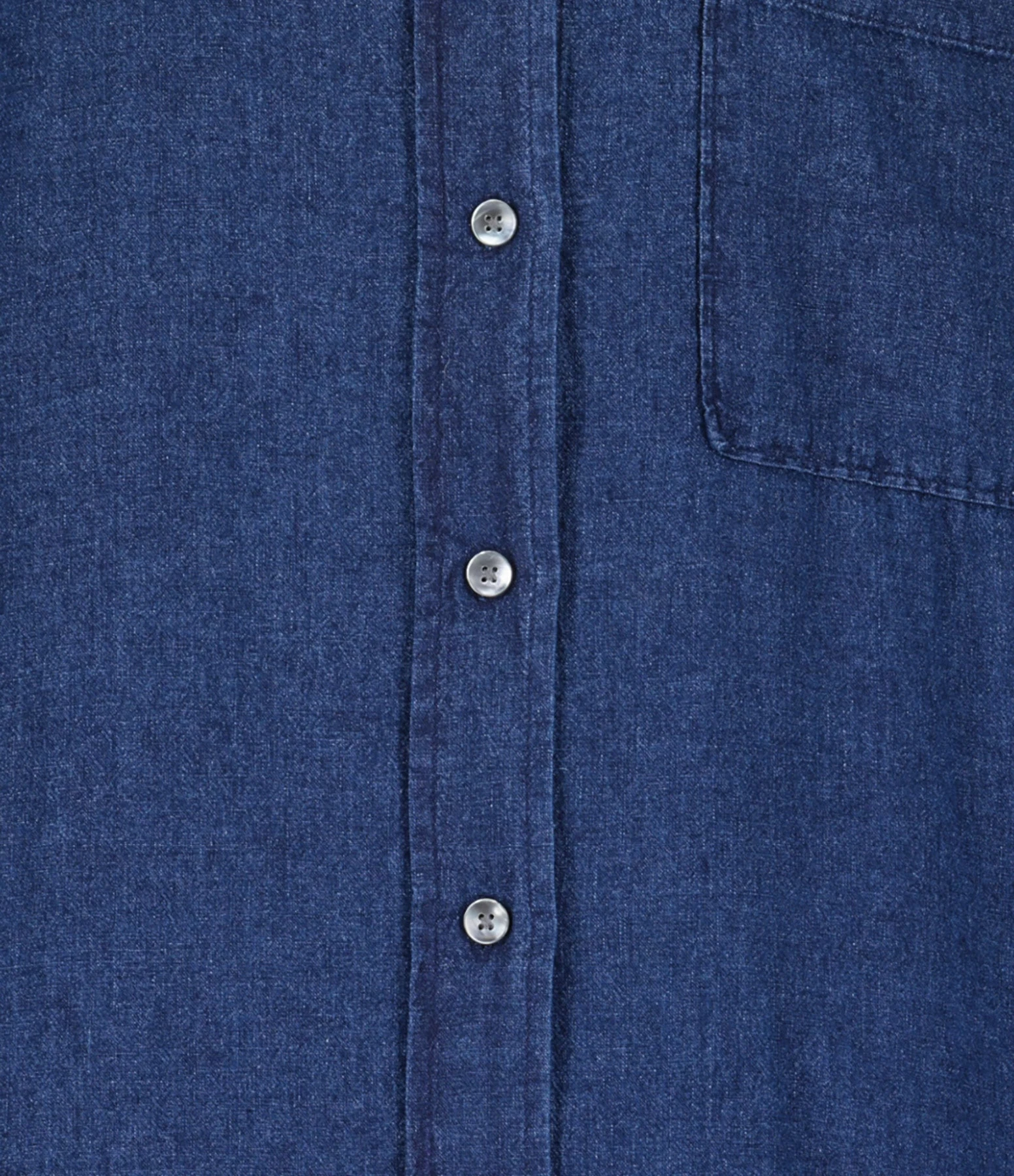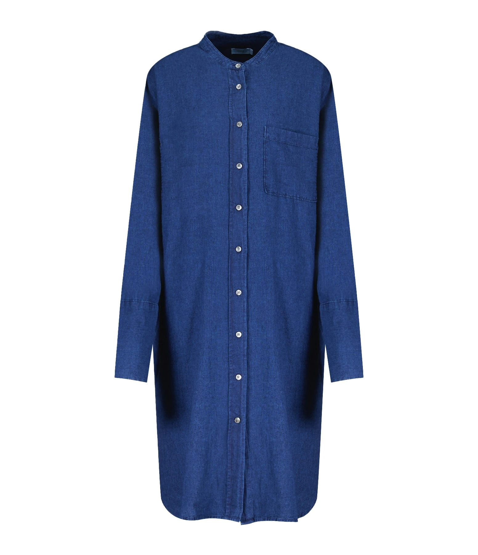 Robe chemise en lin bleu. Col rond. Poche plaquée sur la poitrine. Fermeture par boutons nacré. Deux poches cachées dans les coutures. Coupe ample. Base arrondie, plus longue à l’arrière.