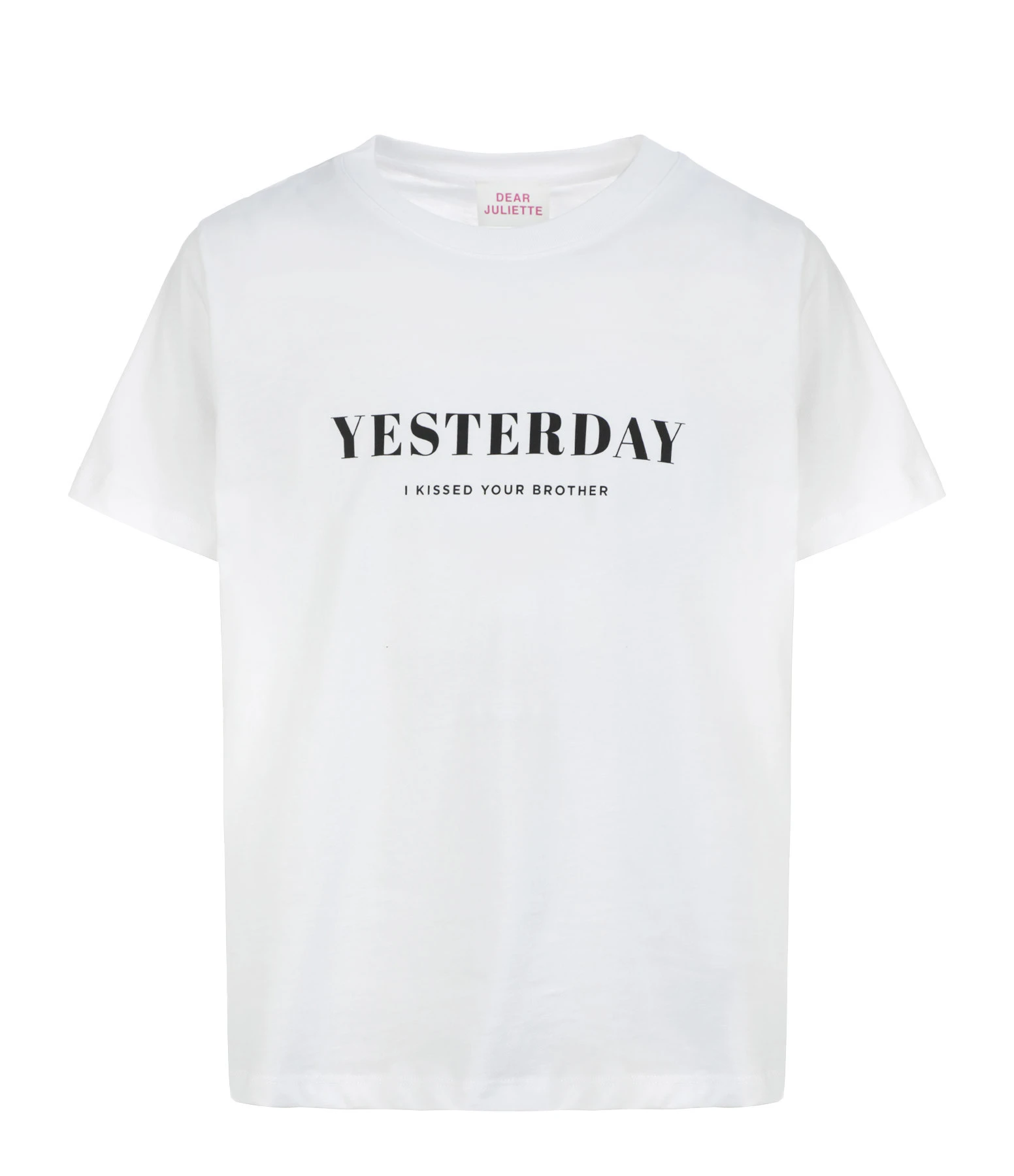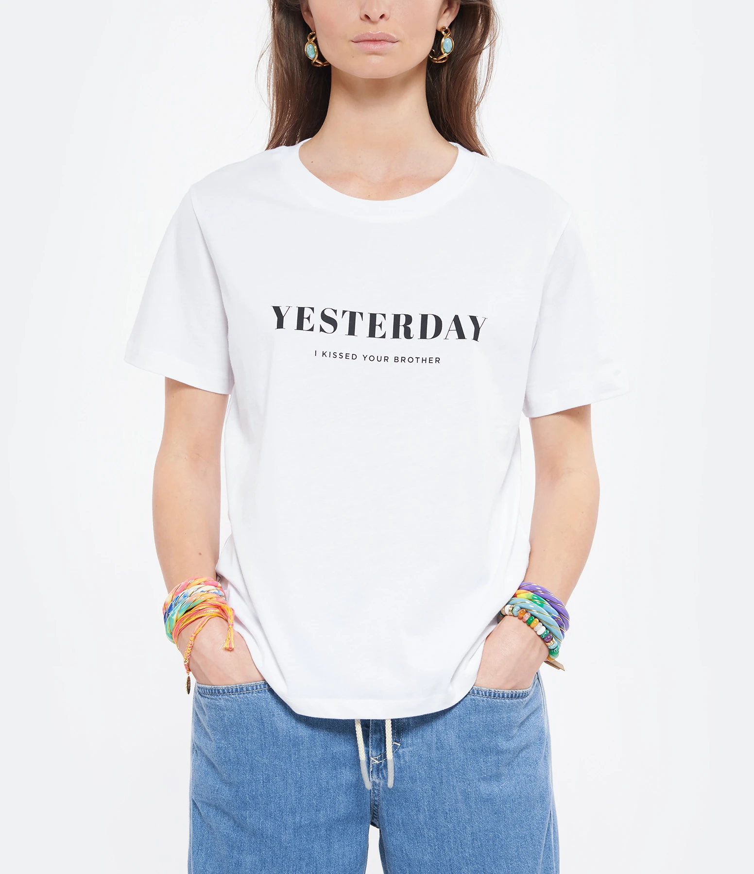 Tee-shirt en coton blanc. Inscription noire « YESTERDAY, I kissed your brother » floquée à l’avant. Col rond. Manches courtes. Coupe droite. Base droite.