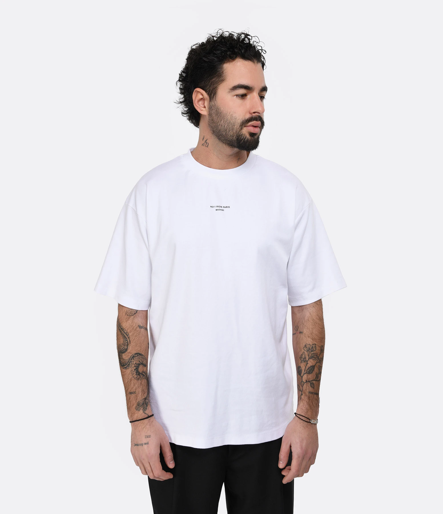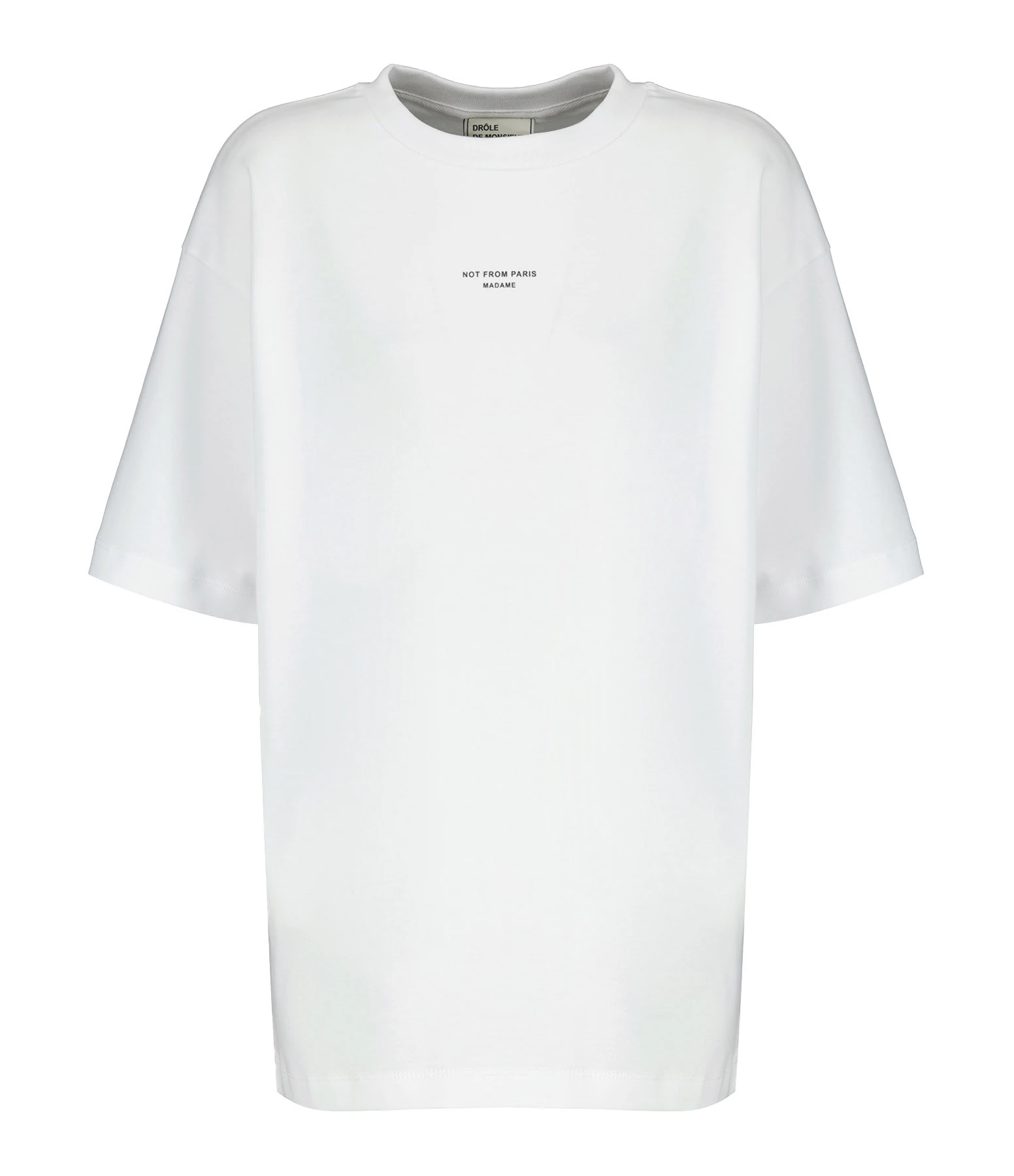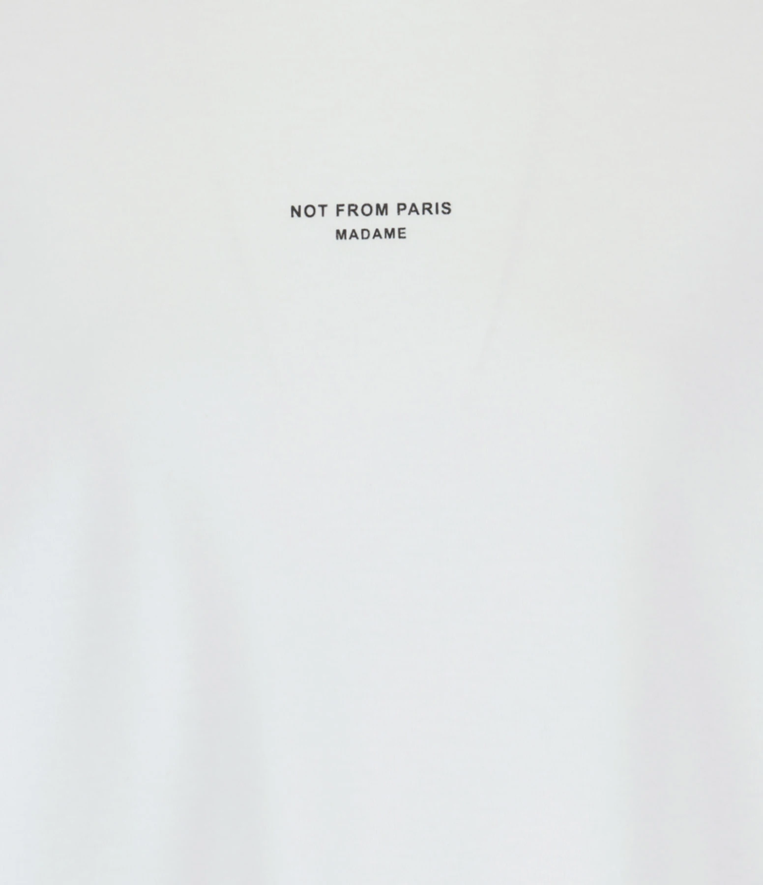 Tee-shirt en coton blanc. Inscription poitrine « NOT FROM PARIS MADAME » sérigraphiée en noir. Col rond côtelé. Manches courtes. Base droite.