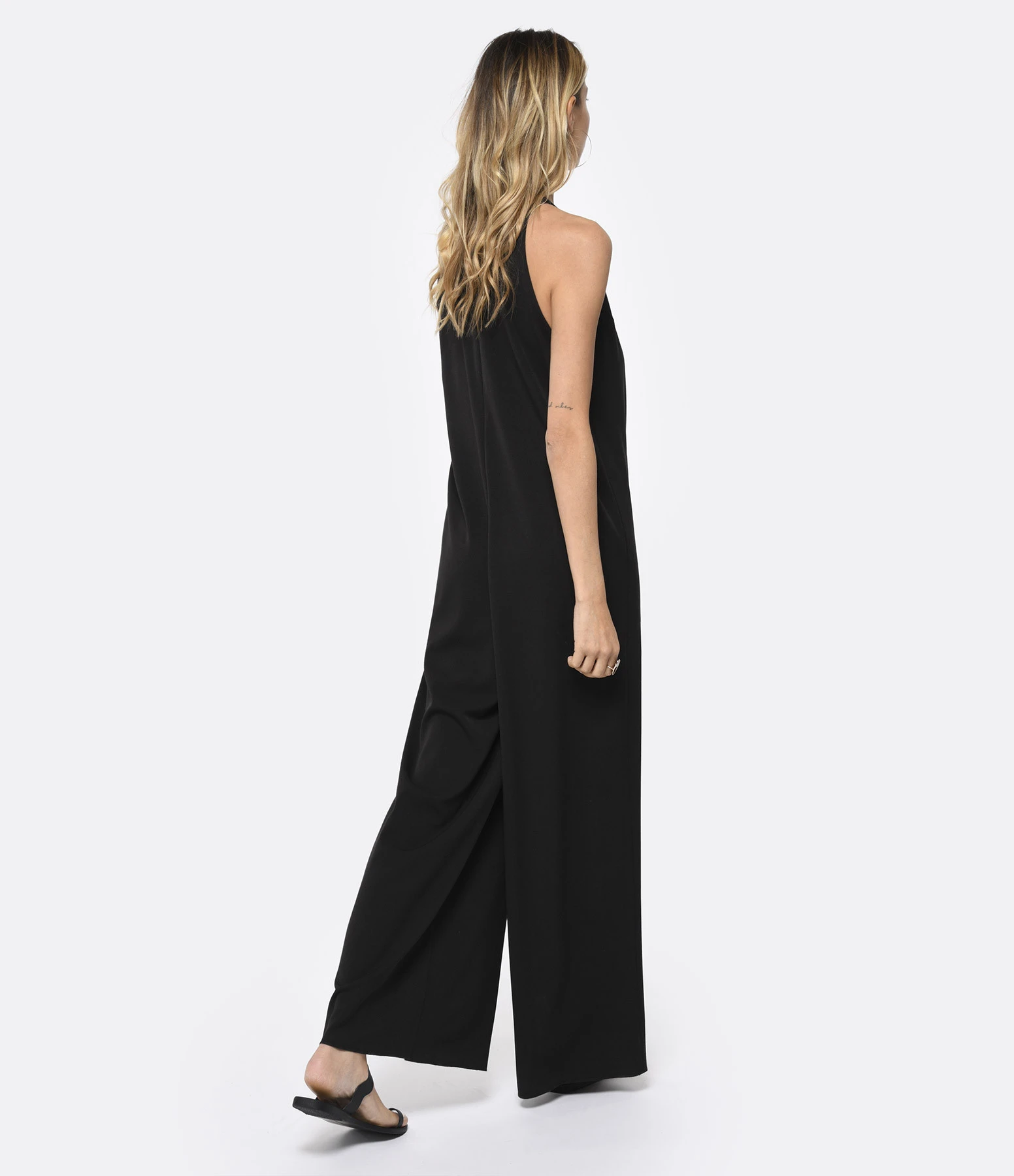 Combinaison pantalon oversize noire sans manches. Col rond avec encolure plongeante. Fermeture par zip dans le dos. Jambes larges avec deux poches côtés.