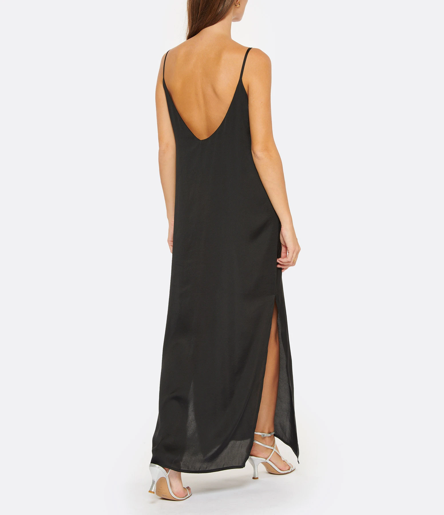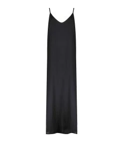 Robe longue en satin de coton noir. Col en V. Fines bretelles. Sans manches. Dos échancré en V. Fentes latérales. Coupe droite. Base droite. Non doublée.