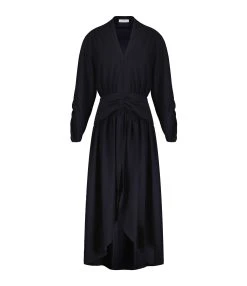 Robe longue bleu marine. Col en V profond avec crochet de réglage. Manches longues avec fronces au niveau des poignets. Taille froncée marquée par une ceinture. Fermeture zippée invisible latérale. Fente milieu devant. Coupe buste ample. Coupe jupe évasée. Base arrondie.