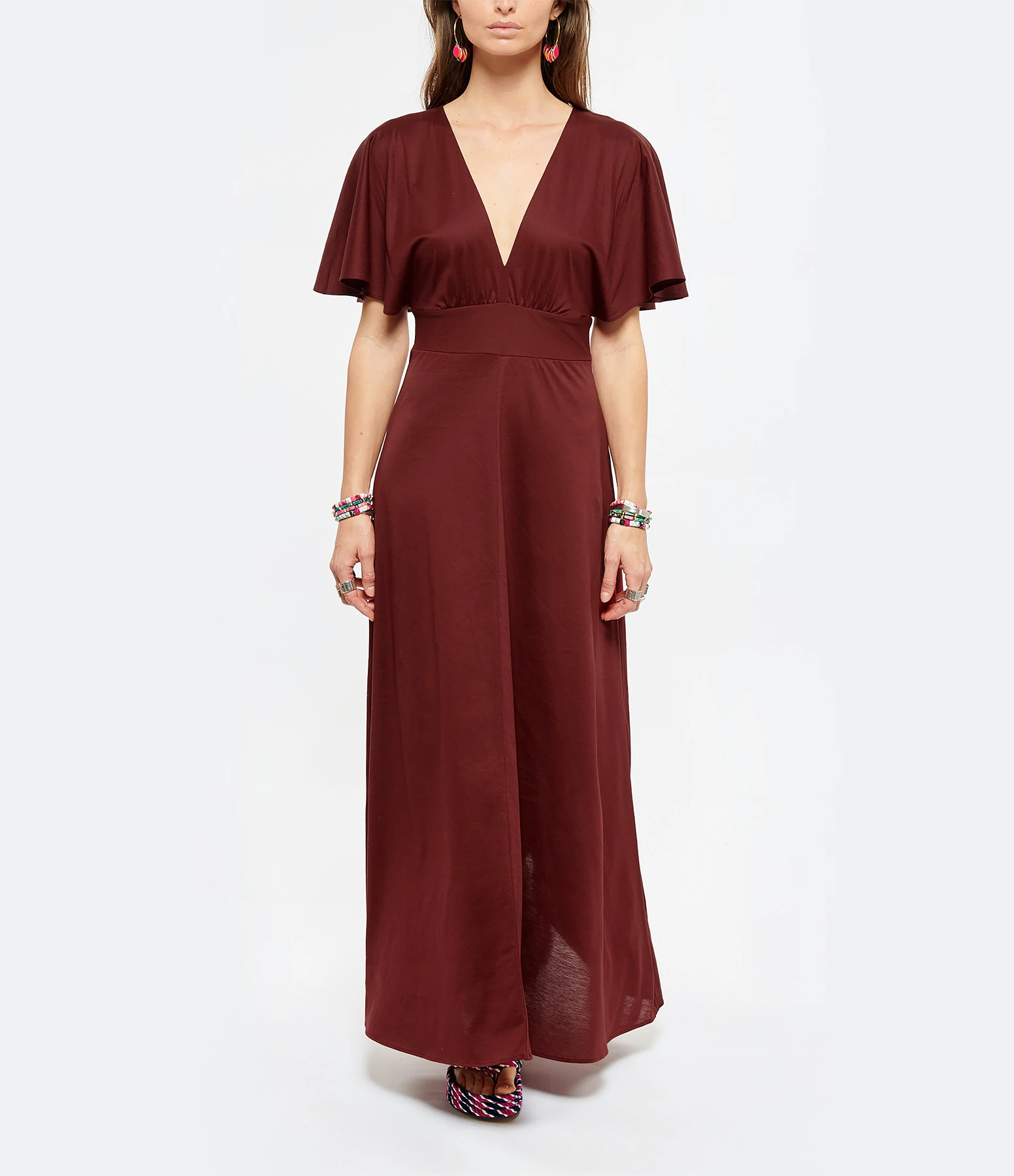 Robe longue en coton bordeaux. Manches courtes évasées. Col plongeant. Coupe droite. Base droite.