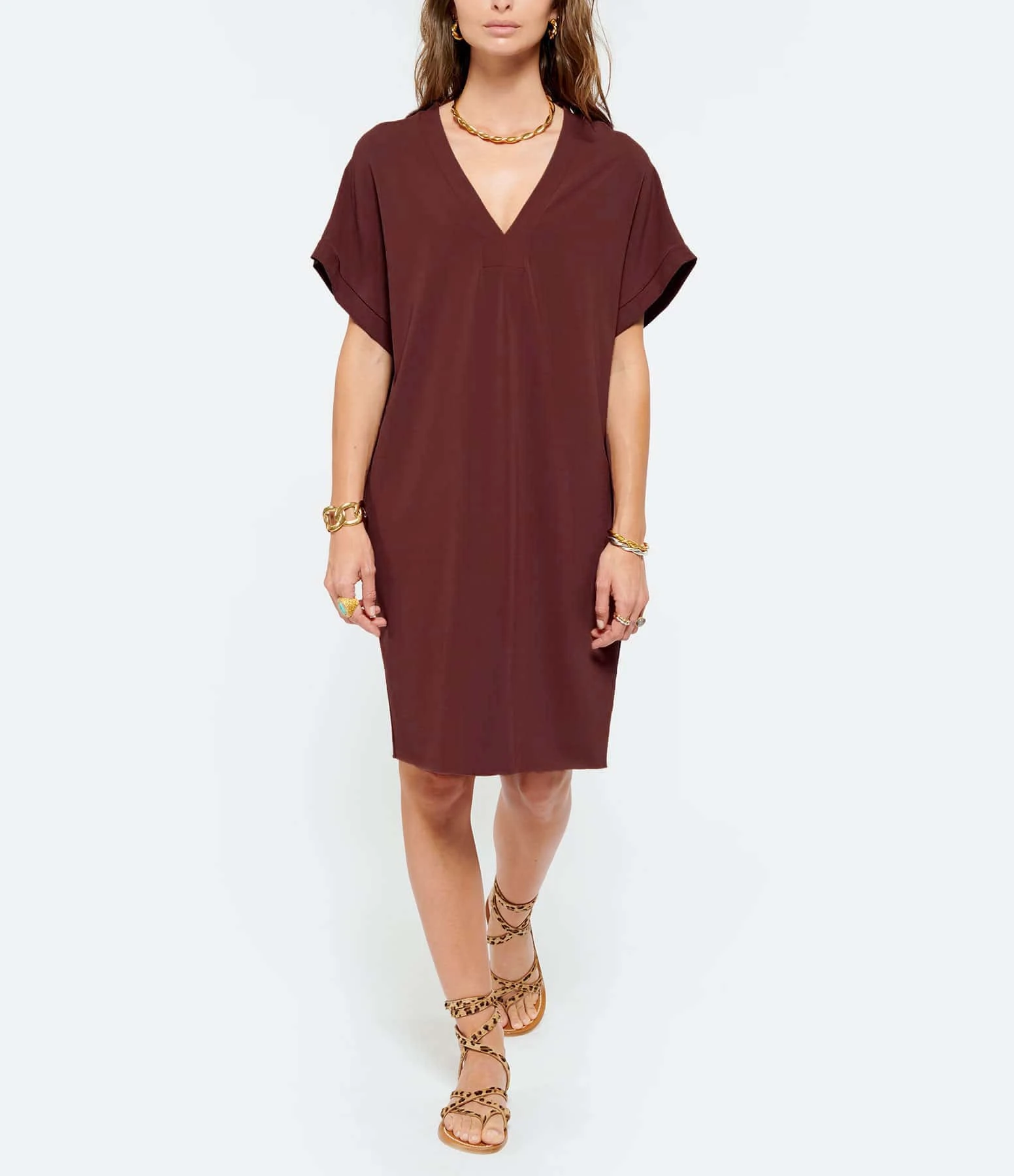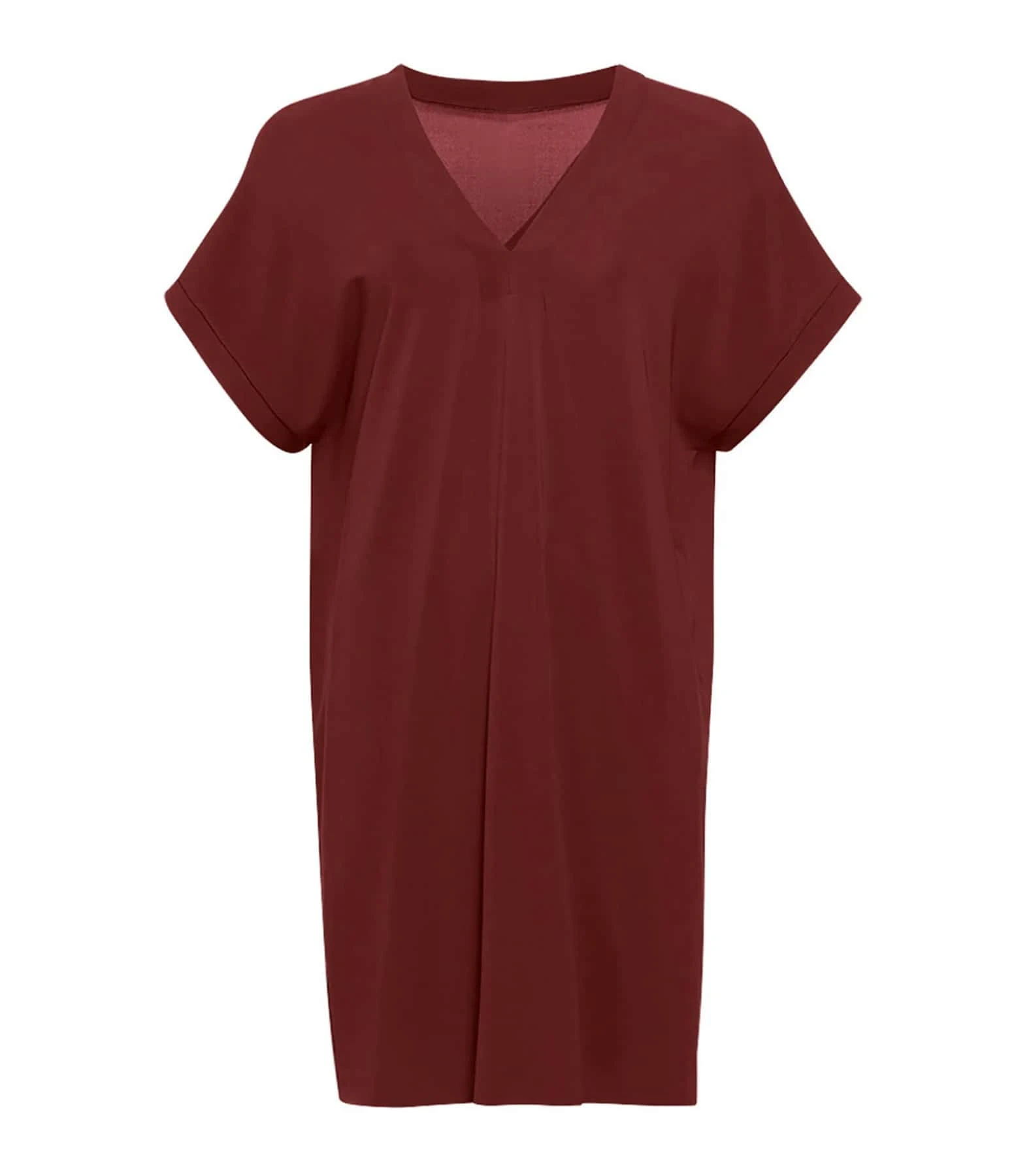 Tunique courte bordeaux. Col en V. Manches courtes. Coupe droite. Base droite à bord franc. Non doublée.
