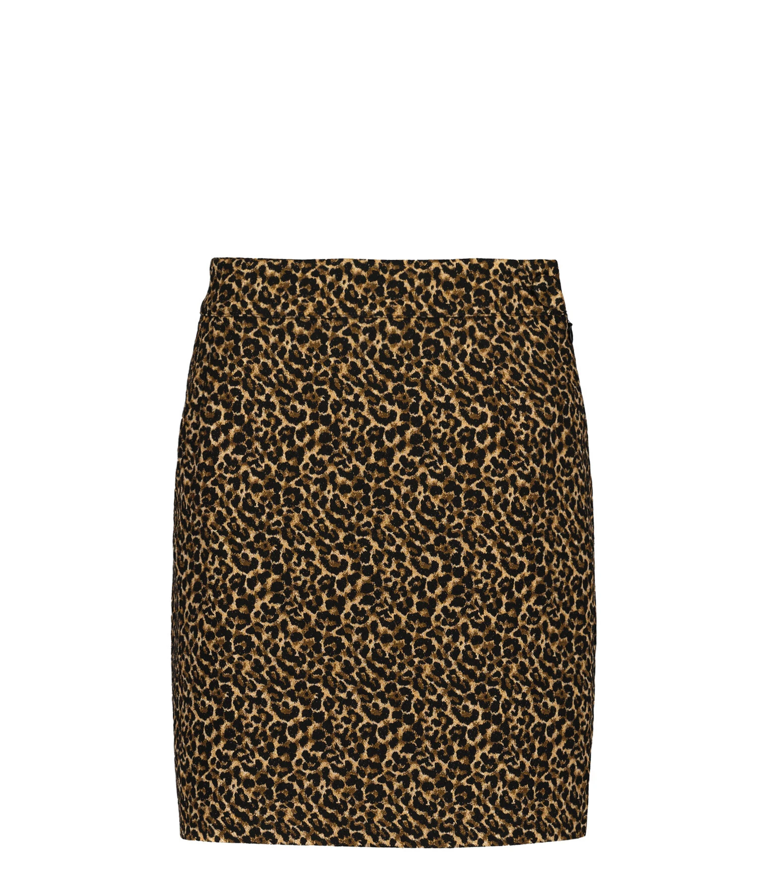 Jupe courte en jacquard à imprimé léopard sublimé par des fils métallisés dorés. Fermeture zippée et boutonnée sur le côté. Bouton recouvert du même tissu. Fente arrière. Coupe près du corps, légèrement trapèze. Base droite. Doublée.