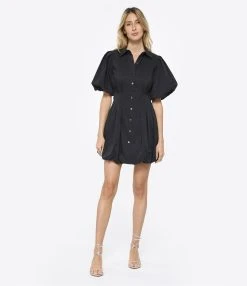 Robe courte en coton rose. Col rond. Fermeture par boutons sur le devant. Ceinture à nouer à la taille. Coupe large. Base droite.