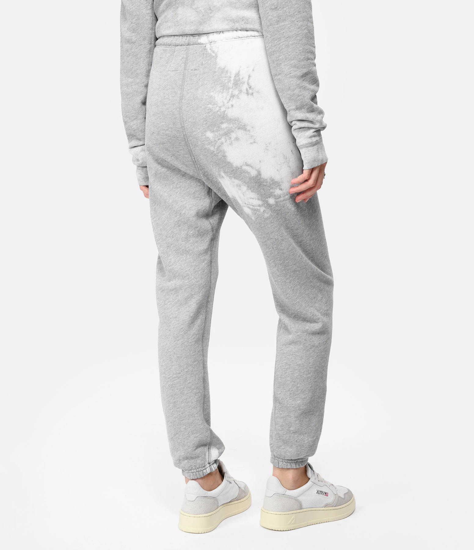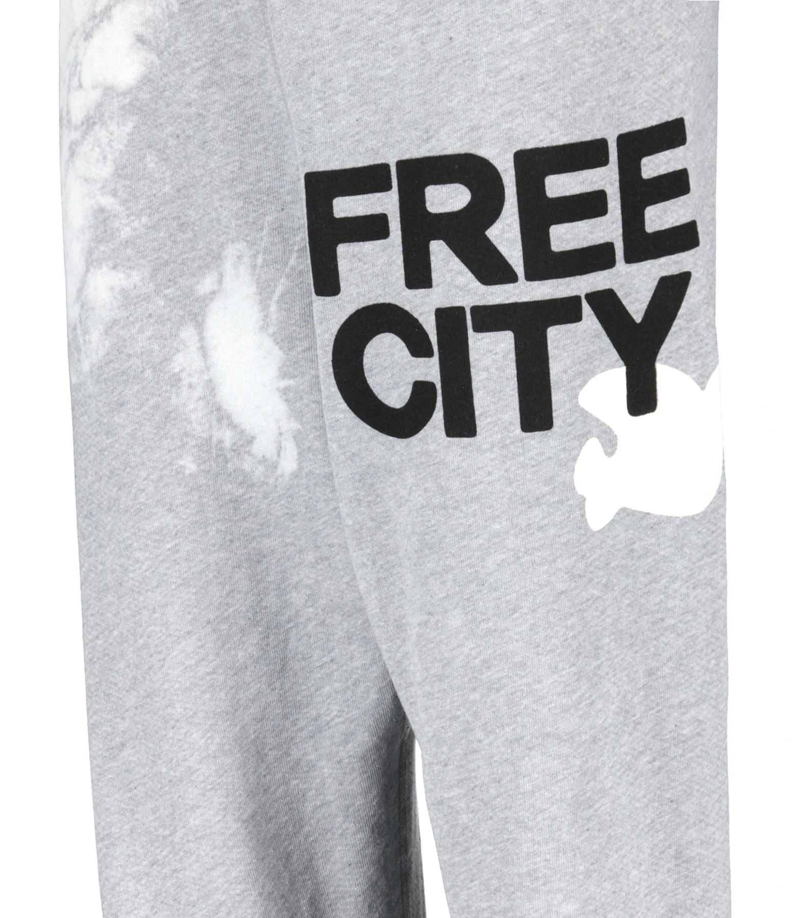 Pantalon jogging en coton molletonné gris à tache blanche pour un effet délavé. Logo Free City flocké sur le devant en noir et blanc. Taille élastiquée avec cordon de serrage intérieur. Coupe droite. Base droite resserrée et élastiquée.