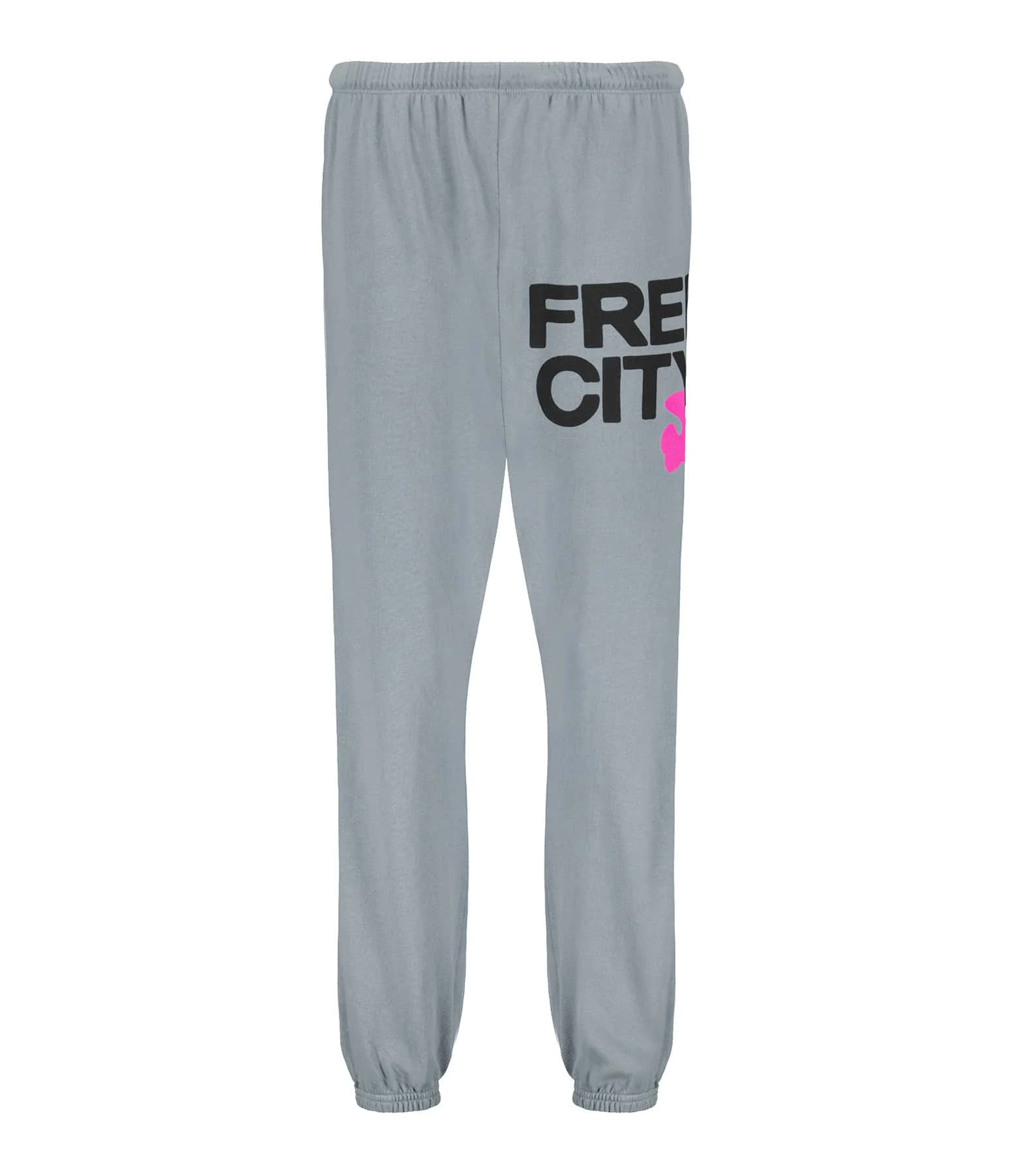 Pantalon jogging en coton molletonné gris avec le logo Free City flocké sur le devant en noir et rose. Taille élastiquée avec cordon de serrage. Coupe droite. Base droite resserrée et élastiquée.
