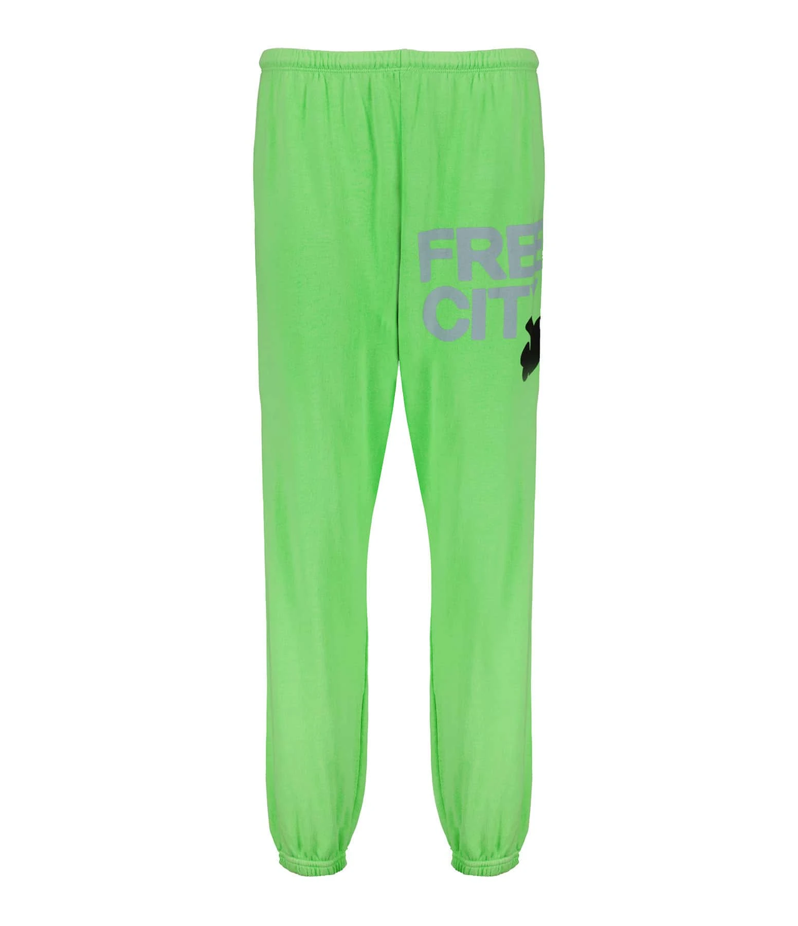 Pantalon jogging en coton molletonné vert avec le logo Free City flocké sur le devant en gris et noir. Taille élastiquée avec cordon de serrage. Coupe droite. Base droite resserrée et élastiquée.