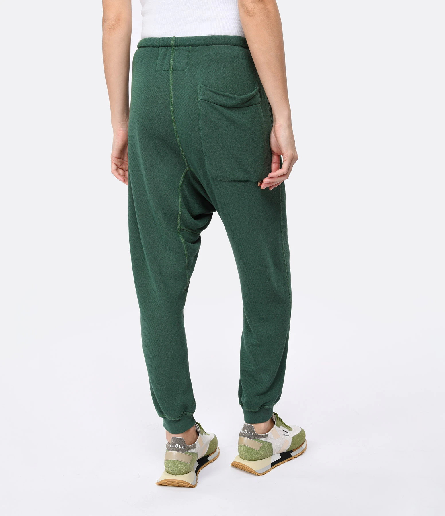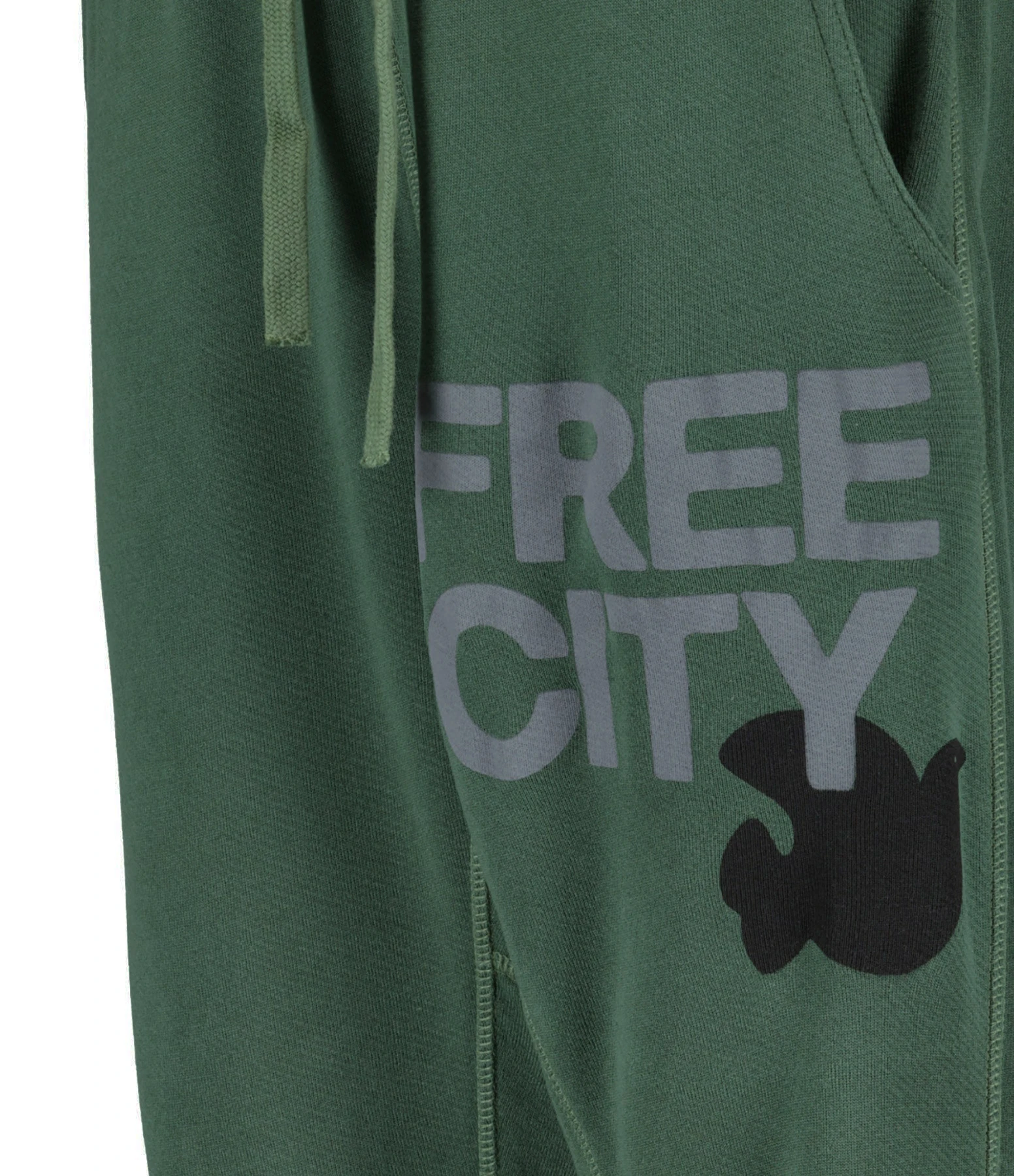 Pantalon jogging en coton molletonné vert foncé avec le logo Free City flocké sur le devant en gris et noir. Taille élastiquée avec cordon de serrage intérieur. Coupe droite. Base droite resserrée et élastiquée.