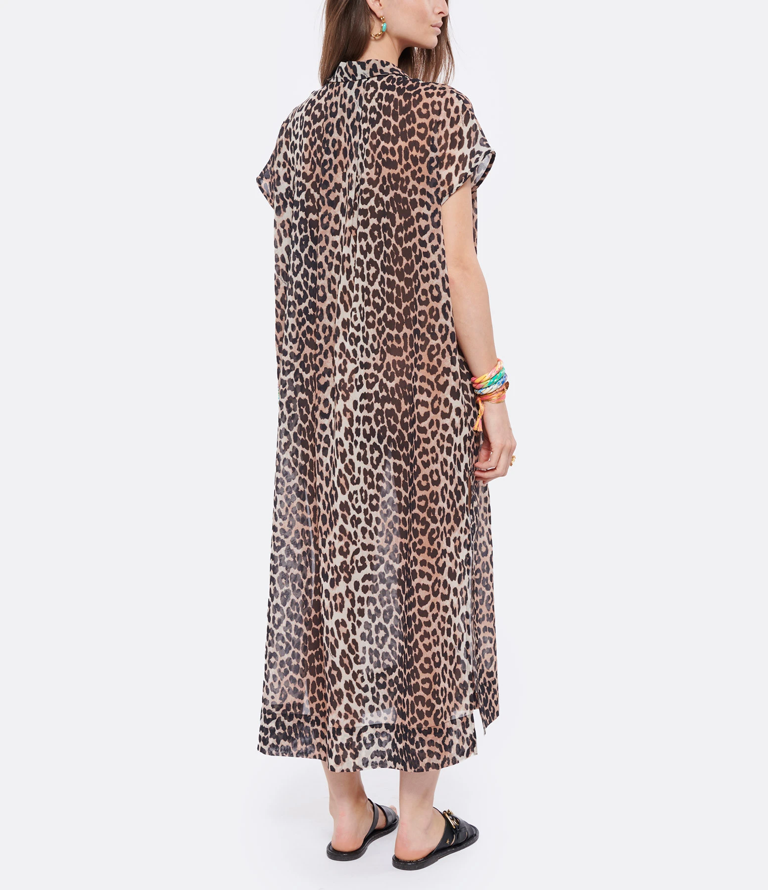 Robe longue sans manches imprimée léopard. Logo « Ganni » imprimé côté cœur. Tissu légèrement transparent. Col chemisier. Encolure en V. Grandes fentes latérales. Coupe droite. Base droite.