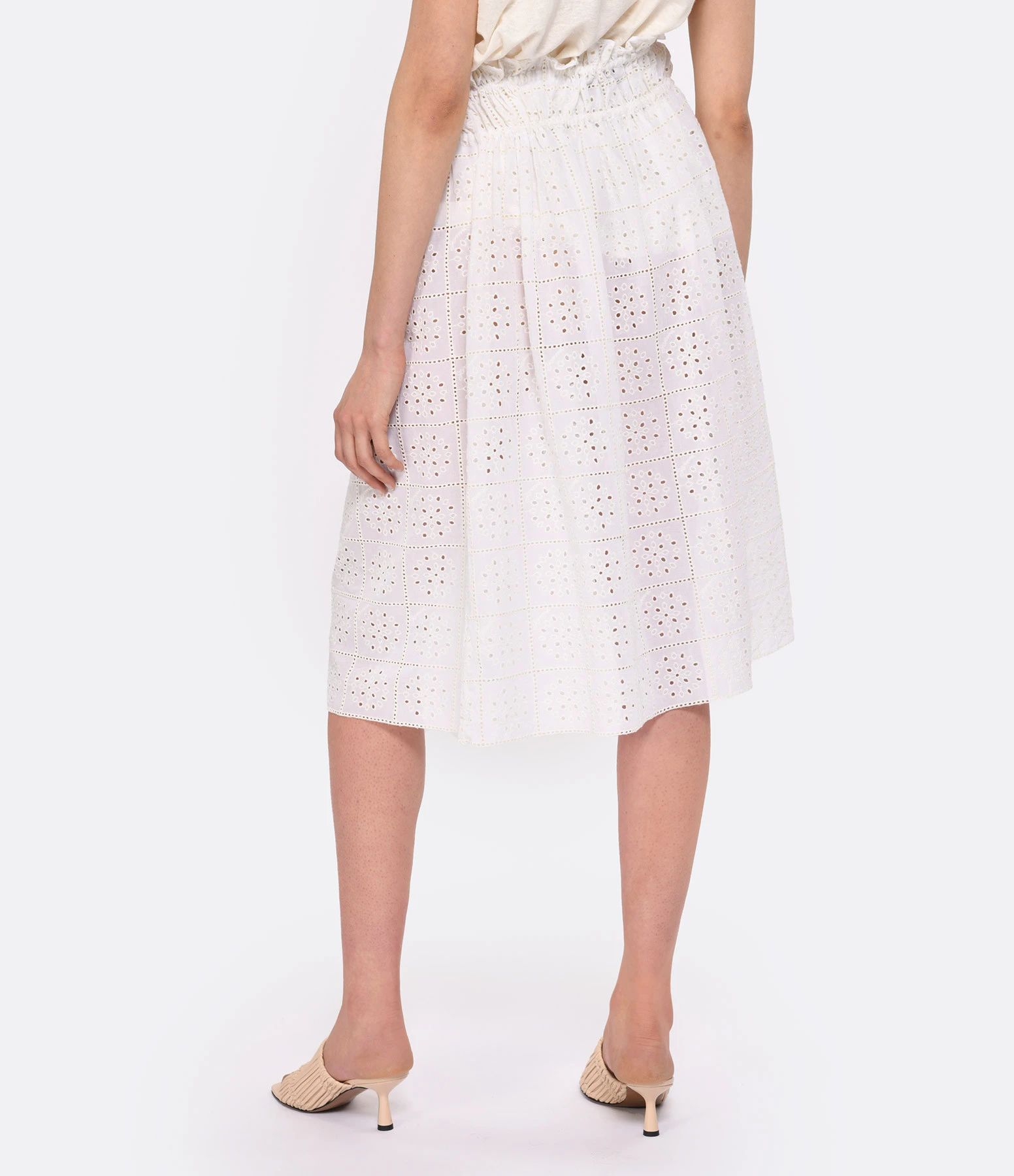 Jupe mi-longue en coton blanc effet broderie anglaise. Taille élastiquée avec lien de serrage. Ajouré. Coupe évasée. Base droite. Non doublée.
