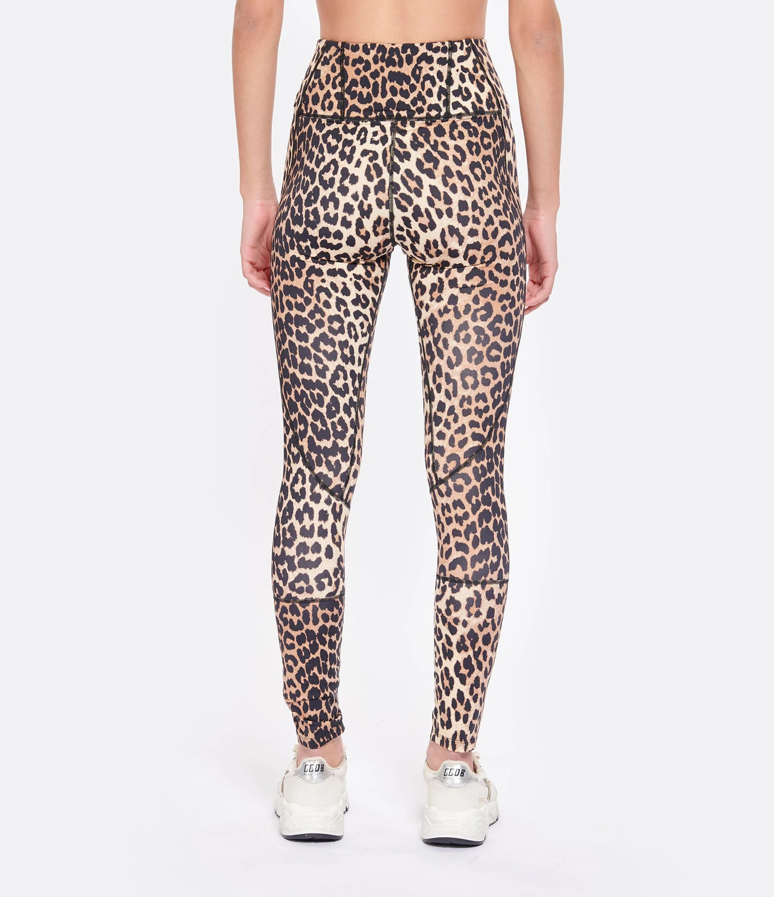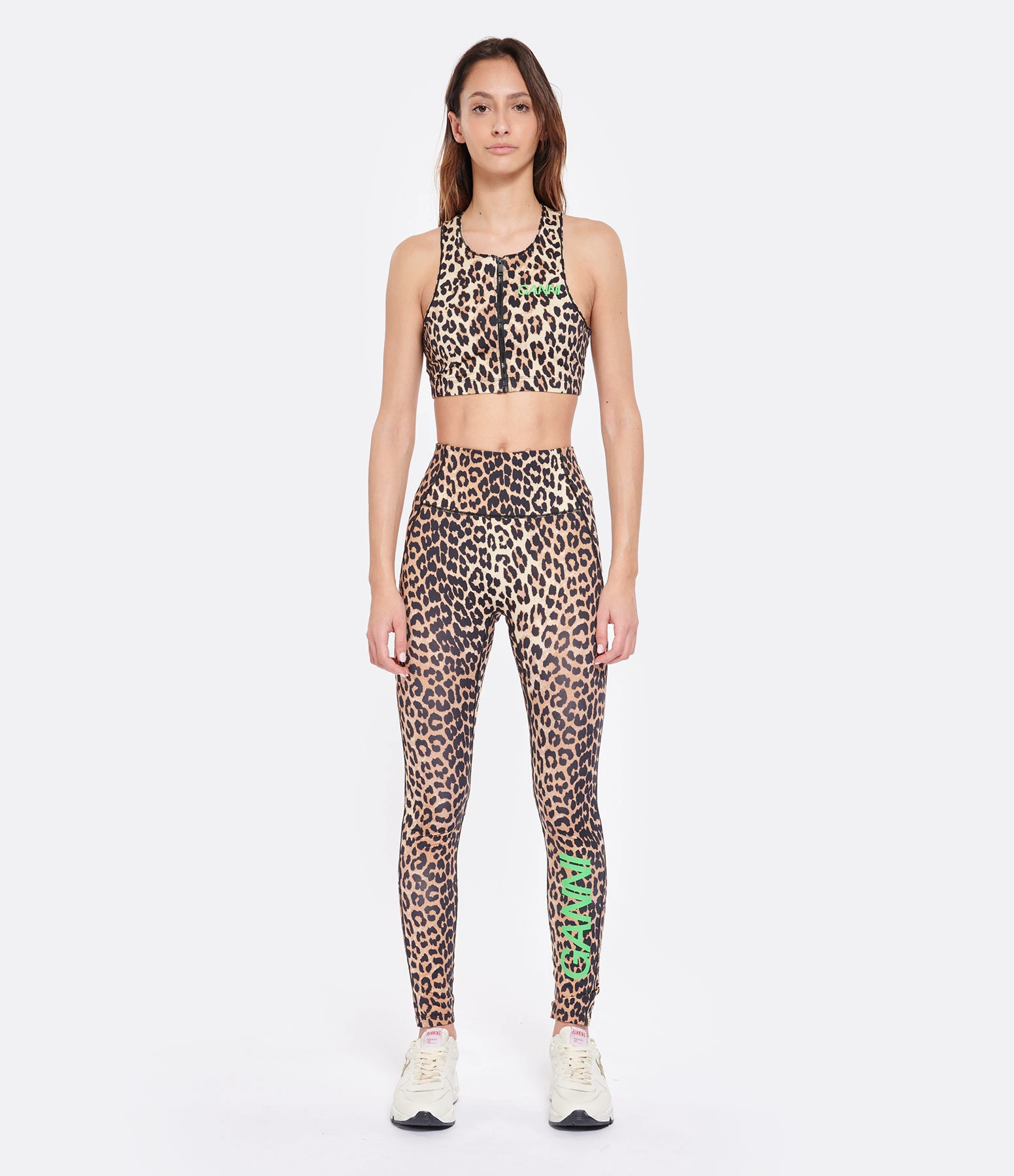 Legging imprimé léopard. Inscription « GANNI » en vert sur la jambe gauche. Taille élastiquée.