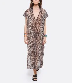 Robe de plage en crochet de coton rose avec l’inscription « GANNI » brodée en noir sur le devant. Col rond. Sans manches. Dos échancré en forme arrondi avec lien à nouer dans la nuque. Coupe droite. Ourlet festonné.