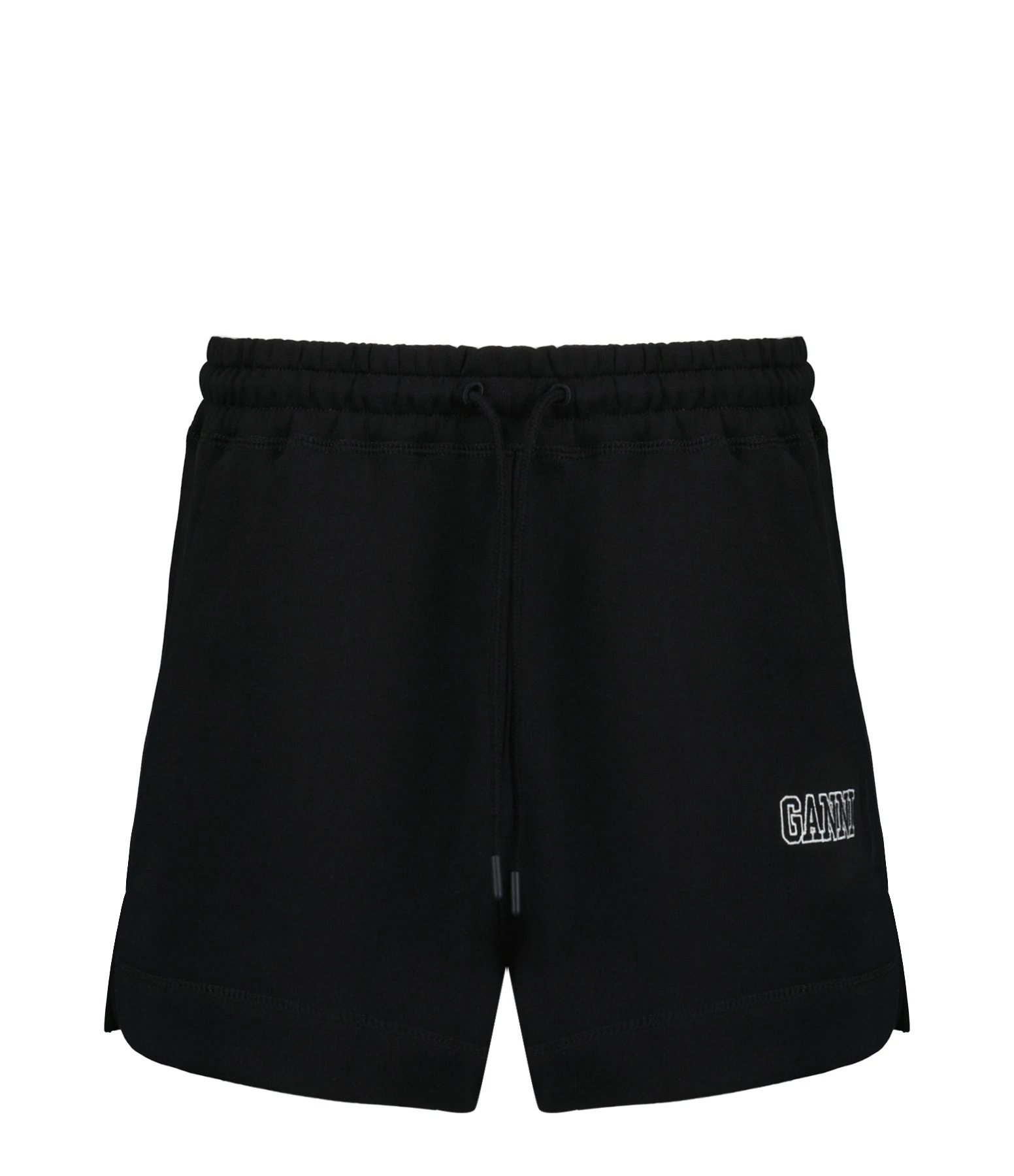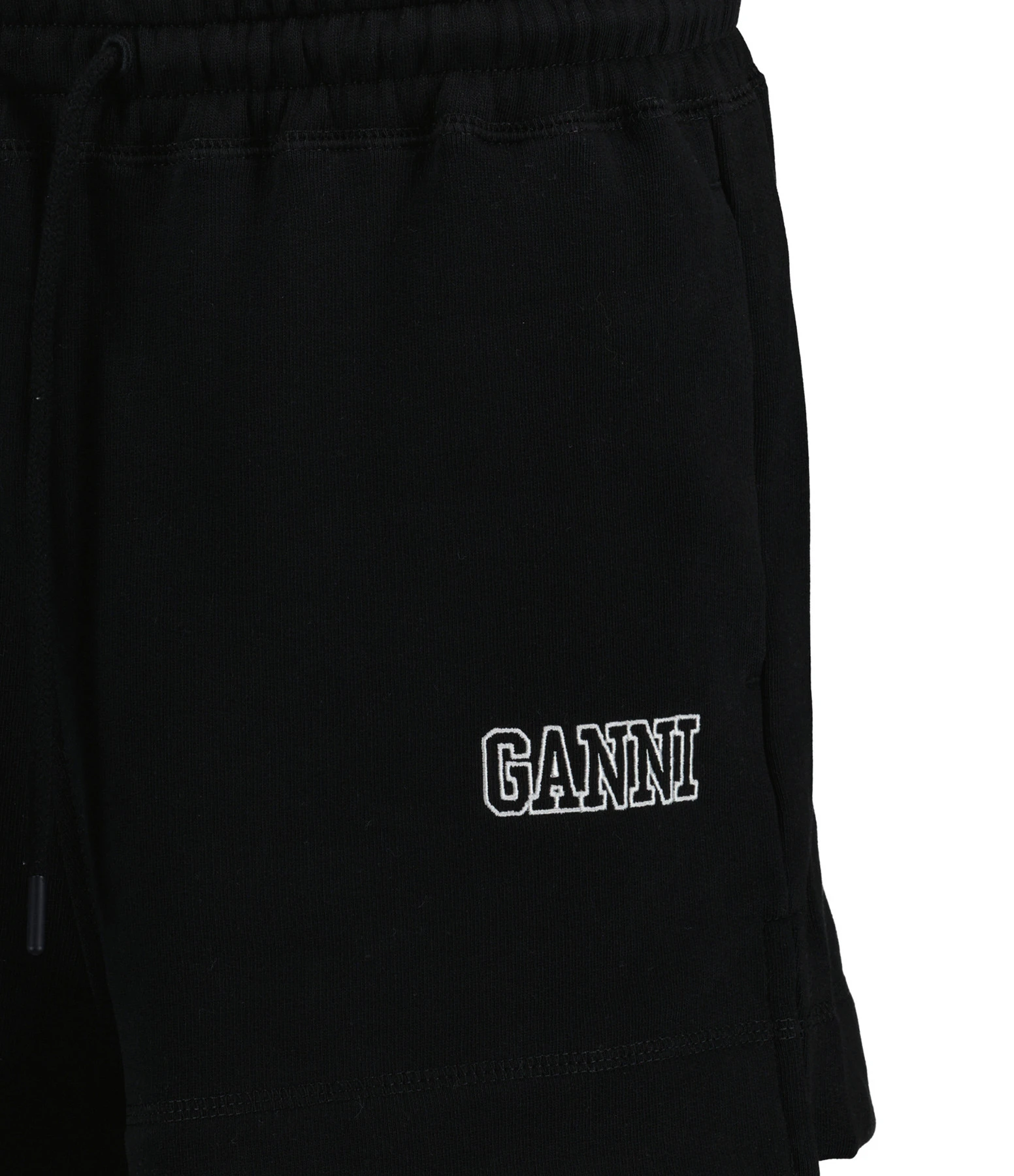 Short en coton molletonné noir. Logo « GANNI » brodé en blanc. Deux poches italiennes. Taille élastiquée avec liens de serrage. Fentes latérales.