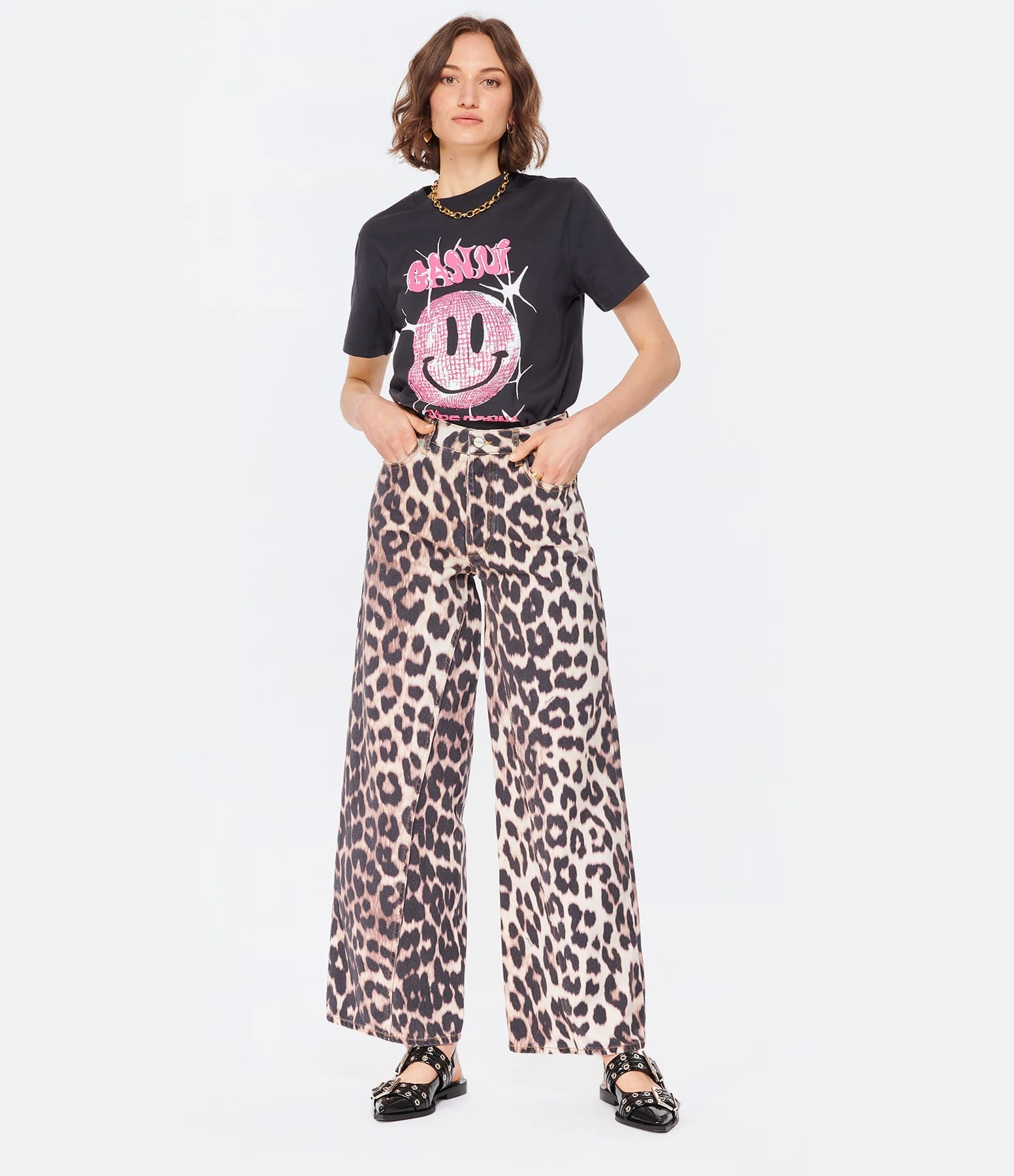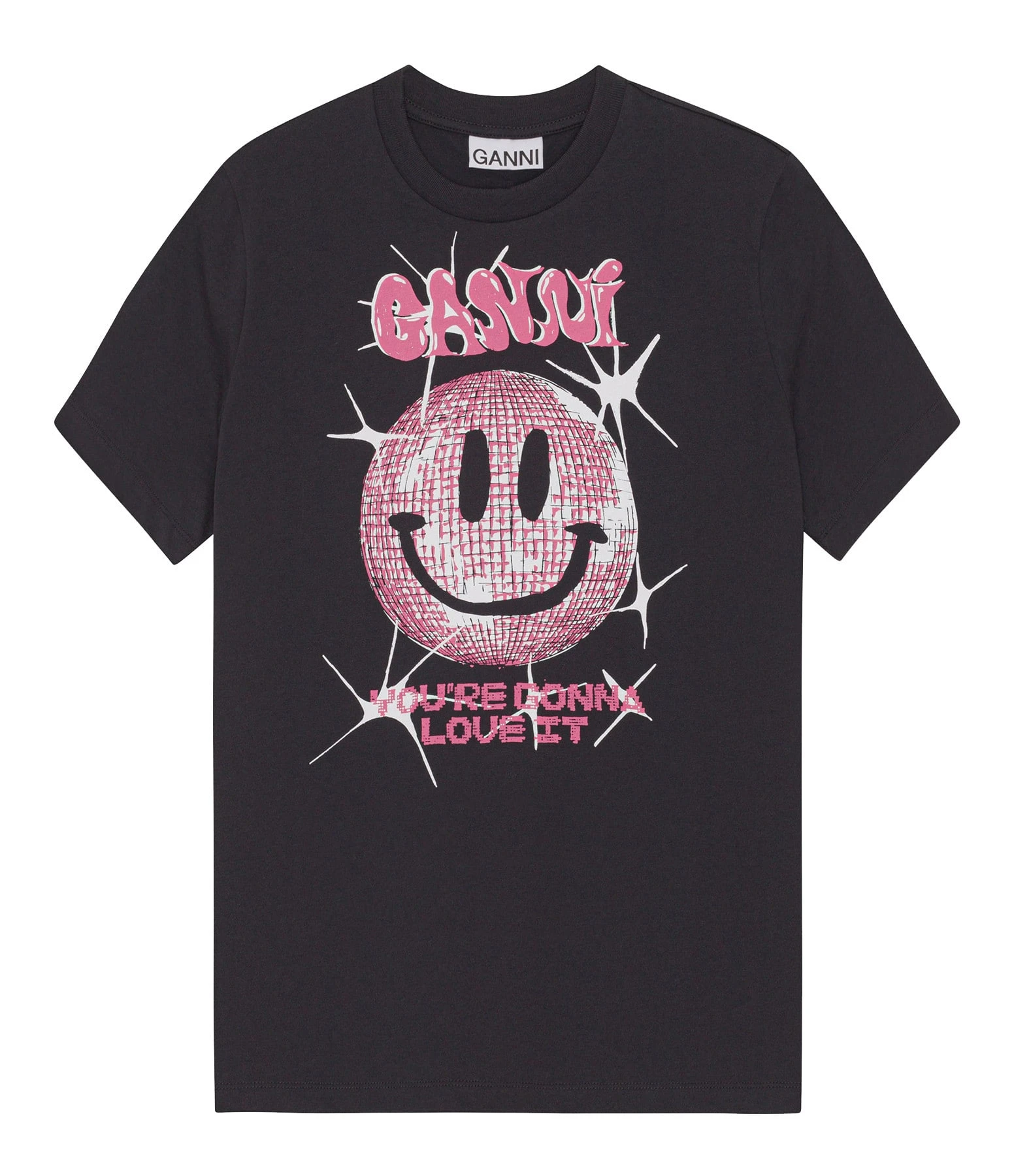 Tee-shirt en coton noir avec un graphique flocké présentant le logo, un smiley et l’inscription « You’re gonna love it » dans des tons roses et blancs sur le devant. COl rond côtelé. Manches courtes. Coupe ample. Base droite.