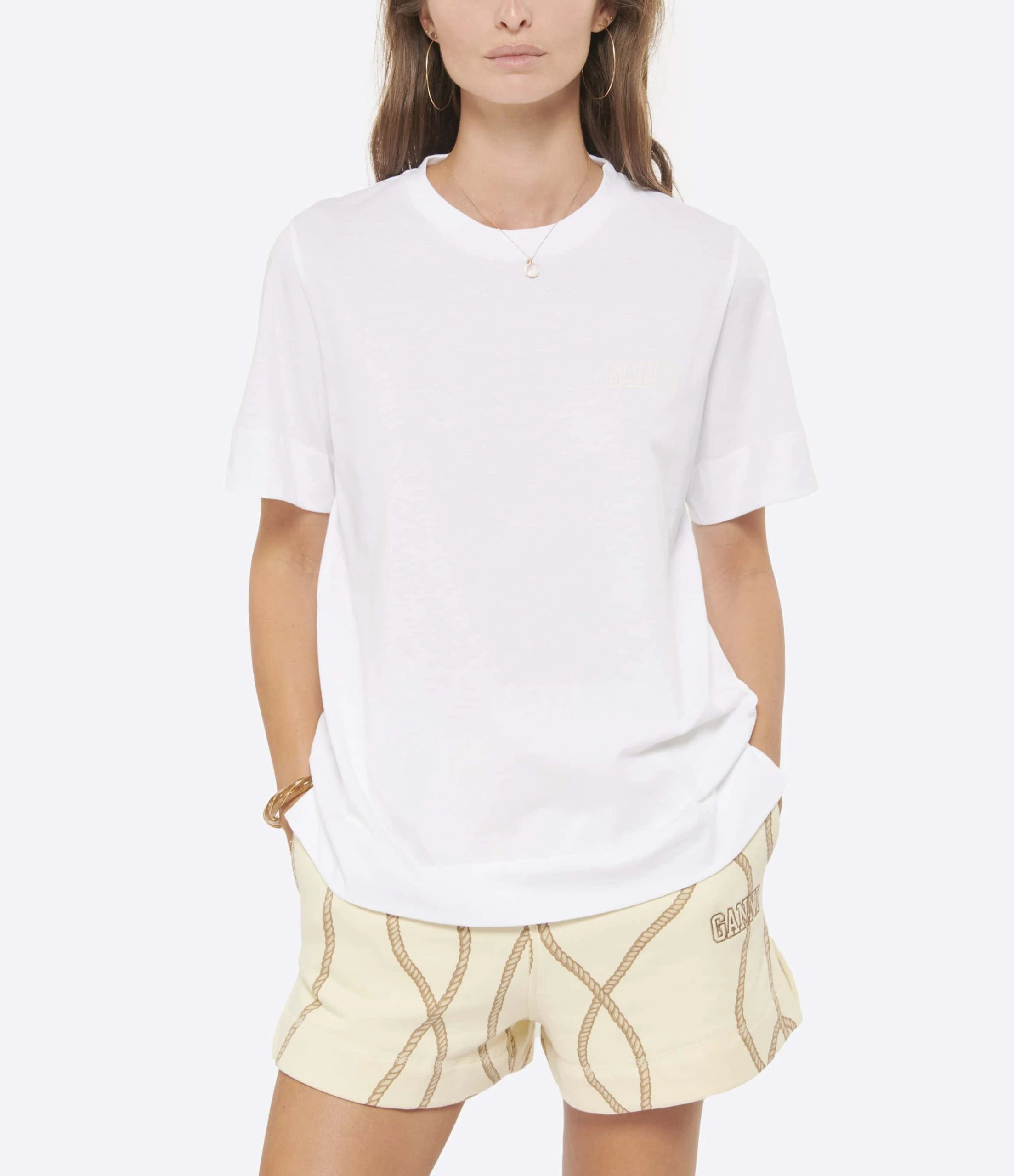 Tee-shirt en coton blanc. Col rond. Manches courtes. Broderie blanche « GANNI » sur la poitrine. Coupe droite. Base droite. Petites fentes sur les cotés.