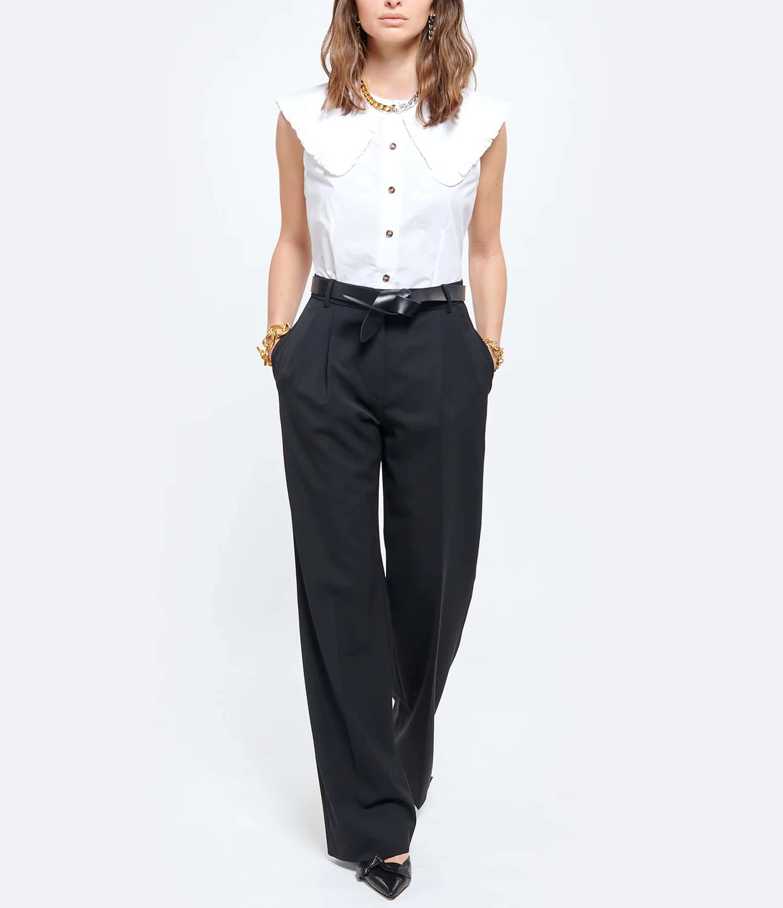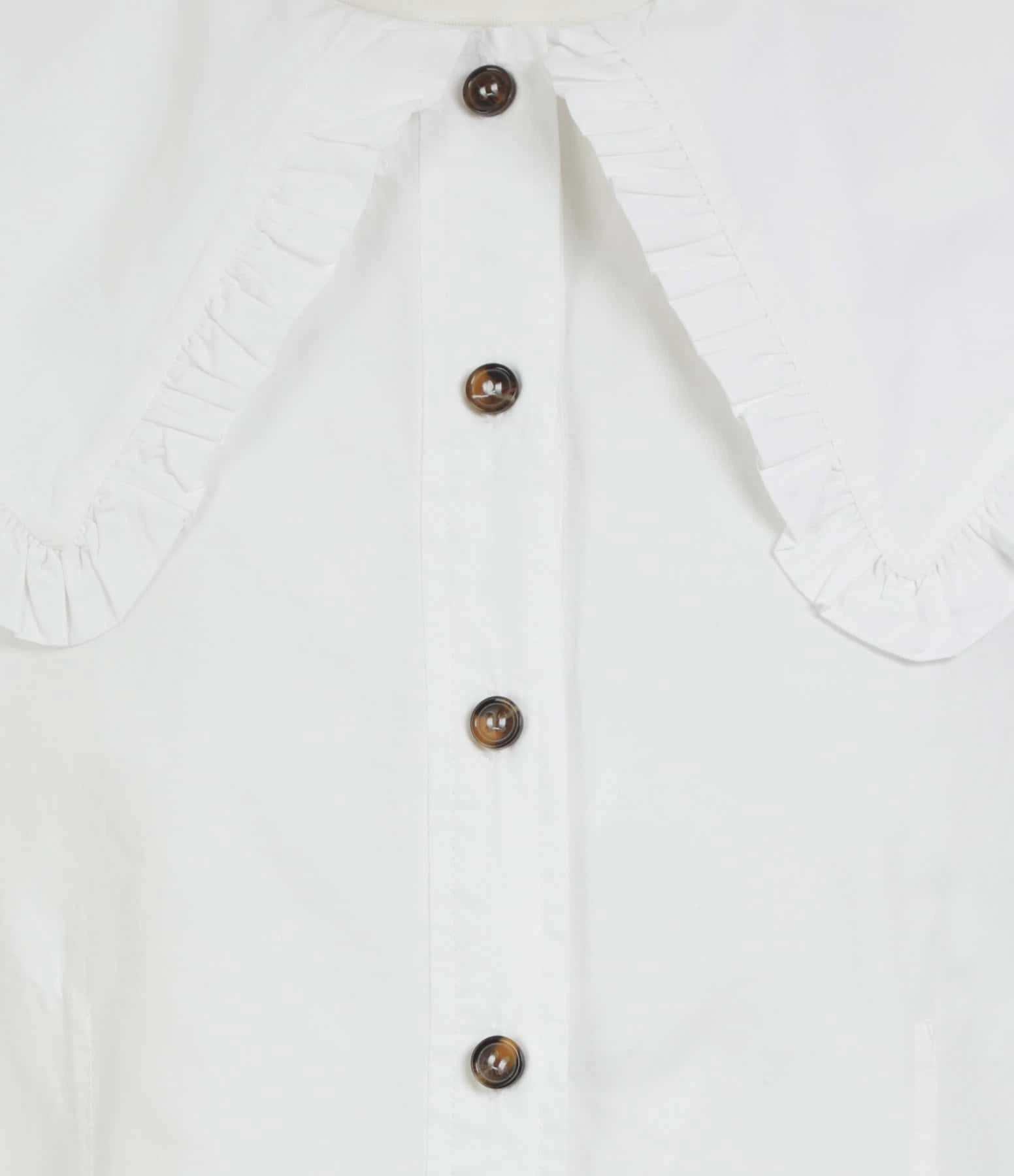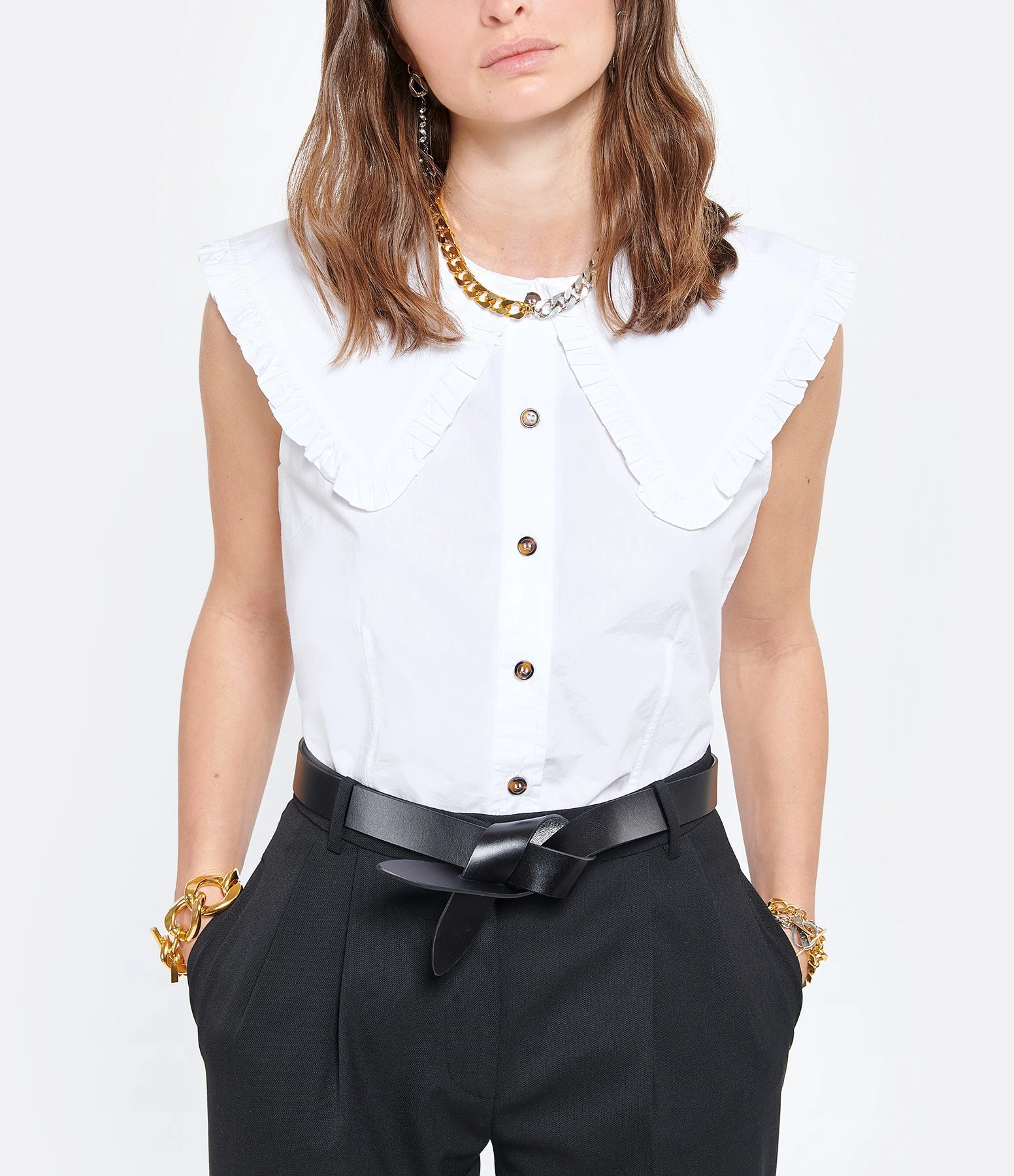 Chemise sans manches en coton biologique blanc. Col pelle à tarte volanté. Fentes latérales incurvées. Fermeture par boutons. Coupe droite. Base arrondie. Non doublée.