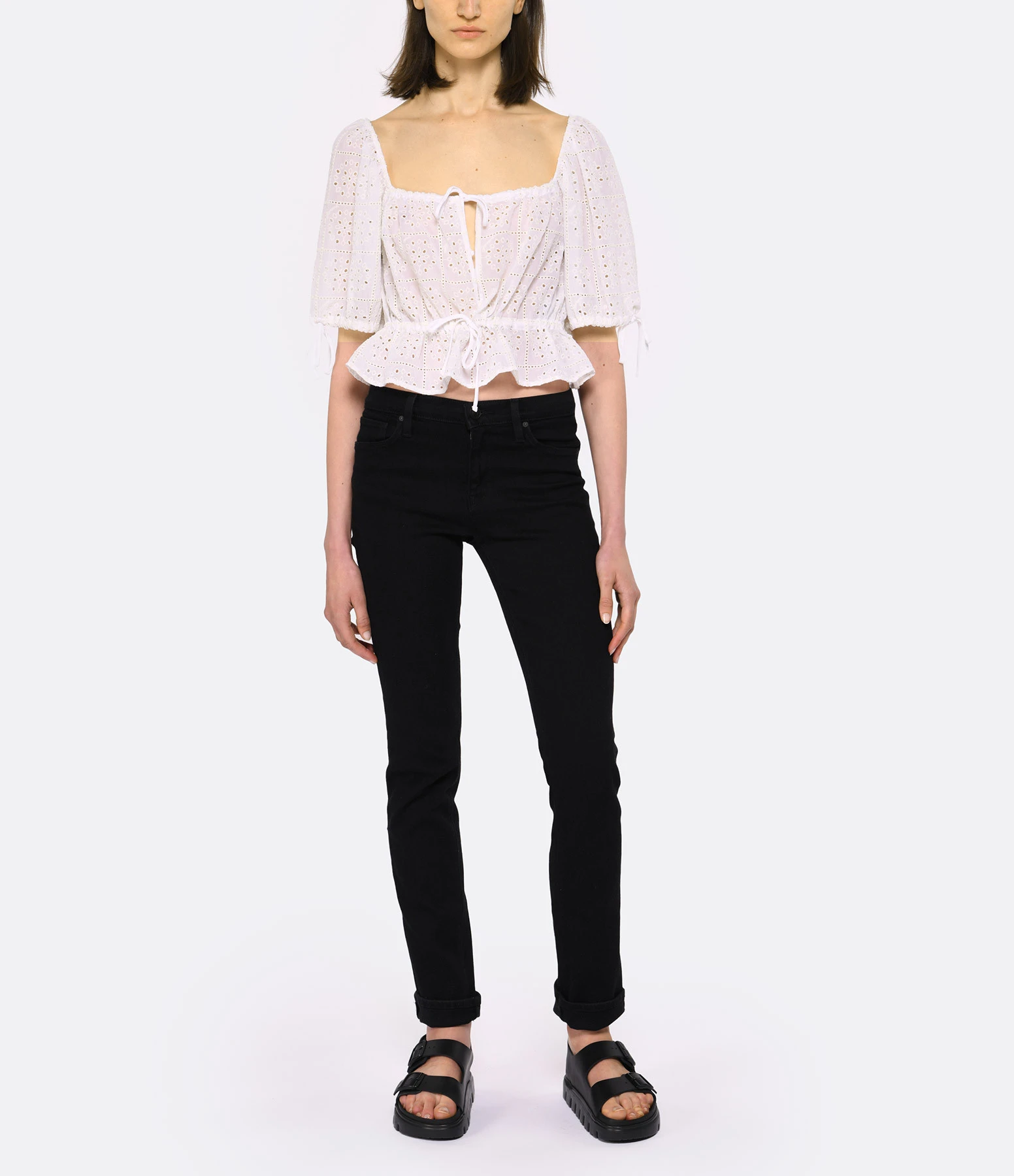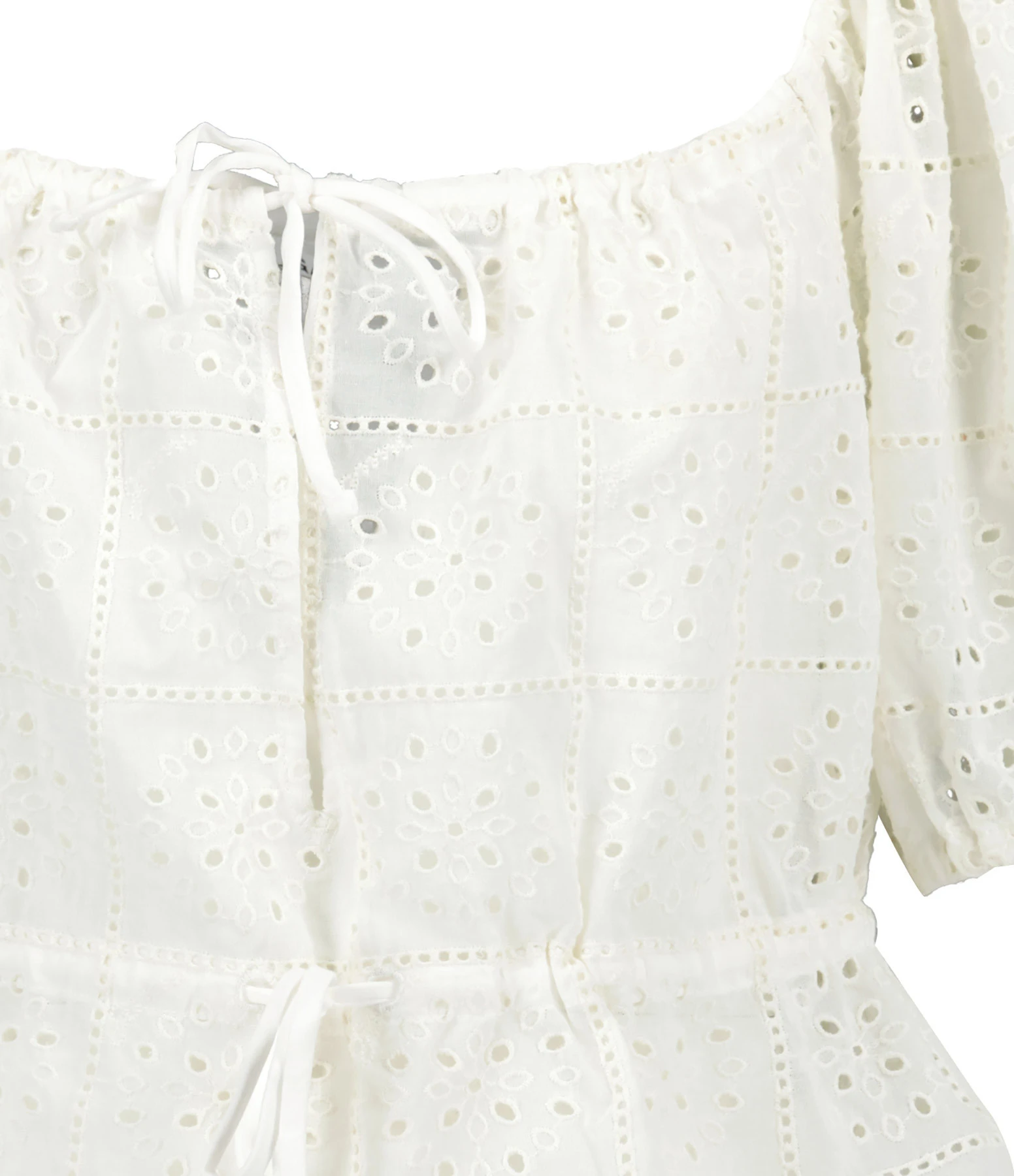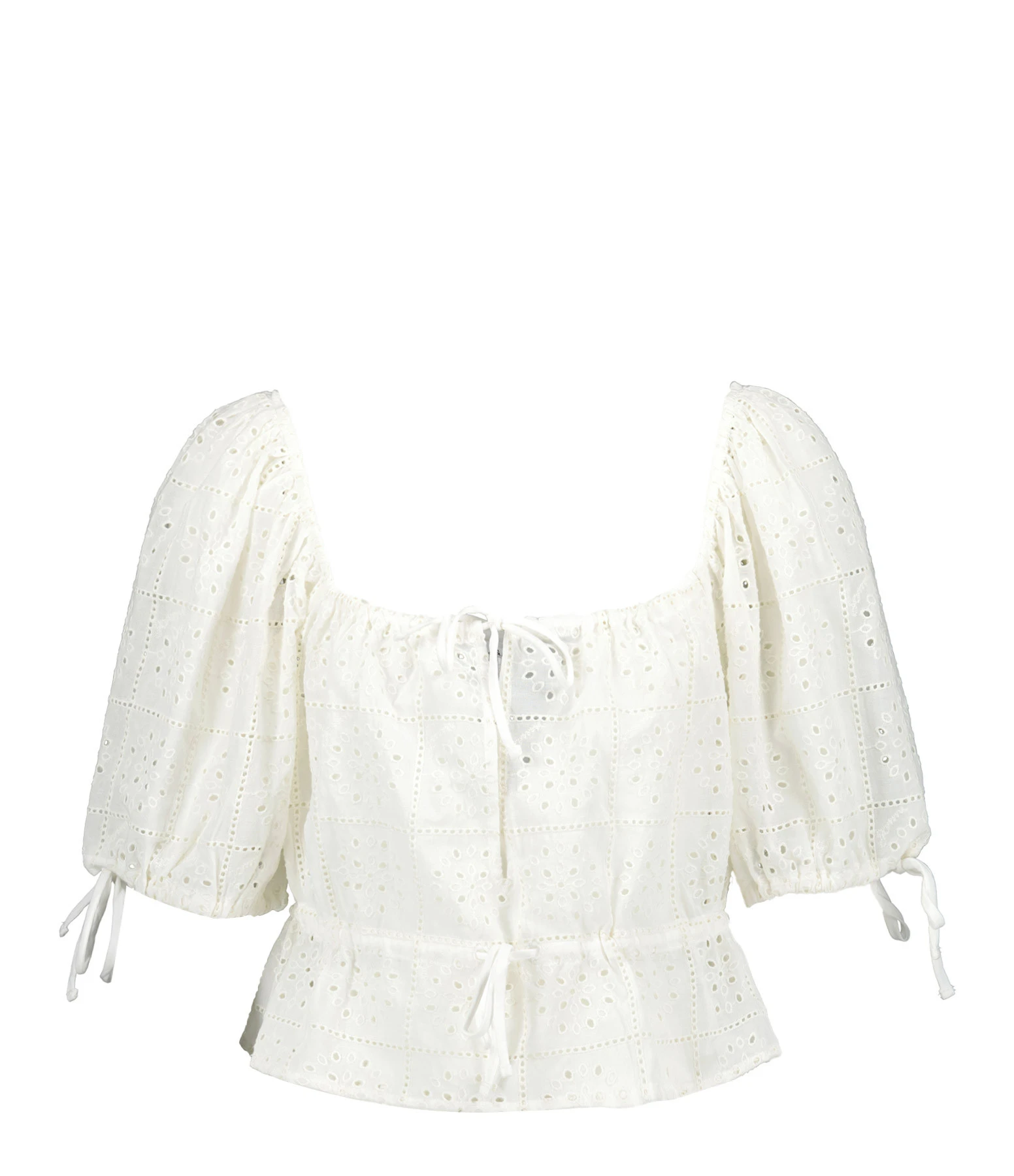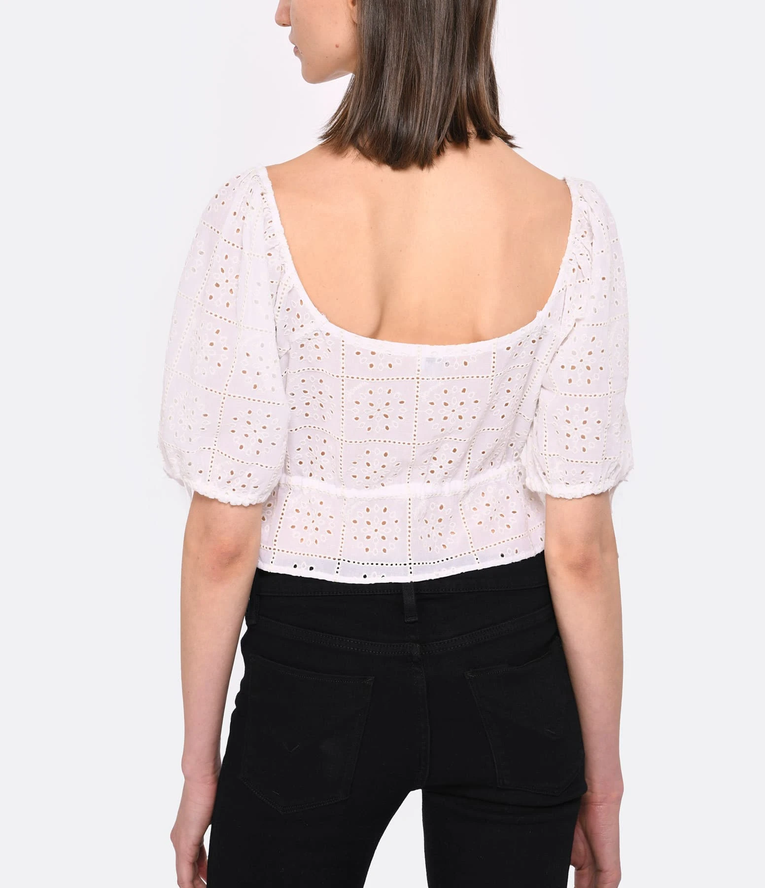 Top court en coton blanc effet broderie anglaise. Ajouré. Manches courtes bouffantes avec lien de serrage. Encolure carrée avec lien de serrage. Coupe droite. Base légèrement volantée. Non doublé.