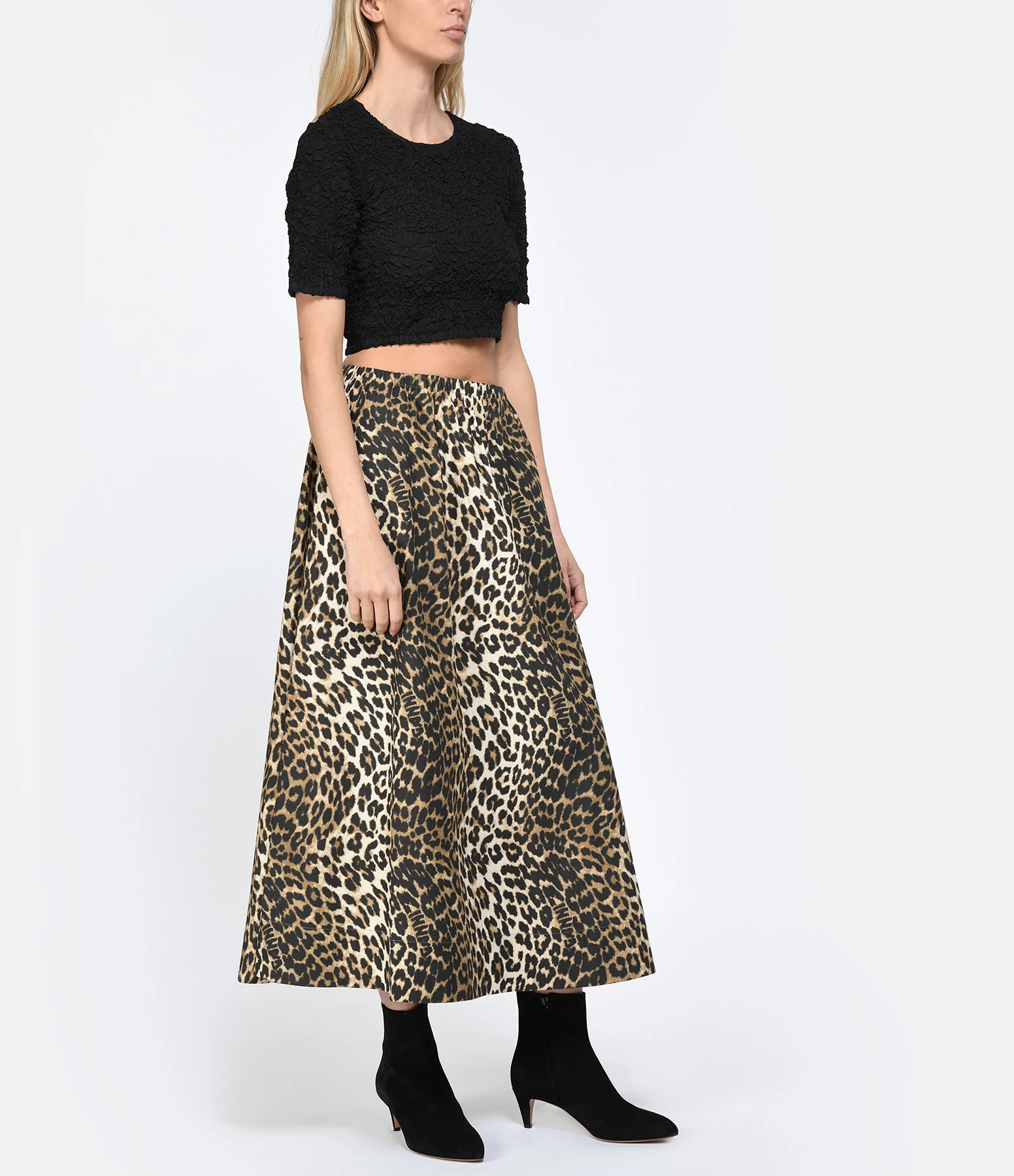 Top court noir texturé. Légèrement décolleté dans le dos. Col rond. Manches courtes. Coupe droite. Base droite.