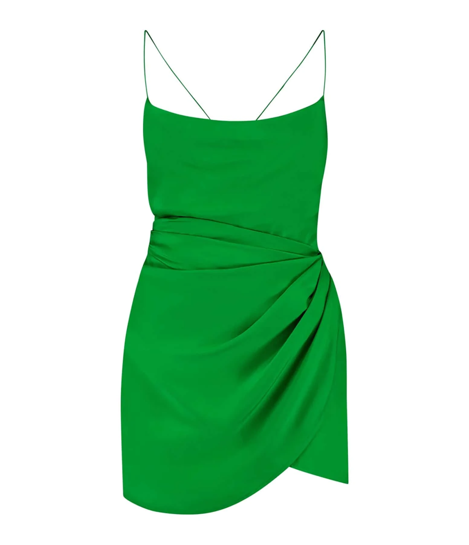 Robe courte en soie verte plissée dos nu. Sans manches. Bretelles. Fermeture zippée invisible latérale. Doublée.